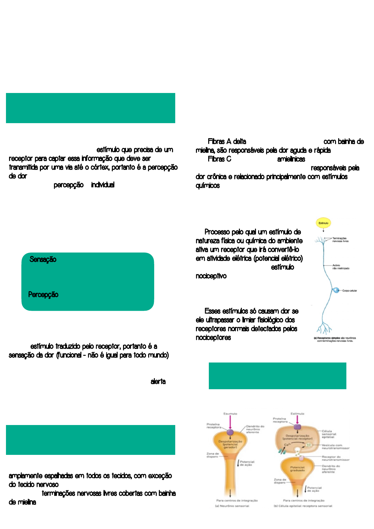 Camila Mariana Castro de Oliveira Medicina Nove de Julho Dor e nocicepção Dor: ➛ É o começo através de um estímulo que precisa de um receptor para captar essa informação que deve ser transmitida por uma via até o córtex, portanto é a percepção de dor ➛ A dor como percepção é individual e depende de diversos fatores para determinar isso como constrição emocional, vivências, sexo, cognição, etc ➛ A dor pode se transformar em sofrimento, como por exemplo, a dor crônica ✓ Percepção é a capacidade de interpretação consciente das sensações Nocicepção: ➛ É o estímulo traduzido pelo receptor, portanto é a sensação da dor (funcional - não é igual para todo mundo) ➛ Nocicepção é o processo pelo qual um estímulo externo ou interno provoca uma reação específica ➛ É importante sentir dor - o corpo te coloca em alerta para cuidar da agressão ou retirar um estímulo ➛ A nocicepção recebe o nome de estímulo nociceptivo, que é o estímulo responsável por gerar a dor ➛ Os receptores da dor, vulgo nociceptores, estão amplamente espalhadas em todos os tecidos, com exceção do tecido nervoso ➛ Existem terminações nervosas livres cobertas com bainha de mielina sendo que essa recoberta com mais bainha de mielina faz com que a sensação de dor chegue mais rápido ao córtex em relação as fibras sem bainha de mielina, que também leva a mesma informação, porém de forma mais lenta ✓ Fibras A delta -> são as fibras recobertas com bainha de mielina, são responsáveis pela dor aguda e rápida ✓ Fibras C -> são as fibras amielinicas (não significa que não tem bainha de mielina nenhuma), são responsáveis pela dor crônica e relacionado principalmente com estímulos químicos Transdução sensorial: ➛ Processo pelo qual um estímulo de natureza física ou química do ambiente ativa um receptor que irá convertê-lo em atividade elétrica (potencial elétrico) ➛ Tudo começa com um estímulo nociceptivo que pode ser: ✓ Mecânico - pode gerar dor ✓ Químico ✓ Térmicos ➛ Esses estímulos só causam dor se ele ultrapassar o limiar fisiológico dos receptores normais detectados pelos nociceptores (tipo morfológico de terminações nervosas livres) Dor e nocicepcao Introdução: Receptor e dor: Sensação - processo pelo qual um estímulo externo ou interno provoca uma reação específica , depende dos receptores e vias Percepção - interpretação consciente das sensações, ocorre no córtex Recebe os estímulos vindos do ambiente -> transforma em sinais neurais -> envia ao SNC Camila Mariana Castro de Oliveira Medicina Nove de Julho Sensibilidade dos receptores: ➛ Depende do estímulo ✓ Térmicos - fibras A delta -> temperaturas acima de 43° e abaixo de 15° ✓ Mecânicos - tração e compressão tecidual ✓ Químicos - citocinas Alteração dos nociceptores: Hiperalgesia: ➛ Sensação aumentada de dor ➛ Diminuição do limiar de dor em uma região decorrente do brotamento no terminal ➛ Resposta aumentada na região que normalmente já sofreu uma lesão ➛ Aumento da sensibilidade dolorosa, estímulos antes inócuos passam a causar dor devido a facilidade de despolarização dos neurônios aferentes nociceptivo polimodais Alodínia: ➛ Estímulos que não deveriam provocar a dor acaba por estimular a sensação ➛ Pode não ter tido uma lesão prévia ➛ Qualquer estímulo que não seja doloroso vai gerar dor Brotamento no terminal: ➛ Aumento do campo receptivo de dor ➛ Aumento de BNDF ➛ Substâncias P ➛ Sensibilização periférica ➛ O nervo trigêmeo e o nervo espinal fazem condução do estímulo, sendo o trigêmeo o estímulo doloroso da face e o espinal o estímulo doloroso para o resto do corpo ➛ Via neoespinotalâmica: ✓ É formada pelo trato espinotala lateral ✓ É a via rápida ➛ Quimiorreceptores: canais iônicos abertos para proteína G - receptores metabotrópicos ➛ Mecanorreceptores: receptor ionotrópico - canais que respondem a estímulo mecânico abrindo os canais diretamente Sensibilização periférica: - Alteração plástica que diminui seu limiar ou alterou o funcionamento da região - Responsável pela hiperalgesia e alodínia Fibras e Condução da dor: Vias da dor - Rápida e Lenta: Camila Mariana Castro de Oliveira Medicina Nove de Julho ✓ Responde principalmente a estímulos mecânicos e térmicos ✓ Formada por fibras A delta ✓ A dor transmitida por essa via é localizada (localização precisa da dor) e aguda ➛ Via paleoespinotalâmica: ✓ É formada pelo trato espinoreticular e retículo talâmica ✓ É a via mais lenta ✓ Responde principal,entre a estímulos químicos ✓ Formada pelas fibras C ✓ A dor é difusa (pouca localização da dor) e crônica ✓ Possui projeções no sistema límbico que contribui para o aspecto afetivo-emocional da dor crônica através da formação reticular, que também conecta com o sono, vigília e o hipotálamo ➛ A modulação da dor lida com o medo, condicionamento, que ambiente social e profissional e com as relações interpessoais (exigências, incertezas, insegurança, desmotivação, condicionamento, expectativas, etc.) ➛ O sistema modulador tem papel determinante nas condições dolorosas crônicas Segmentar: ➛ Acontece a nível medular (corno posterior) ➛ Conhecida como “teoria das comportas - estímulos de pressão e tato competem com o estímulo da dor ✓ Fibra chega no corno posterior da medula ✓ Neurônio intermediário: inibitório do neurônio 2 - ele recebe informações das duas fibras (tipo C e A-beta) ✓ Imagem 1: Fibra tipo C mantém o neurônio intermediário (interneurônio) inibido -> tem percepção de dor ✓ Imagem 2: Fibra A-beta estimula o neurônio inibitório, então ele inibe o neurônio 2 -> tem a redução na sensação da dor Supra-segmentar: ➛ Estas estruturas enviam impulsos descendentes que inibem a transmissão dos sinais de dor dos neurônios do corn