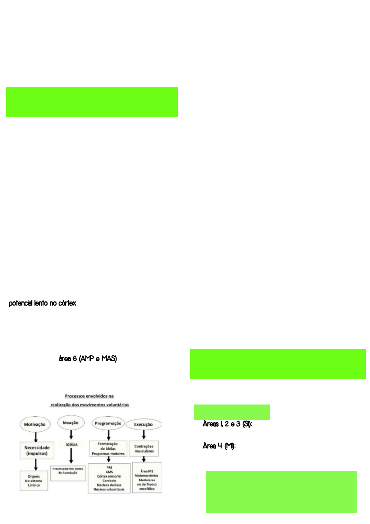 Camila Mariana Castro de Oliveira Medicina Nove de Julho Planejamento motor ➛ Músculos ➛ Elementos neurais: ✓ Medula espinal -> geradores do movimento (estimulam o motoneurônio) ✓ Tronco encefálico -> geradores do movimento (estimulam o motoneurônio) ✓ Córtex motor -> geradores do movimento (estimulam o motoneurônio) ✓ Cerebelo -> controle do movimento (estratégia) ✓ Núcleos da base -> controle do movimento (estratégia) ✓ Córtex cerebral -> planejamento do movimento Movimentos voluntários: ➛ Estudos demonstram que 1,5s antes da execução de um movimento voluntário há um planejamento gerando um potencial lento no córtex ➛ Coordenado pelo córtex motor (vias descendentes) ➛ A motivação e o pensamento são organizados, primeiramente, em várias áreas associativas do córtex cerebral ➛ Transmitidas a área 6 (AMP e MAS) para o desenvolvimento do plano motor Planejamento motor: 1) As informações sensitivas são direcionadas aos respectivos córtex primários (visual, auditivo, somatossensorial, gustativo, olfatório e proprioceptivo - cerebelo) 2) Ocorre a integração sensitiva em áreas associativas secundárias parietais (áreas 5 e 7 de Brodmann) 3) Dessas áreas interativas ocorre a associação com o córtex pré-frontal (áreas terciárias) de onde parte a intenção voluntária do movimento 4) O córtex pré-frontal então se associa com a área 6, com os núcleos da base e com a formação reticular para informar o planejamento da ação. A área 6 informa também a formação reticular e a área 4 motora 5) Os núcleos da base juntamente com o cerebelo enviam eferencias para a área 4 e 6 motoras para o início e sequenciamento dos movimentos 6) A área motora primária (4) inicia a execução dos movimentos que através dos tratos descendentes agem diretamente nos motoneurônios inferiores alfa e gama medulares e estes por sua vez enviam sinais para a contração muscular Áreas envolvidas no planejamento: Áreas de projeção: ➛ Áreas 1, 2 e 3 (S1): área com informações sensoriais primárias (onde chega) ➛ Área 4 (M1): área com informações motoras primárias (onde sai todo o movimento) Planejamento motor Organização geral do siema motor: As áreas de projeção, que são as áreas primárias, recebem ou dão origem a fibras relacionadas diretamente com a sensibilidade e com a motricidade Córtex motor: Camila Mariana Castro de Oliveira Medicina Nove de Julho Áreas de associação: ➛ Essas áreas não se relacionam diretamente com a motricidade ou com a sensibilidade ➛ Áreas secundárias (áreas unimodais) ✓ Estão indiretamente relacionadas com uma determinada modalidade sensorial ou com a motricidade ✓ Conectam-se com as áreas primárias de mesma função ✓ Área 5 e 7: córtex parietal posterior - informações sensitivas ✓ Área 6: AMS e AMP - informações motoras ➛ Áreas terciárias (áreas supramodais): ✓ Não se ocupam do processamento motor ou sensitivo ✓ Possuem atividades psiquicas superiores (memória, processos simbólicos, pensamento abstrato) ✓ Possuem conexões com áreas unimodais ou com outras áreas supramodais ✓ Córtex pré-frontal: de onde se constrói o pensamento, a ideia para iniciar um movimento Córtex motor primário (m1): ➛ Aferência: ✓ Áreas corticais (áreas 6 e 1, 2 e 3) ✓ Tálamo ➛ Eferência (camada V): ✓ Medula ✓ Tronco encefálico (colaterais) Córtex cerebral - área motora primária: ➛ Localização no giro pré-central ➛ Responsável pela motricidade voluntária contralateral ➛ Possui conexões aferentes: ✓ Tálamo - informações oriundas do cerebelo ✓ Área somestésica ✓ Áreas pré-motoras e motora suplementar ➛ Fibras eferentes: ✓ Tratos cortico-espinhal e corticonuclear ➛ Somatotropia: ✓ Homúnculo motor Córtex cerebral - área motora secundária: ➛ Área pré-motora: ✓ Localizada no lobo frontal, adiante da área motora primária ✓ Possui conexões eferentes - Formação reticular: trato retículo-espinhal (via cortico- reticulospinal) -> controle motor da musculatura axial e proximal dos membros (postura) ✓ Possui conexões aferentes - cerebelo e outras áreas de associação ✓ Relacionado com a postura e movimentos guiados por estímulos sensoriais externos ➛ Área motora suplementar: ✓ Localizada na face média do giro frontal superior ✓ Possui conexões com o corpo estriado e com a área motora primária ✓ Responsável pela concepção e planejamento de sequências complexas de movimentos (envolvendo, por exemplo, os dedos) Motricidade: Se baseia através de uma decisão tomada pelo córtex associativo terciário, na qual enviará as informações para as áreas de planejamento motor que ativará os circuitos de controle enviando sinais para a área motores primária, onde as vias motoras descendentes vão enviar as informações para os neurônios motores inferiores até os músculos esqueléticos
