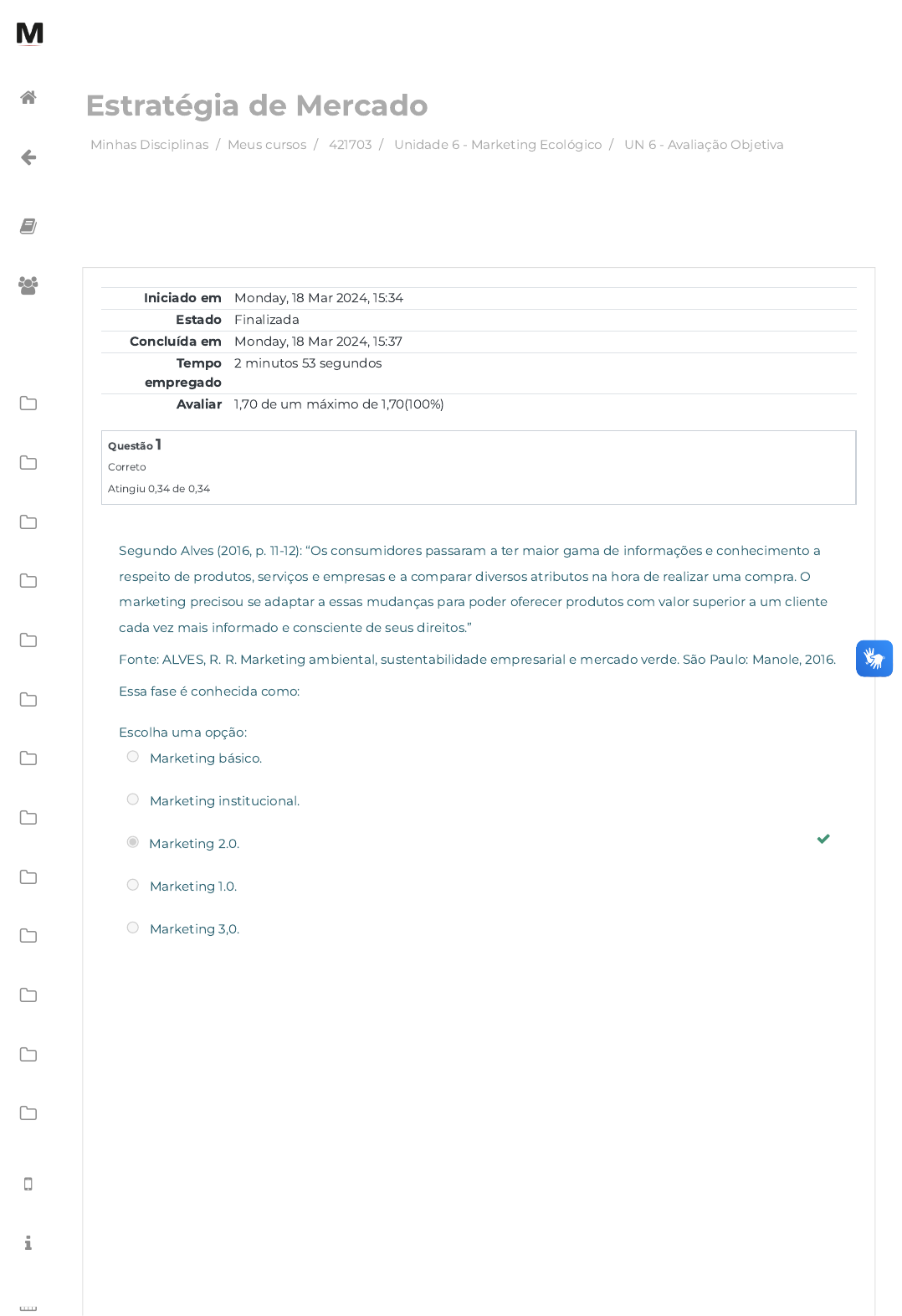 18/03/2024, 15:38 UN 6 - Avaliação Objetiva: Revisão da tentativa https://avap.multivix.edu.br/mod/quiz/review.php?attempt=4792340&cmid=1637041 1/4 Minhas Disciplinas / Meus cursos / 421703 / Unidade 6 - Marketing Ecológico / UN 6 - Avaliação Objetiva Estratégia de Mercado Iniciado em Monday, 18 Mar 2024, 15:34 Estado Finalizada Concluída em Monday, 18 Mar 2024, 15:37 Tempo empregado 2 minutos 53 segundos Avaliar 1,70 de um máximo de 1,70(100%) Questão 1 Correto Atingiu 0,34 de 0,34 Segundo Alves (2016, p. 11-12): “Os consumidores passaram a ter maior gama de informações e conhecimento a respeito de produtos, serviços e empresas e a comparar diversos atributos na hora de realizar uma compra. O marketing precisou se adaptar a essas mudanças para poder oferecer produtos com valor superior a um cliente cada vez mais informado e consciente de seus direitos.” Fonte: ALVES, R. R. Marketing ambiental, sustentabilidade empresarial e mercado verde. São Paulo: Manole, 2016. Essa fase é conhecida como: Escolha uma opção: Marketing básico. Marketing institucional. Marketing 2.0. Marketing 1.0. Marketing 3,0. https://avap.multivix.edu.br/my/ https://avap.multivix.edu.br/course/view.php?id=26334 https://avap.multivix.edu.br/course/view.php?id=26334§ion=7 https://avap.multivix.edu.br/mod/quiz/view.php?id=1637041 https://avap.multivix.edu.br/my/ https://avap.multivix.edu.br/course/view.php?id=26334 https://avap.multivix.edu.br/user/index.php?id=26334 https://avap.multivix.edu.br/course/view.php?id=26334§ion=1 https://avap.multivix.edu.br/course/view.php?id=26334§ion=2 https://avap.multivix.edu.br/course/view.php?id=26334§ion=3 https://avap.multivix.edu.br/course/view.php?id=26334§ion=4 https://avap.multivix.edu.br/course/view.php?id=26334§ion=5 https://avap.multivix.edu.br/course/view.php?id=26334§ion=6 https://avap.multivix.edu.br/course/view.php?id=26334§ion=7 https://avap.multivix.edu.br/course/view.php?id=26334§ion=8 https://avap.multivix.edu.br/course/view.php?id=26334§ion=9 https://avap.multivix.edu.br/course/view.php?id=26334§ion=10 https://avap.multivix.edu.br/course/view.php?id=26334§ion=11 https://avap.multivix.edu.br/course/view.php?id=26334§ion=12 https://avap.multivix.edu.br/course/view.php?id=26334§ion=13 https://avap.multivix.edu.br/hooks/portal/ https://avap.multivix.edu.br/mod/page/view.php?id=1252%2F%22%20target%3D%22_blank https://avap.multivix.edu.br/calendar/view.php/ https://avap.multivix.edu.br/ https://avap.multivix.edu.br/ https://avap.multivix.edu.br/ https://avap.multivix.edu.br/ https://avap.multivix.edu.br/ 18/03/2024, 15:38 UN 6 - Avaliação Objetiva: Revisão da tentativa https://avap.multivix.edu.br/mod/quiz/review.php?attempt=4792340&cmid=1637041 2/4 Questão 2 Correto Atingiu 0,34 de 0,34 Questão 3 Correto Atingiu 0,34 de 0,34 Segundo Kotler et al. (2010 apud ALVES, 2016), esta fase representa uma importante mudança de paradigma em relação aos valores, pois a empresa deixa de tratar as pessoas como simples consumidores e passa a vê̂-las como seres humanos plenos, ou seja, com mente, coração e espírito. Fonte: ALVES, R. R. Marketing ambiental, sustentabilidade empresarial e mercado verde. São Paulo: Manole, 2016. A qual fase se refere o autor? Escolha uma opção: Marketing 2.0. Marketing 1.0. Marketing 3.0. Marketing básico. Marketing institucional. Segundo Alves (2016, p. 34-35), “[…] representa os aspectos intrínsecos do produto que o caracterizam como ambientalmente responsável. Dessa forma, a parte do iceberg que aparece na superfície é um “sinalizador” da qualidade ambiental de um produto e está visível para o consumidor; a parte encoberta pela água representa os custos que a empresa ou a cadeia de agentes precisam assumir para obter a certi�cação e não são visíveis para o consumidor”. Fonte: ALVES, R. R. Marketing ambiental, sustentabilidade empresarial e mercado verde. São Paulo: Manole, 2016. O texto apresentado refere-se ao conceito de: Escolha uma opção: Qualidade ambiental. Qualidade 2.0. Qualidade nacional. Qualidade 1.0. Qualidade regional. https://avap.multivix.edu.br/my/ https://avap.multivix.edu.br/course/view.php?id=26334 https://avap.multivix.edu.br/user/index.php?id=26334 https://avap.multivix.edu.br/course/view.php?id=26334§ion=1 https://avap.multivix.edu.br/course/view.php?id=26334§ion=2 https://avap.multivix.edu.br/course/view.php?id=26334§ion=3 https://avap.multivix.edu.br/course/view.php?id=26334§ion=4 https://avap.multivix.edu.br/course/view.php?id=26334§ion=5 https://avap.multivix.edu.br/course/view.php?id=26334§ion=6 https://avap.multivix.edu.br/course/view.php?id=26334§ion=7 https://avap.multivix.edu.br/course/view.php?id=26334§ion=8 https://avap.multivix.edu.br/course/view.php?id=26334§ion=9 https://avap.multivix.edu.br/course/view.php?id=26334§ion=10 https://avap.multivix.edu.br/course/view.php?id=26334§ion=11 https://avap.multivix.edu.br/course/view.php?id=26334§ion=12 https://avap.multivix.edu.br/course/view.php?id=26334§ion=13 https://avap.multivix.edu.br/hooks/portal/ https://avap.multivix.edu.br/mod/page/view.php?id=1252%2F%22%20target%3D%22_blank https://avap.multivix.edu.br/calendar/view.php/ https://avap.multivix.edu.br/ https://avap.multivix.edu.br/ https://avap.multivix.edu.br/ https://avap.multivix.edu.br/ https://avap.multivix.edu.br/ 18/03/2024, 15:38 UN 6 - Avaliação Objetiva: Revisão da tentativa https://avap.multivix.edu.br/mod/quiz/review.php?attempt=4792340&cmid=1637041 3/4 Questão 4 Correto Atingiu 0,34 de 0,34 Questão 5 Correto Atingiu 0,34 de 0,34 Segundo Alves (2016, p. 30), “[…] mais diretamente relacionados nesse sentido podem ser os grupos ambientalistas, a comunidade próxima à empresa, os fornecedores, os atacadistas, os varejistas, os distribuidores, as transportadoras, o governo, dentre outros. Todos esses atores sociais além do próprio consumidor, estão atentos para que o produto da empresa seja realmente ‘ve
