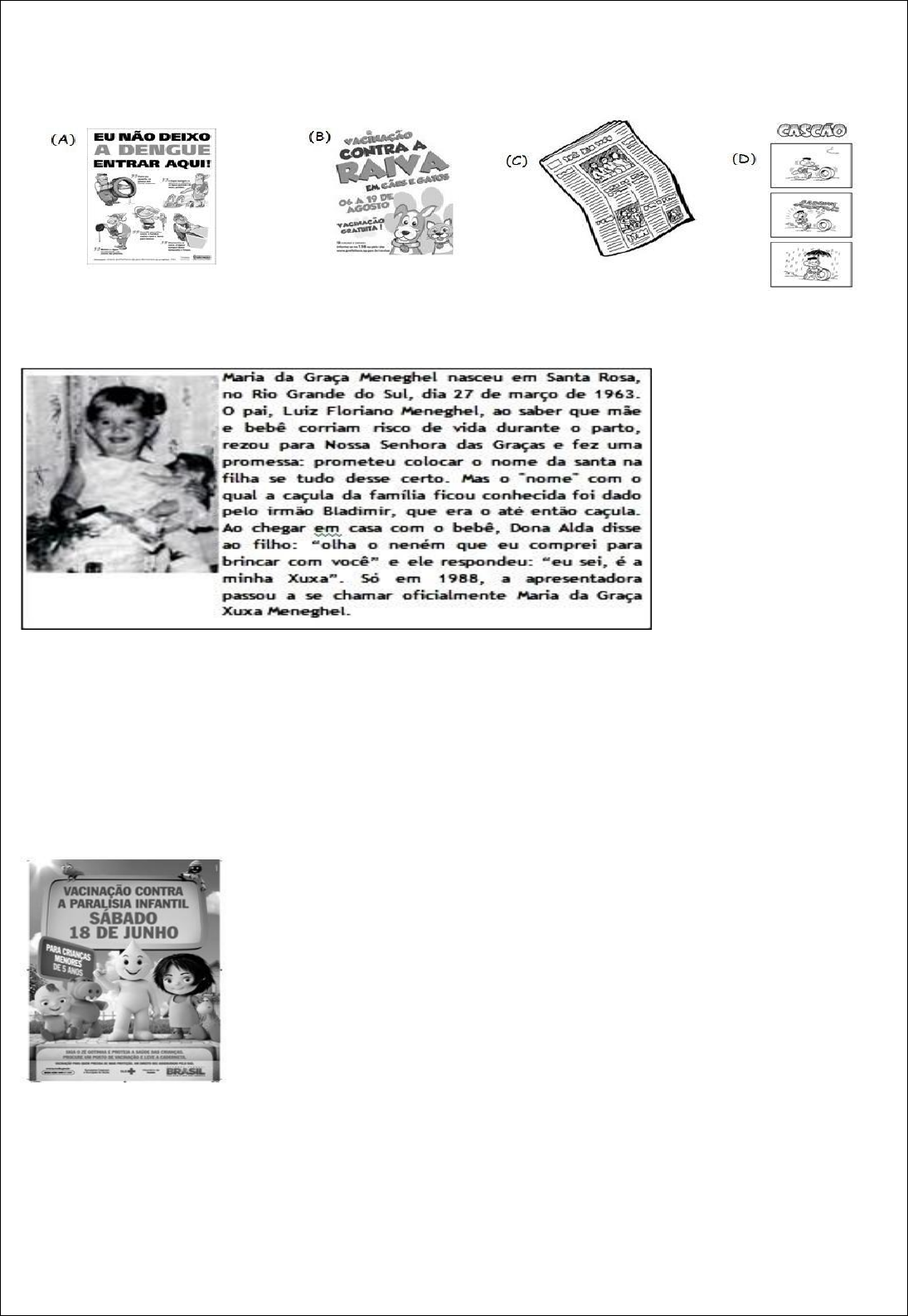 Leia os textos abaixo e assinale a alternativa correta. 1- Marque um X no texto que tem a função de divulgar informações do dia a dia. 2- Leia o texto e responda: Esse texto é? (A) Uma notícia. (B) Uma bibliografia. (C) Uma reportagem. (D) Um poema. 3- Leia o texto e responda. Esse texto serve para: (A) Divertir as crianças com o Zé gotinha. (B) Ensinar jogos para as crianças. (C) Informar sobre a vacinação das crianças. (D) Informar sobre a família do Zé gotinha 4- De acordo com a leitura do texto, responda: O assunto do texto é: (A) Cuidar dos animais domésticos. (B) Cuidar dos animais selvagens. (C) Cuidar do Meio Ambiente. (D) Cuidar do papel. 5- Marque a alternativa onde os nomes das figuras começam com a mesma sílaba. (A) (B) (C) (D) 6- Leia o texto abaixo. Maria ganhou uma flor De seu amigo João. A flor era tão bela Que ganhou seu coração. Tudo Sala de Aula Esse texto é: (A) uma notícia. (B) uma fábula. (C) um poema. (D) um conto. 7- Leia o texto abaixo. I de Irmão Bronca, brinquedo, briga para tudo serve irmão, mais parceria no riso, companhia na aflição. O mais velho sempre é chato e dá uma de mandão, o menor conta os malfeitos (verdadeira danação!) mas depois chora com a gente, na hora da correção. Irmão, irmão de verdade, é o mano mais amigo é o amigo mais irmão. Disponível em: <http://adimilsonmatheus.blogspot.com/2009/05/i-de-irmao.html>. Acesso em: 02 de Abril 2020 Qual é o assunto desse texto? (A) Amigos de verdade. (B) Características de irmão. (C) Mano mais antigo. (D) verdadeira danação 8- Observe a cena abaixo: Qual é a frase que conta o que está acontecendo nessa cena? (A) O barco do menino está caindo na cachoeira. (B) O barco velho e furado está afundando. (C) O menino chegou em casa e foi logo estudar. (D) O menino está pescando de barco no rio. 9- Na cena abaixo, a famosa personagem Emília está de bruços e desenhando. http://peregrinacultural.files.wordpress.com/2009/05/desenhando-emilia-a-noite.jpg A expressão de seu rosto revela que ela: (A) levou um susto. (B) reconheceu um amigo. (C) ficou cansada. (D) quis se levantar. 10- Leia a lista dos responsáveis pela caixa de novidade da semana: 1- AUGUSTO 2- DAVI 3- MÁRLIA 4- 5- RITA Segunda a ordem alfabética, o nome que falta na lista é: ( A ) Bruno ( B ) Poliana ( C ) Talita ( D ) Lucas http://peregrinacultural.files.wordpress.com/2009/05/desenhando-emilia-a-noite.jpg 1) Observe a sequência numérica abaixo e marque um X no número que está faltando: 20 40 ? 80 100 a) ( ) 50 b) ( ) 70 c) ( ) 60 d) ( ) 40 2) Marque um X no nome do instrumento que é usado para medir a massa: a) ( ) Régua b) ( ) Litro c) ( ) Termômetro d) ( ) Balança 3) Maria Luíza encheu 4 copos de 250 ml cada. Quantos litros ela encheu no total? a) ( ) 2 litros b) ( ) 1 litro e) ( ) 3 litros f) ( ) 5 litros 4) Miguel e Pedro encheram 2 pacotes contendo 6 balas cada um. Marque um X no total de balas que tinha dentro de todos os pacotes: a) ( ) 12 balas b) ( ) 23 balas g) ( ) 16 balas h) ( ) 18 balas 5) Uma professora resolveu pesar alguns brinquedos da turma para descobrir algumas informações sobre eles. Observe o gráfico abaixo e responda: • Quantos quilos pesam todos os brinquedos juntos? a) ( ) 25 quilos b) ( ) 26 quilos c) ( ) 27 quilos d) ( ) 28 quilos 6- Rogério montou uma pipa, usando peças com figuras geométricas, como mostra o desenho abaixo: Nessa pipa, qual é a peça que tem a forma de triângulo? ( A )Peça 1. ( B ) Peça 2. ( C ) Peça 3. ( D) Peça 4. 7- A turma do 3º ano da escola resolveu fazer uma torta para comemorar o dia dos professores. Entre os produtos utilizados para fazer a torta, o ingrediente vendido em litro é: (A) (B) (C) (D) 8- Ana fez 365 doces para uma festa. Outra forma de representar o número de doces que Ana fez é: ( A ) 3+ 6 + 5 ( B ) 30+ 60+ 5 ( C ) 300 + 60 + 5 ( D ) 300 + 6 + 5 9- Caio estava de férias. Suas férias foram de 6 semanas. Quantos dias Caio ficou de férias? ( A ) 6 ( B ) 7 ( C ) 30 ( D ) 42 11- Leia o texto abaixo: Cavalo de três pés Animal assombroso que aparece nas estradas desertas a noite, correndo, dando coices e voando. Não tem cabeça mas possui asas. Quem pisar em seus rastros será imensamente infeliz. Quantas palavras têm o texto? ( A ) 30 ( B ) 32 ( C ) 31 ( D ) 33