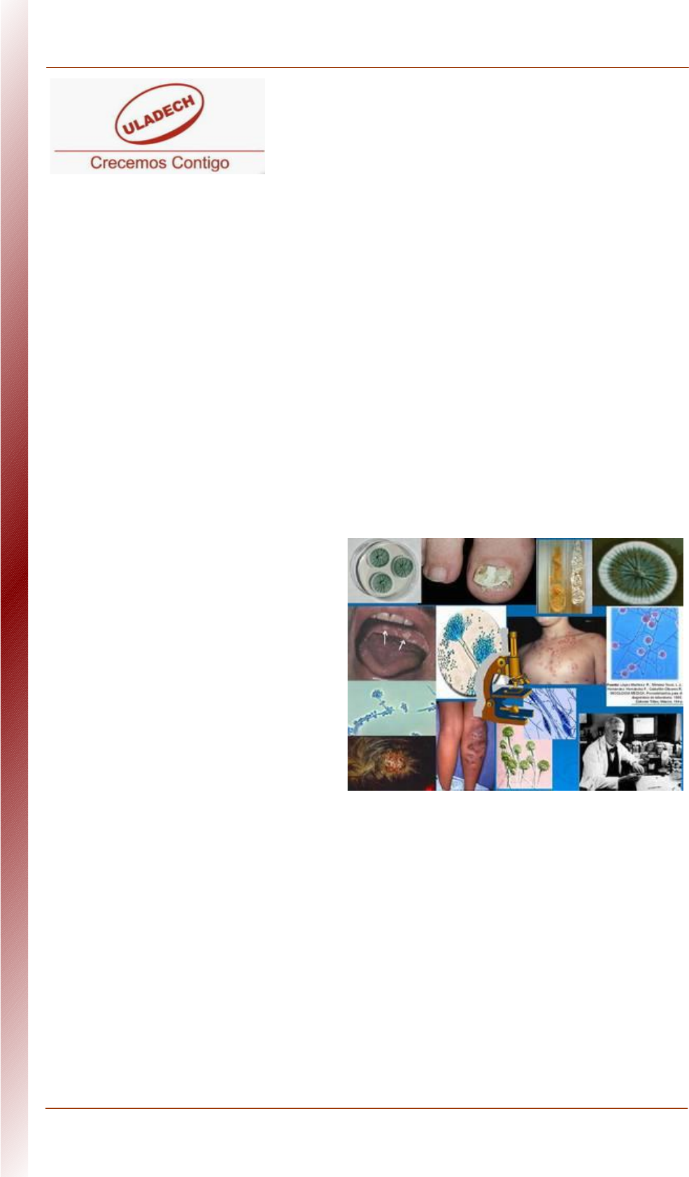 UNIVERSIDAD LOS ANGELES DE CHIMBOTE 1 FACULTAD DE CIENCIAS DE LA SALUD MBLGO. JOSE LUIS GUTIERREZ APONTE MBLGO. LUIS ALBERTO SANCHEZ ANGULO CURSO : MICROBIOLOGIA Y PARASITOLOGIA UNIDAD : SEGUNDA TEMAS : VIROLOGIA Y MICOLOGIA MEDICA Micología: definición, objeto de estudio, reseña histórica y vinculación con otras ciencias. Los hongos: características, clasificación, nutrición y reproducción. GENERALIDADES DE LA MICOLOGÍA Los hongos son organismos que presentan diferencias estructurales y morfológicas con las bacterias y con las células animales y vegetales. La micología es la ciencia que se encarga de su estudio, en tanto que la micología médica describe los hongos patógenos para el ser humano como productores de micosis. En esta lectura se estudiarán las características morfológicas y estructurales de los hongos, los aspectos más importantes de su metabolismo y los mecanismos de reproducción, que son fundamentales para establecer la clasificación de estos organismos. El estudio de los hongos comienza antes que el de las bacterias. En 1677, Hooke construye unas lentes y estudia las manchas amarillas de las hojas de una rosa, donde observa que estaban constituidas por organismos filamentosos, los cuales describe en detalle e ilustra con dibujos. En 1729, Micheli describe el género Aspergillus entre otros hongos. En la primera mitad del siglo XIX se realizan progresos en el estudio de los hongos y no es hasta entonces que aquellos parásitos para el hombre comienzan a atraer la atención. En la actualidad existen aproximadamente de 50 000 a 100 000 especies “aceptadas” de hongos. De las mismas, alrededor de 200 son patógenas a los animales y al hombre bajo ciertas circunstancias; de estas, una pequeña porción puede causar enfermedad en el humano. Los hongos son microorganismos eucarióticos, aerobios, no fotosintéticos, inmóviles; tienen una pared celular que constituye el 90 % del peso seco del hongo, la cual está constituida de polisacáridos como: quitina, celulosa, glucanas y mananas, entre otros; esto constituye entre el 70 al 80 % y el 10 al 20 % lo forman proteínas y glicoproteínas las cuales son antigénicas y quizá expliquen la reacción mediada por células que se produce frente a los antígenos de Candida (candidina) y dermatófitos (tricofitina). Esta pared le imparte al hongo rigidez, actúa como barrera osmótica, determina la forma del microorganismo, es importante en la taxonomía y propiedades antigénicas. UNIVERSIDAD LOS ANGELES DE CHIMBOTE 2 FACULTAD DE CIENCIAS DE LA SALUD MBLGO. JOSE LUIS GUTIERREZ APONTE MBLGO. LUIS ALBERTO SANCHEZ ANGULO Además, los hongos sintetizan lisina, por biosíntesis del ácido L-aminolipídico; tienen microtúbulos compuestos de la proteína tubulina, ergosterol en sus membranas celulares (sitio donde actúan algunos fungistáticos como los polienos e imidazoles bloqueando su formación), centríolo, mitocondria, ribosoma 80 S, núcleo rodeado de membrana, retículo endoplásmico y mitocondrias. Son heterotróficos y la mayoría obtiene sustancias orgánicas preformadas del medio ambiente. Los hongos vierten enzimas hidrolíticas en sus alrededores, las cuales degradan el sustrato en pequeñas subunidades y de esta forma es que ellos lo absorben. Los patógenos humanos poseen las enzimas necesarias para obtener nutrientes directamente del hospedero. El material alimenticio de reserva es el glucógeno. Solamente algunos hongos poseen cápsula, por ejemplo, el Cryptococcus neoformans, compuesta de polisacárido, es antigénica y antifagocítica. Por lo general, los hongos patógenos no producen toxinas, provocan enfermedades crónicas con lesiones de tipo granulomatosas y son resistentes a los tratamientos. Las micosis superficiales y cutáneas pueden ser crónicas, pero rara vez afectan la salud general, mientras que las profundas sí la afectan y a veces son mortales. Los hongos son reconocidos en el laboratorio por su morfología macroscópica y microscópica, y de acuerdo con ello se dividen en dos grupos: o Hongos filamentosos: la hifa o filamento es el elemento primario de estos hongos; son estructuras cilíndricas parecidas a tubos; pueden tener tabiques o septos en número variable o no tenerlos y ser aseptadas o cenocíticas; poseen poros pequeños. Según la forma que adopten pueden ser: vesiculosas, nodulares, pectinadas, en raqueta, en candelabro fávico y otras. Al conjunto de hifas unidas y entrelazadas se les denomina micelio, el cual puede ser aéreo o reproductivo, es el que crece en la superficie del medio de cultivo y donde podemos encontrar las conidias o esporas; el micelio vegetativo o nutritivo es aquel que se introduce en el medio de cultivo para absorber los nutrientes. En el micelio aéreo se desarrolla la colonia del hongo, que de acuerdo con el género o especie a que pertenezcan van a tener diferentes formas y colores. Así pueden ser: algodonosas, pulverulentas, cerebriformes, crateriformes, etc.; y los pigmentos pueden ser: rojo, carmelita, violeta, verde, amarillo y otros. o Hongos levaduriformes: forman colonias suaves, cremosas, con pigmentos variados según el género y la especie; pueden ser: blancas, crema, color café, negras; van a estar constituidas por células redondas, ovales o gemantes denominadas blastosporas o blastoconidias; en algunas levaduras estas células quedan unidas y se alargan formando una especie de filamento denominado pseudomicelio. La reproducción es asexual por gemación. Dimorfos: son aquellos que crecen tanto en la forma filamentosa como en la levaduriforme, dependiendo esto, entre otros factores, de la temperatura a que sean sometidos (25 o 37 ºC) y de los nutrientes. Los hongos se reproducen sexual y asexualmente. Desde el punto de vista médico la reproducción asexual es la más importante, pues la mayoría de los hongos patógenos para el hombre sólo se reproducen de esta forma. A pesar de que ya se ha encontrado en algunos la reproduc