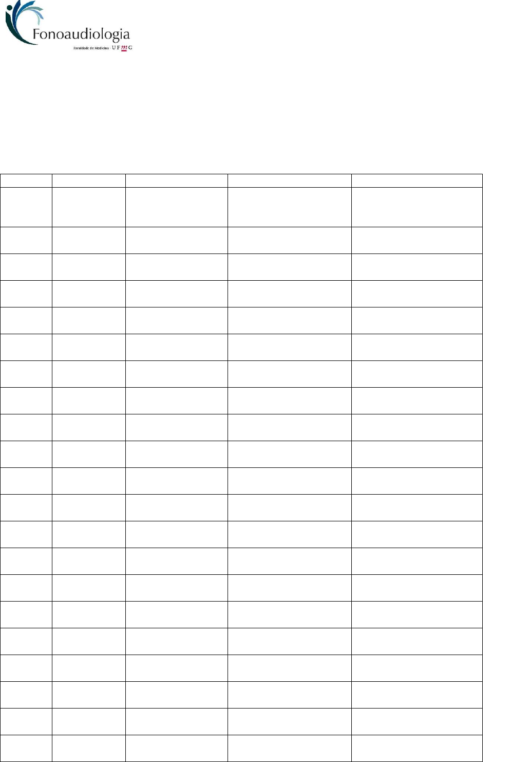 1 Serviço de Fonoaudiologia - Hospital das Clínicas - UFMG ABFW - Pragmática Anexo 1 Data da Avaliação: ____/____/ _____ Nome: ____________________________________ __________________________________ Data de Nascimento: ____ / ______/_______ Idade: ______ a _______ Atos Comunicativos N Meio (VE - VO - G) Iniciativa Criança (C) Adulto (A) Função Observações e Comentários 2 Serviço de Fonoaudiologia - Hospital das Clínicas - UFMG ABFW - Pragmática Anexo 2 Data da Avaliação: ____/ ____/ _____ Nome: ______________________________________________________________________ Data de Nascimento: _____ / _____/ ______ Idade: ___ a ___ m Atos Comunicativos Total: 100/2 0 Por minuto: 10/2 20 %: Meio e Função Comunicativa Função Meio N % Função Meio N % Função Meio N % VE VE VE PO VO PS VO PI VO G G G VE VE VE RO VO C VO N VO G G G VE VE VE EX VO NF VO XP VO G G G VE VE VE EP VO PA VO PC VO G G G VE VE VE PR VO E VO AR VO G G G VE VE VE PE VO JC VO J VO G G G VE VE VE NA VO RE VO TOTAL VO G G G
