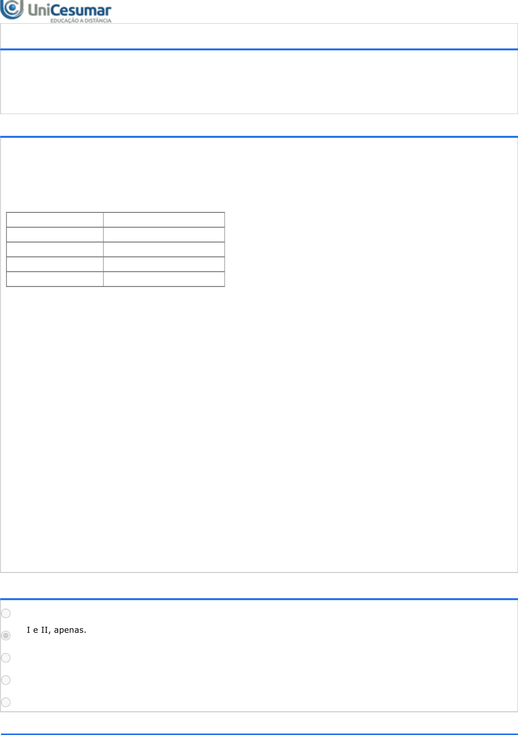 18/03/2024, 12:25 Unicesumar - Ensino a Distância about:blank 1/11 ATIVIDADE 2 - CCONT - ESTRUTURAS DAS DEMONSTRAÇÕES CONTÁBEIS - 51/2024 Período:26/02/2024 08:00 a 17/03/2024 23:59 (Horário de Brasília) Status:ENCERRADO Nota máxima:0,50 Gabarito:Gabarito será liberado no dia 18/03/2024 00:00 (Horário de Brasília) Nota obtida:0,25 1ª QUESTÃO O contador da empresa Balancê Ind. e Com. Ltda. (fictícia), precisa elaborar uma prestação de contas aos donos da organização referente ao exercício social de 31/12/20X1. Desse modo, o contador precisa analisar as informações do quadro abaixo: Quadro 1: Saldos contábeis dos grupos patrimoniais da empresa em 31/12/20X1. Grupos Contábeis Saldo em 31/12/20x1 (R$) Ativo Circulante R$ 250.000,00 Ativo Não CirculanteR$ 950.000,00 Passivo Circulante R$ 300.000,00 Patrimônio Líquido R$ 700.000,00 Fonte: Elaborada pelo Professor (2024). Os valores acima foram apurados de acordo com as Normas Brasileiras de Contabilidade. Porém, o valor do Passivo Não Circulante da Balancê Ind. e Com. Ltda. precisa ser calculado conforme teoria e prática contábil sobre a Estrutura das Demonstrações Contábeis. Conselho Federal de Contabilidade (CFC). NBC TG 26 (R5) – Apresentação das Demonstrações Contábeis. Ano 2017. Disponível em: < https://www.informanet.com.br/Prodinfo/gcon/nbc/NBCTG26(R5).pdf >. Acesso em: 22 jan. 2024. SANTOS, T.G.S. Estrutura das Demonstrações Contábeis. Maringá-Pr.: Unicesumar, 2021. Com base nos dados acima, analise as afirmativas a seguir: I. Em 31/12/20X1, o valor do Ativo total é igual a soma do passivo circulante, passivo não circulante e patrimonio líquido, o qual é de R$ 1.200.000,00. II. O valor do Passivo Não Circulante da empresa corresponde ao valor de R$ 200.000,00. III. O valor total do Ativo Circulante é maior que o valor do Ativo Não Circulante. IV. O valor total do Passivo significa o valor dos recebíveis da empresa no final do exercício social. É correto o que se afirma em: ALTERNATIVAS I, apenas. I e II, apenas. I, II e III, apenas. II, III e IV, apenas. I, II, III e IV. 2ª QUESTÃO WINDOWS Realce 18/03/2024, 12:25 Unicesumar - Ensino a Distância about:blank 2/11 Do ponto da legislação societária o Passivo é composto por todos os grupos de contas representados no lado direito do Balanço Patrimonial. O Passivo, do ponto de vista da Lei n. 6.404/76, é composto pelas obrigações e pelo Patrimônio Líquido. MONTOTO, Eugenio. Contabilidade geral e avançada. 5 ed. São Paulo: Saraiva Educação, 2018. Considerando o exposto, avalie as asserções a seguir e a relação proposta entre elas. I. Passivo é uma obrigação presente da empresa, derivada de eventos já ocorridos, cuja liquidação se espera que resulte em saída de recursos da organização. PORQUE II. O Passivo apresenta as obrigações da empresa, que são as dívidas com terceiros e também a parte do Patrimônio Líquido representada pelos bens e a participação dos sócios na entidade. A respeito dessas asserções, assinale a opção correta. ALTERNATIVAS As asserções I e II são proposições verdadeiras, e a II é uma justificativa correta da I. As asserções I e II são proposições verdadeiras, mas a II não é uma justificativa correta da I. A asserção I é uma proposição verdadeira, e a II é uma proposição falsa. A asserção I é uma proposição falsa, e a II é uma proposição verdadeira. As asserções I e II são proposições falsas. 3ª QUESTÃO WINDOWS Realce 18/03/2024, 12:25 Unicesumar - Ensino a Distância about:blank 3/11 A estrutura da Demonstração do Valor Adicionado (DVA), é apresentada na NBC TG 09 – Demonstração do Valor Adicionado. Nos apêndices da norma, inclusive constam exemplos e/ou modelos de DVAs. Dalton, é o contador da Adiciona Ltda (fictícia), uma organização que está elaborando a DVA referente ao período de 01/01/20x1 a 31/12/20x1 (Quadro 01): Quadro 01: DVA da Adiciona Ltda Fonte: Elaborado pelo Professor (2023). Menciona-se que Dalton ainda não preencheu na DVA o Valor Adicionado Total a Distribuir e o Distribuição do Valor Adicionado. Conselho Federal de Contabilidade (CFC). NBC TG 09 – Demonstração do Valor Adicionado. Ano: 2008. Disponível em: https://www1.cfc.org.br/sisweb/SRE/docs/RES_1138.pdf Acesso em: 17 fev. 2023 Assim, com base nesta informação, avalie as asserções abaixo: I. Em 20x0, o montante relativo ao valor adicionado total foi inferior a R$ 17.000,00 e no ano de 20x1, o montante relativo ao valor adicionado foi inferior a R$ 40.000,00. PORQUE 18/03/2024, 12:25 Unicesumar - Ensino a Distância about:blank 4/11 II. Tanto no exercício social de 20x1, quanto no exercício social de 20x0, na DVA da Adiciona Ltda, o montante relativo ao Valor Adicionado Total a Distribuir e o montante da Distribuição do Valor Adicionado são exatamente iguais. A respeito dessas asserções, assinale a opção correta. ALTERNATIVAS As asserções I e II são proposições verdadeiras e a II é uma justificativa correta da I. As asserções I e II são proposições verdadeiras, mas a II não é uma justificativa correta da I. A asserção I é uma proposição verdadeira e a II é uma proposição falsa. A asserção I é uma proposição falsa e a II é uma proposição verdadeira. As asserções I e II são proposições falsas. 4ª QUESTÃO WINDOWS Realce 18/03/2024, 12:25 Unicesumar - Ensino a Distância about:blank 5/11 Conforme Gelbcke et al. (2018, p. 527), na Demonstração do Resultado Abrangente (DRA) são evidenciadas as mutações do patrimônio líquido que não representam receitas e despesas realizadas são denominadas “Outros Resultados Abrangentes” (ORA) e incluem alterações que poderão afetar o resultado de períodos futuros ou, em alguns casos, nem mesmo circularem pelo resultado. O contador da Cia. Complicada S.A. (fictícia) está elaborando a DRA referente ao período de 01/01/20x1 a 31/12/20x1. No Quadro 1 es
