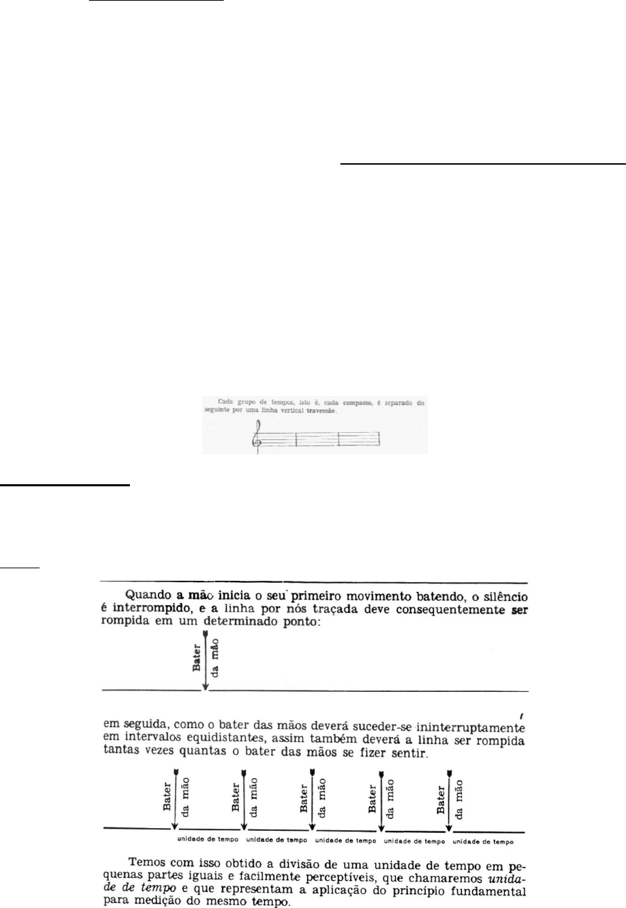 AULA 02 – TEORIA MUSICAL – CEMUAL Conteúdo programático: Compasso; fórmula de compasso; compasso simples; tempo forte e tempo fraco; compasso composto. Contextualização: De acordo com Priolli (1979), as figuras ou valores não têm duração determinada, ou seja, não têm valor fixo. Diante disso, para que as figuras tenham um valor determinado na duração do som esse valor é previamente convencionado, e é a esse espaço de duração que se dá o nome de tempo. # Tempo: O termo "tempo" na música refere-se a uma unidade básica de duração e pulsação. O tempo é fundamental para organizar a música em segmentos regulares e criar uma sensação de ritmo. Os tempos são agrupados em porções iguais, de dois em dois, três em três ou de quatro em quatro, constituindo unidades métricas que recebem o nome de “compasso.” Cada compasso contém um número específico de pulsos, e a organização dos acentos rítmicos dentro desses compassos contribui para a sensação rítmica da música. #1 COMPASSO “Ele indica como as notas estão organizadas em termos de pulsações e ritmo.” “É um agrupamento de tempos cuja divisão é feita por um travessão’”. Unidade de tempo De acordo com Pozzoli, é o espaço de tempo que se passa entre dois limites pré-estabelecidos e sensíveis ao ouvido. BIZÚ: “É a figura que vale um tempo no compasso”. Cada compasso é dividido em unidades de tempo, vale também lembrar que é importante sabermos quantos tempos “caberão” em cada compasso. Para isso, é importante destacar que a duração de tempo que ocupa todo o compasso é chamada de unidade de compasso. Unidade de compasso “É a figura que preenche todos os tempos do compasso”. “É a figura que junta nela a quantidade de tempos que deveria ter no compasso inteiro (também é possível juntar duas figuras para representar o valor do compasso inteiro)” Observe: Fórmula de compasso A "fórmula de compasso" é uma notação numérica que indica como as pulsações ou batidas são organizadas em cada compasso de uma composição musical. Ela é representada por uma fração que aparece no início da partitura. A fórmula de compasso fornece duas informações importantes: 1. Numerador: O numerador indica quantas pulsações existem em cada compasso. Por exemplo, em uma fórmula de compasso 4/4, o numerador é 4, indicando que há quatro pulsos por compasso. 2. Denominador: O denominador indica a unidade de tempo ou qual figura de nota recebe uma pulsação. Por exemplo, no caso de 4/4, o denominador é 4, indicando que a unidade de tempo é a semínima (quarto de nota). Portanto, na música acima temos a unidade de tempo 4, que representa quatro tempos por cada compasso; em seguida temos a unidade de compasso 4, esta que indica a figura que preenche todos os tempos do compasso, que no caso é a semibreve, pois ela possui 4 tempos. Unidade de TEMPO Unidade de COMPASSO Veja mais: Continuando: Os compassos de dois tempos são chamados de binários; Os de três tempos são chamados de ternários; Os de quatro tempos são chamados de quaternários. Compassos simples “São aqueles em que a unidade de tempo é uma nota simples” “São aqueles cuja unidade de tempo é representada por uma figura divisível por 2.” Nota simples: é aquela nota que não tem ponto de aumento1. Uma "nota simples" na música refere-se a uma única unidade de som com uma duração específica. Compassos simples mais usados 1 O "ponto de aumento" na música é um símbolo que acrescenta metade do valor da nota à qual está ligado. Este ponto é colocado ao lado da nota e aumenta a sua duração. Como diferenciar os tipos de compassos? Para distinguir a natureza do compasso é necessário diferenciar os tempos fortes dos tempos fracos. • Tempo Forte (ou Batida Forte): É a pulsação mais acentuada em um compasso. Em muitos casos, o primeiro tempo de um compasso recebe uma ênfase especial, tornando-se o tempo forte. • Tempos Fracos (ou Batidas Fracas): São as pulsações menos acentuadas em um compasso. Os tempos fracos geralmente ocorrem entre os tempos fortes. Para indicar a diferenciação desses tempos utiliza-se um sinal visível, chamado de travessão ou barra de divisão. EXERCÍCIOS 1. O que é um compasso na música? 2. Qual é a função principal do compasso em uma peça musical? 3. O que representa o numerador em uma fórmula de compasso? 4. O que o denominador indica em uma fórmula de compasso? 5. O que caracteriza um compasso simples? 6. Dê um exemplo de fórmula de compasso simples. 7. O que significa "tempo forte" em termos musicais? 8. O que caracteriza um compasso binário? 9. O que caracteriza um compasso ternário? 10. O que caracteriza um compasso quaternário? 11. O que são: unidade de tempo e unidade de compasso? 12. O que é “tempo” na música?