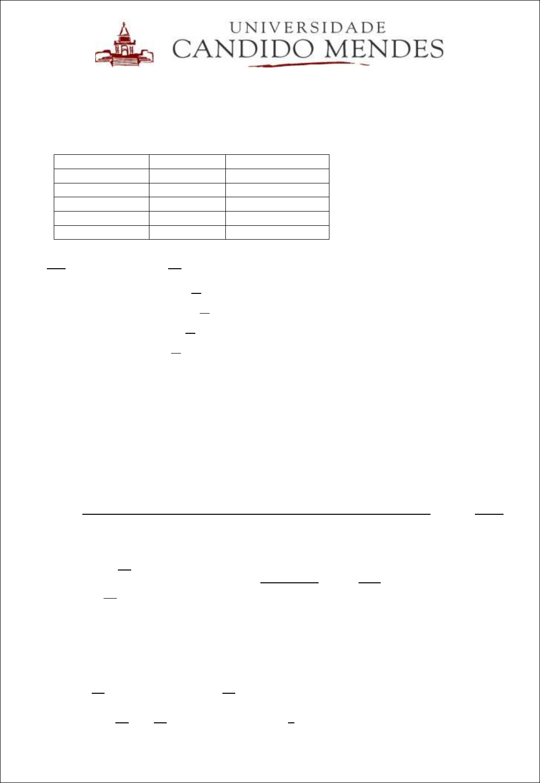 MÉTODOS QUANTITATIVOS APLICADOS À GESTÃO II PROF.: CARLOS MAGNO F. SILVA EXERCÍCIOS DE REVISÃO – P1 1. A tabela abaixo é o resultado de uma pesquisa feita em uma escola de ensino médio do Rio de Janeiro, onde foram ouvidas 40 pessoas. Complete-a com as Taxas Percentuais correspondentes: Time Preferido Frequência Taxa Percentual Vasco 10 0,25 = 25% Flamengo 12 0,30 = 30% Fluminense 8 0,20 = 20% Botafogo 6 0,15 = 15% Outros 4 0,10 = 10% Resolução: 𝑓𝑟𝑖 = 𝑓𝑖 ∑ 𝑓𝑖 → 𝑓𝑟𝑖𝑉𝑎𝑠𝑐𝑜 = 10 40 → 𝑓𝑟𝑖𝑉𝑎𝑠𝑐𝑜 = 0,25 𝑓𝑟𝑖𝐹𝑙𝑎𝑚𝑒𝑛𝑔𝑜 = 12 40 → 𝑓𝑟𝑖𝐹𝑙𝑎𝑚𝑒𝑛𝑔𝑜 = 0,30 𝑓𝑟𝑖𝐹𝑙𝑢𝑚𝑖𝑛𝑒𝑛𝑠𝑒 = 8 40 → 𝑓𝑟𝑖𝐹𝑙𝑢𝑚𝑖𝑛𝑒𝑛𝑠𝑒 = 0,20 𝑓𝑟𝑖𝐵𝑜𝑡𝑎𝑓𝑜𝑔𝑜 = 6 40 → 𝑓𝑟𝑖𝐵𝑜𝑡𝑎𝑓𝑜𝑔𝑜 = 0,15 𝑓𝑟𝑖𝑂𝑢𝑡𝑟𝑜𝑠 = 4 40 → 𝑓𝑟𝑖𝑂𝑢𝑡𝑟𝑜𝑠 = 0,10 2. As taxas de juros recebidas por 10 ações durante um certo período foram (medidas em porcentagem) 2,59; 2,64; 2,60; 2,62; 2,57; 2,55; 2,61; 2,50; 2,63; 2,64. Considerando este conjunto de dados, a taxa média de juros, a maior evidência entre elas e aquela que divide os dados ordenados em duas partes iguais são, respectivamente: a) 2,60 – 2,64 – 2,60 d) 2,60 – 2,61 – 2,64 b) 2,60 – 2,64 – 2,62 e) 2,60 – 2,60 – 2,60 c) 2,60 – 2,60 – 2,64 Resolução: A = { 2,50 ; 2,55 ; 2,57 ; 2,59 ; 2,60 ; 2,61 ; 2,62 ; 2,63 ; 2,64 ; 2,64 } �̅� = 2,50 + 2,55 + 2,57 + 2,59 + 2,60 + 2,61 + 2,62 + 2,63 + 2,64 + 2,64 10 → �̅� = 25,95 10 → �̅� = 2,595 → �̅� = 2,60 �̂� = 2,64 𝑃(𝑋1) = 10 2 = 5 → 𝑋1 = 2,60 𝑃(2) = 10 2 + 1 = 6 → 𝑋2 = 2,61 } �̃� = 2,60 + 2,61 2 → �̃� = 5,21 2 → �̃� = 2,605 → �̃� = 2,60 Logo, a resposta é 2,60 – 2,64 – 2,60. 3. Três lâmpadas são escolhidas aleatoriamente dentre 15 lâmpadas, das quais 5 são defeituosas. Qual a probabilidade de que nenhuma seja defeituosa; Resolução: 𝑑𝑒𝑓𝑒𝑖𝑡𝑜 = 5 15 → 𝑝 𝑠𝑒𝑚 𝑑𝑒𝑓𝑒𝑖𝑡𝑜 = 10 15 → 𝑞 𝑛 = 3 𝑃(𝑋=0) =? 𝑃(𝑋=0) = ( 3 0 ) ∙ ( 5 15 ) 0 ∙ ( 10 15 ) 3−0 → 𝑃(𝑋=0) = 1 ∙ 1 ∙ ( 2 3 ) 3 𝑃(𝑋=0) = 0,2963 → 𝑃(𝑋=0) = 29,63% 4. Um lote é formado de 10 artigos bons, 4 com defeitos menores e 2 com defeitos graves. Dois artigos são escolhidos ao acaso. Determine a probabilidade de que ambos tenham defeitos graves. Resolução: bons = 10 d.menores = 4 d.graves = 2 n = 16 2 16 ∙ 1 15 = 2 240 = 0,008333 = 0,83% 1º 2º 5. Uma média de três ônibus chega a um terminal rodoviário por minuto. A probabilidade de chegarem dois ônibus nos próximos dois minutos é de: a) 4,50% b) 5,40% c) 80,08% d) 98,25% e) 22,41% Resolução: 𝜆 = 3 ô𝑛𝑖𝑏𝑢𝑠/𝑚𝑖𝑛𝑢𝑡𝑜 𝜆 = 6 ô𝑛𝑖𝑏𝑢𝑠/2𝑚𝑖𝑛𝑢𝑡𝑜𝑠 𝑃(𝑋≥2) =? 𝑃(𝑋) = 𝑒−𝜆 ∙ 𝜆𝑋 𝑋! 𝑃(𝑋≥2) = 1 − (𝑃(𝑋=0) + 𝑃(𝑋=1)) 𝑃(𝑋≥2) = 1 − ( 𝑒−6 ∙ 60 0! + 𝑒−6 ∙ 61 1! ) → 𝑃(𝑋≥2) = 1 − (0,0026 + 0,0149) 𝑃(𝑋≥2) = 0,9825 → 𝑃(𝑋≥2) = 98,25% → (𝒅) 6. A cada oito registros de uma atividade, três deles estão fora das especificações. Considerando tal afirmativa, determine a probabilidade de nos próximos cinco registros todos estarem nas mesmas condições. Resolução: 𝑌 → 𝑓𝑜𝑟𝑎 = 3 8 𝑍 → 𝑑𝑒𝑛𝑡𝑟𝑜 = 5 8 𝑛 = 5 𝑃(𝑋) = ( 𝑛 𝑋 ) ∙ 𝑝𝑋 ∙ 𝑞𝑛−𝑋 𝑃(𝑌=5) + 𝑃(𝑍=5) =? 𝑃(𝑌=5) + 𝑃(𝑍=5) = ( 5 5 ) ∙ ( 3 8 ) 5 ∙ ( 5 8 ) 5−5 + ( 5 5 ) ∙ ( 5 8 ) 5 ∙ ( 3 8 ) 5−5 𝑃(𝑌=5) + 𝑃(𝑍=5) = 1 ∙ ( 3 8 ) 5 ∙ 1 + 1 ∙ ( 5 8 ) 5 ∙ 1 𝑃(𝑌=5) + 𝑃(𝑍=5) = 0,0074 + 0,0954 𝑃(𝑌=5) + 𝑃(𝑍=5) = 0,1028 → 𝑃(𝑌=5) + 𝑃(𝑍=5) = 10,28%