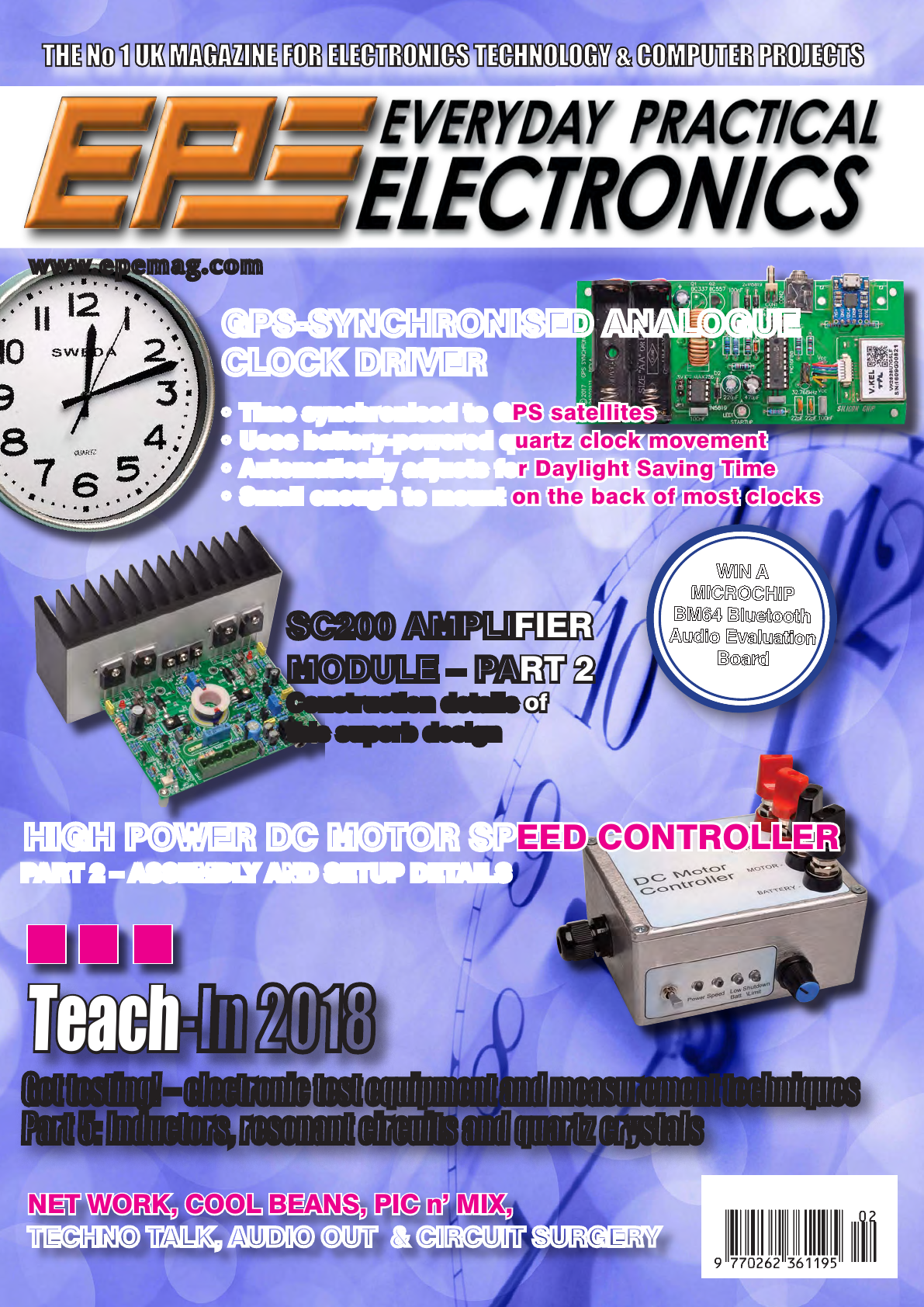 NET WORK, COOL BEANS, PIC n’ MIX, TECHNO TALK, AUDIO OUT & CIRCUIT SURGERY HIGH POWER DC MOTOR SPEED CONTROLLER • Time synchronised to GPS satellites • Uses battery-powered quartz clock movement • Automatically adjusts for Daylight Saving Time • Small enough to mount on the back of most clocks SC200 AMPLIFIER MODULE – PART 2 Construction details of this superb design PART 2 – ASSEMBLY AND SETUP DETAILS Teach-In 2018 www.epemag.com N E W GPS-SYNCHRONISED ANALOGUE CLOCK DRIVER Get testing! – electronic test equipment and measurement techniques Part 5: Inductors, resonant circuits and quartz crystals WIN A MICROCHIP BM64 Bluetooth Audio Evaluation Board FEB 2018 £4.65 FEB 2018 Cover.indd 1 13/12/2017 16:06 For Better Designers Who Need Better Tools You’re proud of your work, and you should be. The work you do impacts all our lives, but goes unseen by most—that’s why it needs to be perfect. As an engineer, designing PCBs is a core function of your job. Day in and day out, you live in the tool. You need the right tools to balance creativity, productivity, and simply getting things done. With OrCAD®, you can: • Route faster and more accurately with advanced routing technology • Collaborate on all design domains at every step of your design • Build libraries once, automatically, and easily find the perfect part Register and start your free trial now at www.orcad.com/free-trial FREE OrCAD TRIAL FEB 2018 IFC.indd 1 13/12/2017 10:01 Everyday Practical Electronics, February 2018 1 Projects and Circuits GPS-SYNCHRONISED ANALOGUE CLOCK DRIVER 12 by John Clarke (Design), Geoff Graham (Software), Nicholas Vinen (Words) Build this circuit and your analogue clock will adjust itself so it will always be 100% spot on and aligned with local daylight saving! SC200 AMPLIFIER MODULE – PART 2 24 by Nicholas Vinen and Leo Simpson Construction details for our new amplifier with many features of modern amplifiers, but using easy-to-solder through-hole components. HIGH POWER DC MOTOR SPEED CONTROLLER – PART 2 32 by John Clarke In Part 2 we look at the construction and setup details for our powerful DC motor controller, which incorporates cut-off, speed regulation and soft start. Series and Features TECHNO TALK by Mark Nelson 11 Old names for new TEACH-IN 2018 – GET TESTING! – ELECTRONIC TEST 38 EQUIPMENT AND MEASUREMENT TECHNIQUES Part 5: Inductors, resonant circuits and quartz crystals NET WORK by Alan Winstanley 46 Echoing the answer... Black Friday bonanza Teaching new skills... Chat Zone news PIC n’ MIX by Mike O’Keeffe 50 Four-digit, seven-segment LED display – Part 3 CIRCUIT SURGERY by Ian Bell 56 Potential dividers and power supplies AUDIO OUT by Jake Rothman 60 Railing against convention – Part 2 MAX’S COOL BEANS by Max The Magnificent 68 A roll of the dice… It’s all in the timing... Maybe, just maybe, I was wrong Measure twice, cut once... So long, and thanks for all the fish Regulars and Services SUBSCRIBE TO EPE and save money 4 EPE BACK ISSUES CD-ROM 5 EDITORIAL 7 Super-accurate analogue clock... Thank you Max NEWS – Barry Fox highlights technology’s leading edge 8 Plus everyday news from the world of electronics MICROCHIP READER OFFER 23 EPE Exclusive – Win a BM64 Bluetooth Audio Evaluation Board EPE TEACH-IN 7 36 EPE PIC PROJECTS – VOLUME 1 37 EPE TEACH-IN 8 45 EPE TEACH-IN 6 48 EPE PIC PROJECTS – VOLUME 2 49 EPE BACK ISSUES 54 EPE CD ROMS FOR ELECTRONICS 62 A wide range of CD-ROMs for hobbyists, students and engineers DIRECT BOOK SERVICE 65 A wide range of technical books available by mail order, plus more CD-ROMs EPE PCB SERVICE 70 PCBs for EPE projects ADVERTISERS INDEX 71 NEXT MONTH! – Highlights of next month’s EPE 72 INCORPORATING ELECTRONICS TODAY INTERNATIONAL www.epemag.com ISSN 0262 3617 PROJECTS THEORY NEWS COMMENT POPULAR FEATURES VOL. 47. No 02 February 2018 Readers’ Services • Editorial and Advertisement Departments 7 © Wimborne Publishing Ltd 2018. Copyright in all drawings, photographs and articles published in EVERYDAY PRACTICAL ELECTRONICS is fully protected, and reproduction or imitations in whole or in part are expressly forbidden. Our March 2018 issue will be published on Thursday 1 February 2018, see page 72 for details. Get testing! – electronic test equipment and measurement techniques Teach-In 2018 Contents-Feb18.indd 1 14/12/2017 09:53 Quasar Electronics Limited PO Box 6935, Bishops Stortford CM23 4WP, United Kingdom Tel: 01279 467799 Fax: 01279 267799 E-mail: sales@quasarelectronics.co.uk Web: www.quasarelectronics.co.uk All prices INCLUDE 20.0% VAT. Free UK delivery on orders over £35 Postage & Packing Options (Up to 0.5Kg gross weight): UK Standard 3-7 Day Delivery - £3.95; UK Mainland Next Day Delivery - £8.95; Europe (EU) - £12.95; Rest of World - £14.95 (up to 0.5Kg). Order online for reduced price Postage (from just £3) Payment: We accept all major credit/debit cards. Make PO’s payable to Quasar Electronics Limited. Please visit our online shop now for full details of over 1000 electronic kits, projects, modules and publications. Discounts for bulk quantities. Card Sales & Enquiries PIC Programmer & Experimenter Board Great learning tool. Includes programming examples and a repro- grammable 16F627 Flash Microcontroller. Test buttons & LED indicators. Software to compile & program your source code is included. Supply: 12- 15Vdc. Pre-assembled and ready to use. Order Code: VM111 - £38.88 £30.54 USB PIC Programmer and Tutor Board The only tutorial project board you need to take your first steps into Microchip PIC programming us- ing a PIC16F882 (included). Later you can use it for more advanced programming. Programs all the devices a Microchip PICKIT2® can! Use the free Microchip tools for PICKit2™ & MPLAB® IDE environment. Order Code: EDU10 - £46.74 ATMEL 89xxxx Programmer Uses serial port and any standard terminal comms program. 4 LED’s display the status. ZIF sockets not included.