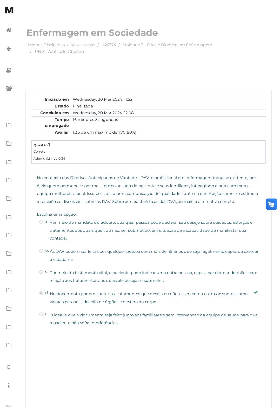 20/03/2024, 12:09 UN 3 - Avaliação Objetiva: Revisão da tentativa https://avap.multivix.edu.br/mod/quiz/review.php?attempt=4811025&cmid=1652771 1/5 Minhas Disciplinas / Meus cursos / 424774 / Unidade 3 - Ética e Bioética em Enfermagem / UN 3 - Avaliação Objetiva Enfermagem em Sociedade Iniciado em Wednesday, 20 Mar 2024, 11:52 Estado Finalizada Concluída em Wednesday, 20 Mar 2024, 12:08 Tempo empregado 16 minutos 5 segundos Avaliar 1,36 de um máximo de 1,70(80%) Questão 1 Correto Atingiu 0,34 de 0,34 No contexto das Diretivas Antecipadas de Vontade - DAV, o pro�ssional em enfermagem torna-se evidente, pois é ele quem permanece por mais tempo ao lado do paciente e seus familiares, interagindo ainda com toda a equipe multipro�ssional. Isso possibilita uma comunicação de qualidade, tanto na orientação como no estímulo a re�exões e discussões sobre as DAV. Sobre as características das DVA, assinale a alternativa correta: Escolha uma opção: a. Por meio do mandato duradouro, qualquer pessoa pode declarar seu desejo sobre cuidados, esforços e tratamentos aos quais quer, ou não, ser submetido, em situação de incapacidade de manifestar sua vontade. b. As DAV podem ser feitas por qualquer pessoa com mais de 45 anos que seja legalmente capaz de exercer a cidadania. c. Por meio do testamento vital, o paciente pode indicar uma outra pessoa, capaz, para tomar decisões com relação aos tratamentos aos quais ele deseja se submeter. d. No documento podem conter os tratamentos que deseja ou não, assim como outros assuntos como valores pessoais, doação de órgãos e destino do corpo. e. O ideal é que o documento seja feito junto aos familiares e sem intervenção da equipe de saúde para que o paciente não sofra interferências. https://avap.multivix.edu.br/my/ https://avap.multivix.edu.br/course/view.php?id=26427 https://avap.multivix.edu.br/course/view.php?id=26427§ion=4 https://avap.multivix.edu.br/mod/quiz/view.php?id=1652771 https://avap.multivix.edu.br/my/ https://avap.multivix.edu.br/course/view.php?id=26427 https://avap.multivix.edu.br/user/index.php?id=26427 https://avap.multivix.edu.br/course/view.php?id=26427§ion=1 https://avap.multivix.edu.br/course/view.php?id=26427§ion=2 https://avap.multivix.edu.br/course/view.php?id=26427§ion=3 https://avap.multivix.edu.br/course/view.php?id=26427§ion=4 https://avap.multivix.edu.br/course/view.php?id=26427§ion=5 https://avap.multivix.edu.br/course/view.php?id=26427§ion=6 https://avap.multivix.edu.br/course/view.php?id=26427§ion=7 https://avap.multivix.edu.br/course/view.php?id=26427§ion=8 https://avap.multivix.edu.br/course/view.php?id=26427§ion=9 https://avap.multivix.edu.br/course/view.php?id=26427§ion=10 https://avap.multivix.edu.br/course/view.php?id=26427§ion=11 https://avap.multivix.edu.br/course/view.php?id=26427§ion=12 https://avap.multivix.edu.br/course/view.php?id=26427§ion=13 https://avap.multivix.edu.br/hooks/portal/ https://avap.multivix.edu.br/mod/page/view.php?id=1252%2F%22%20target%3D%22_blank https://avap.multivix.edu.br/calendar/view.php/ https://avap.multivix.edu.br/ https://avap.multivix.edu.br/ https://avap.multivix.edu.br/ https://avap.multivix.edu.br/ https://avap.multivix.edu.br/ https://avap.multivix.edu.br/ 20/03/2024, 12:09 UN 3 - Avaliação Objetiva: Revisão da tentativa https://avap.multivix.edu.br/mod/quiz/review.php?attempt=4811025&cmid=1652771 2/5 Questão 2 Correto Atingiu 0,34 de 0,34 No contexto de cuidados paliativos, o enfermeiro desenvolve um papel fundamental no que concerne a construção do sistema de cuidados, pela sua capacidade de interagir de forma ampla com todos os pro�ssionais da saúde. Nesse aspecto, o enfermeiro realiza a gestão dos conhecimentos relacionados ao exercício do trabalho assistencial da enfermagem, dispondo de autonomia para analisar demandas assistenciais do paciente, tomando as decisões necessárias para que o cuidado seja integral. Aponte a alternativa que NÃO contempla uma função do enfermeiro no cuidado ao paciente em cuidados paliativo. Escolha uma opção: a. Tomada de decisões no intuito de promover conforto e dignidade ao paciente. b. Atuar em equipe interdisciplinar promovendo o atendimento as necessidade de saúde física, emocional e espiritual. c. Organizar um plano de cuidados individualizado ao paciente em cuidados paliativos. d. Evitar o conforto do paciente interrompendo sempre que necessário a administração de analgésicos. e. Gerenciar os insumos e os recursos humanos da unidade. https://avap.multivix.edu.br/my/ https://avap.multivix.edu.br/course/view.php?id=26427 https://avap.multivix.edu.br/user/index.php?id=26427 https://avap.multivix.edu.br/course/view.php?id=26427§ion=1 https://avap.multivix.edu.br/course/view.php?id=26427§ion=2 https://avap.multivix.edu.br/course/view.php?id=26427§ion=3 https://avap.multivix.edu.br/course/view.php?id=26427§ion=4 https://avap.multivix.edu.br/course/view.php?id=26427§ion=5 https://avap.multivix.edu.br/course/view.php?id=26427§ion=6 https://avap.multivix.edu.br/course/view.php?id=26427§ion=7 https://avap.multivix.edu.br/course/view.php?id=26427§ion=8 https://avap.multivix.edu.br/course/view.php?id=26427§ion=9 https://avap.multivix.edu.br/course/view.php?id=26427§ion=10 https://avap.multivix.edu.br/course/view.php?id=26427§ion=11 https://avap.multivix.edu.br/course/view.php?id=26427§ion=12 https://avap.multivix.edu.br/course/view.php?id=26427§ion=13 https://avap.multivix.edu.br/hooks/portal/ https://avap.multivix.edu.br/mod/page/view.php?id=1252%2F%22%20target%3D%22_blank https://avap.multivix.edu.br/calendar/view.php/ https://avap.multivix.edu.br/ https://avap.multivix.edu.br/ https://avap.multivix.edu.br/ https://avap.multivix.edu.br/ https://avap.multivix.edu.br/ https://avap.multivix.edu.br/ 20/03/2024, 12:09 UN 3 - Avaliação Objetiva: Revisão da tentativa https://avap.multivix.edu.br/mod/quiz/review.php?attempt=4811025&cmid=1652771 3/5 Questão 3 Correto