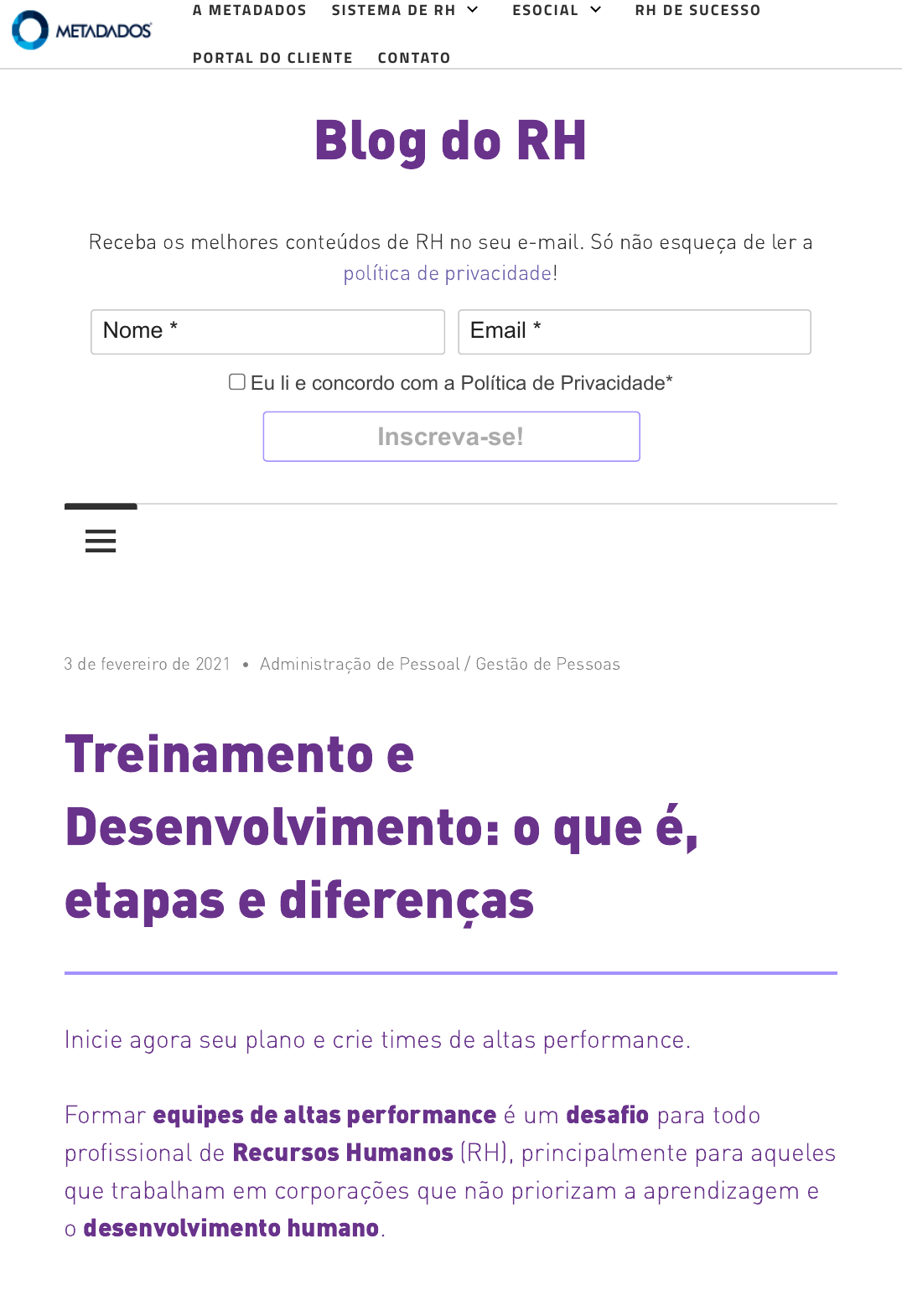 Blog do RH Receba os melhores conteúdos de RH no seu e-mail. Só não esqueça de ler a política de privacidade! 3 de fevereiro de 2021 Administração de Pessoal / Gestão de Pessoas Treinamento e Desenvolvimento: o que é, etapas e diferenças Inicie agora seu plano e crie times de altas performance. Formar equipes de altas performance é um desafio para todo profissional de Recursos Humanos (RH), principalmente para aqueles que trabalham em corporações que não priorizam a aprendizagem e o desenvolvimento humano. A M E TA DA D O S S I S T E M A D E R H E S O C I A L R H D E S U C E S S O P O R TA L D O C L I E N T E CO N TATO Nome * Email * Eu li e concordo com a Política de Privacidade* Inscreva-se! https://www.metadados.com.br/blog/ https://www.metadados.com.br/politicadeprivacidade https://www.metadados.com.br/blog/treinamento-e-desenvolvimento/ https://www.metadados.com.br/blog/Categoria/administracao-de-pessoal/ https://www.metadados.com.br/blog/Categoria/gestao-de-pessoas/ https://www.metadados.com.br/ https://www.metadados.com.br/sobre https://www.metadados.com.br/sistema-de-rh https://www.metadados.com.br/rh-de-sucesso https://suporte.metadados.com.br/hc/pt-br https://www.metadados.com.br/contato Na sua empresa, treinar e desenvolver os profissionais é visto como uma despesa ou investimento? Caso sua resposta tenha sido a primeira opção, acredite: você não está sozinho. Muitos RHs passam pelo mesmo obstáculo ao tentar implantar um plano de treinamento e desenvolvimento, mesmo sabendo que o mundo corporativo é altamente competitivo e que, para nos mantermos vivos neste universo, a competência profissional é um diferencial das corporações. Quer reverter o cenário e potencializar suas equipes através de um planejamento eficaz? Nós, da Metadados — empresa que desenvolve um completo Sistema de RH — produzimos este conteúdo exclusivo para que você inicie um novo ciclo na gestão de pessoas na sua empresa. O que você verá aqui: O que é treinamento e desenvolvimento? Diferença de treinamento e desenvolvimento Tipos e etapas de treinamentos A importância de ter treinamento e desenvolvimento na empresa O papel do RH na elaboração de um plano de treinamento e desenvolvimento O que é treinamento e desenvolvimento? https://www.metadados.com.br/ https://www.metadados.com.br/sistema-de-rh https://www.metadados.com.br/blog/gestao-de-pessoas/ De maneira simplista, podemos conceituar treinamento e desenvolvimento como um conjunto de ações planejadas que a empresa realiza para contribuir com a geração de resultados alinhados aos objetivos organizacionais. Logo, de acordo com seu negócio, a corporação traça os conhecimentos, habilidades e atitudes que os profissionais, em diferentes setores, precisam adquirir para agregar valor ao negócio e aprendizado organizacional. Veja o que dizem alguns estudiosos do assunto: “Treinamento é o processo sistemático que envolve uma mudança de habilidades, conhecimento, atitudes ou comportamento dos empregados, estimulando-os a serem mais produtivos na direção do alcance dos objetivos organizacionais” – Chiavenato (2010) “Treinamento como um processo de assimila ção cultural em curto prazo que recicla esses conhecimentos, habilidades e atitudes rela - cionados diretamente à execução de tarefas ou à sua otimização no trabalho” – Marras (2009) “O treinamento profissional diz respeito à preparação do indivíduo, com a assimilação de novos hábitos, conhecimento, técnicas e práticas voltadas para a satisfação de demandas no exercício da profissão” – Pacheco (2005) Em uma perspectiva tradicional, observamos que de um lado há o profissional que recebe capacitação, adquire novos conhecimentos, habilidades e está apto a exercer suas funções e, de outro, há a empresa que se torna mais competitiva ao contar com profissionais capazes de desenvolver e entregar produtos e serviços inovadores, qualificar os processos e proporcionar experiências únicas aos clientes. Tendências do Treinamento e Desenvolvimento Entretanto, o tradicional não é a única perspectiva. Observando as tendências e técnicas mais contemporâneas de treinamento e desenvolvimento, vislumbramos objetivos mais complexos do que apenas treinar para melhorar o desempenho do profissional ou obter o nível desejado de competência para realizar de forma produtiva, eficaz e lucrativa seu trabalho. Temos uma organização mais comprometida em manter um ambiente de aprendizagem que contribui para o desenvolvimento da performance, o desenvolvimento de carreira, a gestão de talentos e os planos de sucessão, atingindo um nível maior de maturidade e de engajamento profissional. Assim, além de saber o que fazer, conseguem entender o porquê do fazer; qual é a melhor forma de fazer e as maneiras de aprimorar, constantemente, esse fazer. Desta forma, neste novo contexto são agregados propósito e significado ao trabalho. Identificamos, portanto, uma disrupção entre o treinamento e desenvolvimento tradicional do contemporâneo. Para as duas formas, há etapas para a construção do planejamento eficiente e é sobre isso que falaremos no tópico três. Antes, é preciso diferenciar treinamento de desenvolvimento. Você sabe a diferença? Qual a diferença entre treinamento e desenvolvimento? Treinamento não é o mesmo que desenvolvimento. Ainda que frequentemente utilizamos os dois termos em conjunto, é importante distinguir o que cada um quer dizer. Entenda: https://www.metadados.com.br/blog/voce-sabe-planejar-treinamentos-eficazes-para-sua-equipe/ https://gestaorh.metadados.com.br/infografico-treinamento-desenvolvimento Treinamento É uma iniciativa de educação corporativa elaborado com o intuito de aprimorar as competências, habilidades e atitudes dos colaboradores, afim de qualificar o desempenho de suas atividades nos cargos e funções que ocupam. Frequentemente, o treinamento é de curto prazo e com resulta