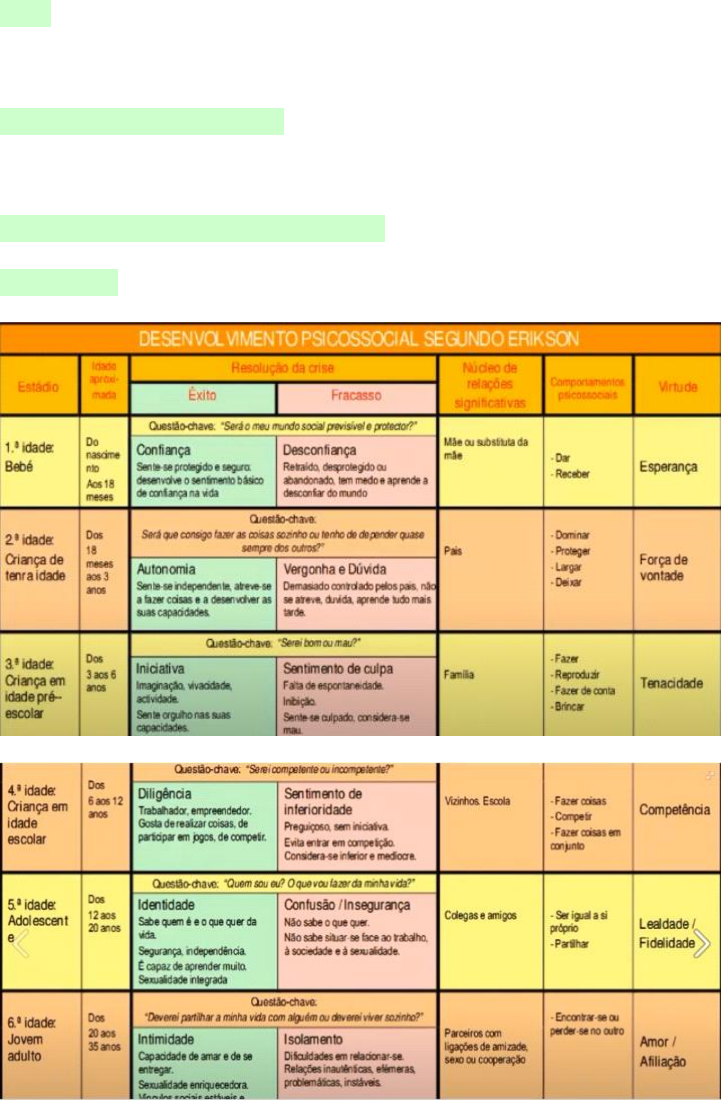 Teoria do desenvolvimento psicossocial, paralela ao desenvolvimento psicossexual Construção da psique através das relações com a sociedade Vida de desprazer é formativa Crise: Motor da mudança;momento decisivo enfrentado em cada fase do desenvolvimento Crise e conflito: Não no aspecto negativo, é formativo. Desconfigurar para reconfigurar; tão importante quanto harmonia e paz Desenvolvimento psicossocial: 8 estágios sucessivos que abrangem os estágios contínuos Crises contínuas que se passam dentro dos estágios sucessivos Princípio epigenético do desenvolvimento Traços biologicamente herdados que vão depender da interação ambiental. Força básica: Surge quando a crise é resolvida satisfatoriamente ; resultado satisfatório Erik Erikson: Teoria da identidade quinta-feira, 8 de dezembro de 2022 17:07 PSICOLOGIA Page 1 Importância dos adultos influencia na passagem da criança pela crise e também resolução Oral-sensorial: O modo como os pais se relacionam com os filhos vai determinar se ela desenvolve confiança ou desconfiança; Grande dependência da criança; não exceder em mimo; força básica: Esperança. Muscular-anal: Querer fazer as coisas sozinha, autonomia. Saindo da alta dependência para a autonomia. Força básica: Vontade. Vontade de autonomia Locomotor: Semelhante a fase fálica de Freud; Relacionada com relações de proibição. De modo geral a criança vai falhar. A forma como os pais lidam vai dar a força básica objetivo= Entende limites do que pode e não pode. Entendimento de limitações desse objetivo Latência: Diligência vs inferioridade (boa aquisição de eficácia, construir coisas, aspecto criativo e estudos). Importância do professor e colegas, gera competência e segurança. Adolescência:Fase de enfrentar e resolver a crise da identidade básica do ego. (ego ainda não consegue fazer uma autoimagem fechada) se dá através das relações com o outro. *Da adolescência a velhice= equivalente a fase genital de freud) Construção da identidade do ego (experimentando diferentes grupos). Tenta fazer parte de grupos, começa a testar sua própria capacidade reflexiva, capacidade de filosofa, questionar autoridades. Identidade +: Identidade boa de si e do entorno. Desenvolve força básica da Fidelidade ( a si e ao outro; fiel a sua identidade coesa) Identidade -: Adoção de moldes identitários, criminalidade, não sabe quem é, o que quer, para onde vai; permissivo e sujeito a relacionamentos abusivos. O que é confusão de papéis: Os papéis não são mais tão óbvios e passam a ser questionados, o sujeito busca sua identidade. Idade Jovem Adulta: Intimidade vs Isolamento> Intimidade: Sabe o limite da sua própria identidade ao se relacionar com o outro. Isolamento: Temem a intimidade por acreditarem ser um perigo a identidade do ego; Conduta de pouca empatia, mecanismo de defesa. "A interação social tensiona o sujeito" Adulto: Generatividade vs Estagnação Generatividade: Cuidado com a geração que vem. Estagnação: Não compreende bem que houve uma mudança geracional. Força básica: Cuidado e empatia; Relacionado aos mais novos e próximas gerações. Integridade do ego vs Desespero Maturidade e velhice: Reflete sobre o passado, o que fez, o que não fez, arrependimentos Desespero: Sente que não viveu, que foi tolido, ego não-integrado, sente que tem pendências consigo Retrogênese: Sente o peso da idade, se depara com a finitude da vida Força básica: Sabedoria. Sábio é aquele que tira lições de tudo e consegue repassar. Fruto do ego integrado, aprende no prazer e no desprazer. Fraquezas básicas: Características motivadoras derivadas da resolução insatisfatória da crise de desenvolvimento. PSICOLOGIA Page 2 desenvolvimento. As formas bem e mal-resolvidas de lidar com a crise de cada fase são incorporadas na identidade do ego numa espécie de equilíbrio criativo. O ego deve ser composto basicamente de atitudes adaptativas mas também contém uma parcela de atitude negativa. Mau-desenvolvimento: No desenvolvimento desequilibrado, o ego é composto apenas de uma atitude: a bem ou mal-adaptada. Ego composto apenas por uma forma de lidar com conflitos. Mal-adaptada: Quando só a tendência positiva e adaptável está presente no ego Maligna: Só a tendência negativa está presente Estas más adaptações levam a neuroses e malignidades causadoras de psicoses. PSICOLOGIA Page 3