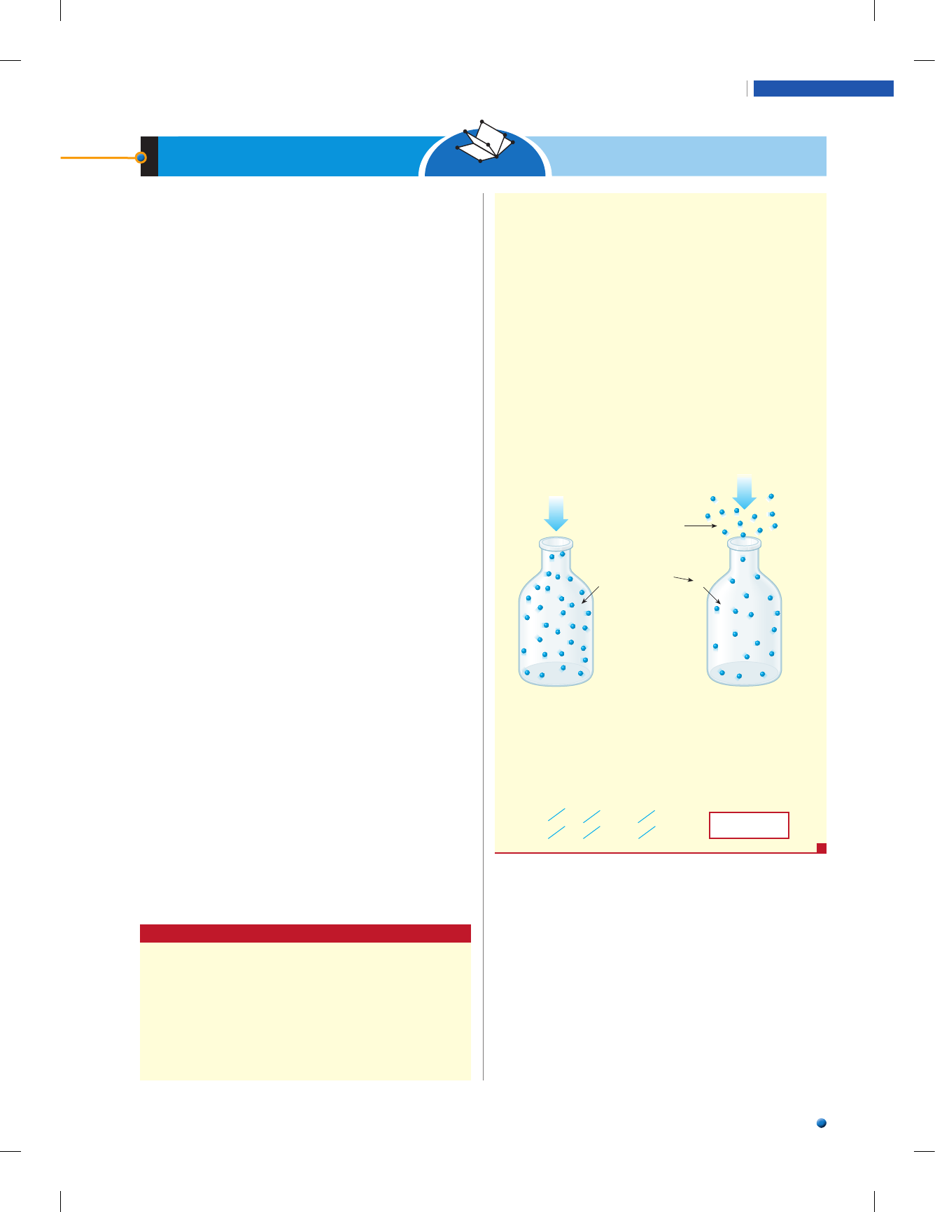 Capítulo 14 O comportamento físico dos gases 339 R ep ro d uç ão p ro ib id a. A rt . 1 84 d o C ód ig o P en al e L ei 9 .6 10 d e 19 d e fe ve re iro d e 19 98 . n P atm V 21 °C 294 K Situação inicial nf P atm V 217 °C 490 K Situação final Gás expulso graças à expansão O gás que fica na garrafa ocupa todo o volume V Exercícios essenciais A critério do(a) professor(a) esta lista de exercícios poderá ser realizada em classe ou em casa.Resolva em seu caderno 66. Ao realizar a reação de ferro metálico com uma solu ção aquosa de ácido clorídrico, um químico recolheu 83,15 L de gás hidrogênio a 100 kPa de pressão e a 27 °C. Qual a quantidade em mols de gás hidrogênio na amostra recolhida? 67. Por meio de agitação e aquecimento, um grupo de estudantes expulsou praticamente todo o gás carbô nico contido em um litro de refrigerante. O gás foi recolhido a 1 atm e 30 °C. A medida do volume da amostra forneceu o valor de 1,25 L. Determine, nessa amostra gasosa: a) a quantidade em mols b) a massa de gás c) o número de moléculas 68. Há dúvida se uma certa amostra de gás é de oxigênio (O2), nitrogênio (N2) ou dióxido de carbono (CO2). Medidas revelaram que a massa da amostra é 0,70 g, seu volume é 750 mL, sua pressão é 0,82 atm e sua temperatura é 27 °C. Com base nessas informações, é possível decidir entre um dos três gases — oxigênio, nitrogênio ou dióxido de carbono — como sendo o que existe na amostra? Explique. 69. Desejase guardar 3,0 g de etano (C2H6) a 27 °C em um recipien te rígido de volume 1,5 L, que suporta, no máximo, 6 atm de pressão sem arrebentar. O reci piente pode ser utilizado para a finalidade desejada? Explique. 70. Utilize a Lei do Gás Ideal para prever o volume molar dos gases a 1,5 atm e 177 °C. 71. Imagine que as condições normais de temperatura e pressão fossem definidas como sendo 100 kPa e 0 °C. Procure no texto a correspondência entre atm e kPa e responda às questões. a) A pressão de 100 kPa é maior ou menor que 1 atm? b) Esperase que o volume de 1 mol de gás ideal seja maior ou menor a 100 kPa e 0 °C se comparado a 1 atm e 0 °C? c) Com auxílio de uma calculadora (se desejar) e da Lei do Gás Ideal, determine o volume molar de um gás ideal a 100 kPa e 0 °C. d) Qual a diferença entre o valor calculado no item anterior e o valor de 22,4 L? Exercício Resolvido 72. Uma garrafa de vidro sem tampa está “vazia”, ou melhor, cheia de ar, e encontrase a 21 °C. Ela é colocada dentro de um forno a 217 °C. Como con sequência do aquecimento, o ar contido em seu interior se expande e, com essa dilatação, uma parte dele é expulsa da garrafa. Considerando que inicialmente há n mol de ar na garrafa, quanto haverá após o aquecimento? Resolução Esta questão ilustra uma das muitas situações aparentemente complexas que podemos resolver empregando a Lei do Gás Ideal duas vezes e, a seguir, dividindo ambas as equações membro a membro a fim de cancelar fatores comuns. Nesse caso específico, vamos aplicar a lei às situações inicial e final: a pressão é a mesma (a pressão ambiente no local da experiência, que simbolizaremos por Patm), o volume da garrafa é o mesmo (estamos desconsiderando a ligeira dilatação do vidro) e a constante dos gases é a mesma (desde que estejamos trabalhando num mesmo conjunto de unidades). Alteramse a temperatura (de 294 K para 490 K) e a quanti dade em mols de ar que se encontra no interior da garrafa. Assim: Inicial: Patm z V 5 n z R z 294 Final: Patm z V 5 nf z R z 490 Dividindo essas equações membro a membro, temos: Patm ? V _______ Patm ? V 5 n ? R ? 294 __________ nf ? R ? 490 V nf 5 0,6 z n 73. Um recipiente fechado e indeformável contém certa quantidade em mols de um gás. Acrescentase ao recipiente mais desse mesmo gás, até triplicar a quantidade em mols em seu interior. A seguir, o re cipiente é aquecido até duplicar sua temperatura na escala kelvin. Compare a pressão inicial no interior do recipiente com a pressão final. 74. Um recipiente de 1 L contém gás nitrogênio a 5 atm e um outro recipiente, de 3 L, contém gás oxigênio a 2 atm. Ambos encontramse na mesma temperatura. a) Em qual deles há mais moléculas? b) Determine a relação (divisão, quociente) entre o nú mero de moléculas de gás em ambos os frascos. a d il s O N s e c c O 340 R ep ro d uç ão p ro ib id a. A rt . 1 84 d o C ód ig o P en al e L ei 9 .6 10 d e 19 d e fe ve re iro d e 19 98 . Exercícios adicionais Seu (sua) professor(a) indicará o melhor momento para realizar os exercícios deste bloco. Resolva em seu caderno 76. (PUCSP) Um cilindro de 8,2 L de capacidade contém 320 g de gás oxigênio a 27 °C. Um estudante abre a válvula do cilindro, deixando escapar o gás até que a pressão seja reduzida para 7,5 atm. Supondose que a temperatura permaneça constante, a pressão inicial no cilindro e a massa de gás liberada serão, respectivamente, a) 30 atm e 240 g. b) 30 atm e 160 g. c) 63 atm e 280 g. d) 2,7 atm e 20 g. e) 63 atm e 140 g. 77. (FuvestSP) Certo gás X é formado apenas por ni trogênio e oxigênio. Para determinar sua fórmula molecular, comparouse esse gás com o metano (CH4). Verificouse que volumes iguais dos gases X e metano, nas mesmas condições de pressão e tem peratura, pesaram, respectivamente, 0,88 g e 0,32 g. Qual a fórmula molecular do gás X? a) NO d) N2O3 b) N2O e) N2O5 c) NO2 Massas molares (g/mol) H .................................................... 1 C ..................................................... 12 N ..................................................... 14 O ..................................................... 16 75. No início de uma viagem, a pressão interna de um pneu sem câmara era de 2,00 atm e a tempe ratura era de 17 °C. Esse pneu foi perfurado por um prego durante uma viagem e perdeu parte do ar interno, que escapou graças ao furo (em geral, os pneus sem câmara murcham bem mais devagar