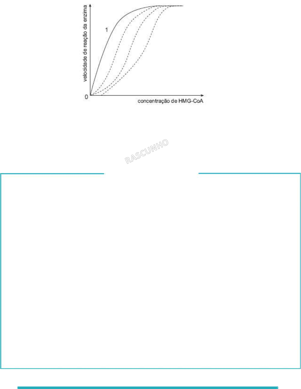 10 10. (Uerj) As estatinas, por seu grande êxito na prevenção da doença coronariana, estão entre os medicamentos mais prescritos no mundo. Essas substâncias atuam sobre a enzima que regula a síntese de colesterol pelo fígado, denominada, simplificadamente, de HMG-CoA redutase. Para testar a eficiência de vários derivados de estatinas, utilizou-se uma preparação de HMG-CoA redutase isolada de tecido hepático. A velocidade de reação dessa preparação enzimática foi medida em função de concentrações crescentes de seu substrato HMG-CoA, na ausência e na presença de uma concentração fixa de três derivados de estatina. Nesses experimentos, o pH, a temperatura, a concentração da enzima e a concentração dos cofatores necessários foram sempre mantidos constantes. O gráfico abaixo representa os resultados encontrados; a curva 1 foi obtida na ausência de estatinas. a) Nomeie o tipo de mecanismo de ação das estatinas sobre a enzima HMG-CoA redutase hepática e justifique sua resposta. b) Aponte uma substância sintetizada a partir do colesterol em nosso organismo, não caracterizada como hormônio, e sua respectiva função. Resolução e Respostas Definitivas