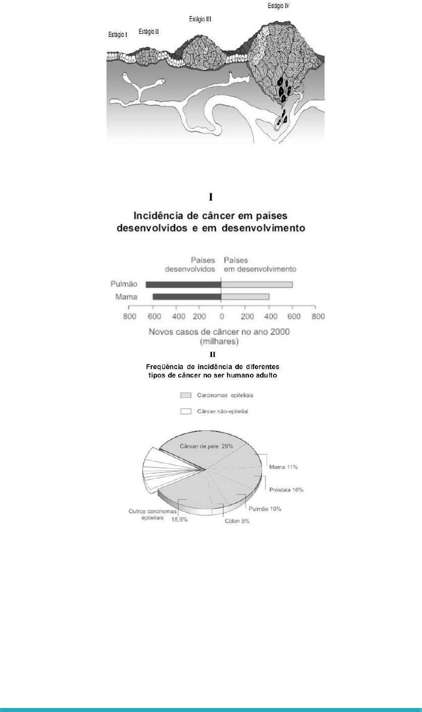 41 40. (Ufmg) Atualmente, o câncer é considerado, entre as doenças mais frequentes, a segunda causa de morte. Analise esta figura em que os estágios, numerados de I a IV, representam o desenvolvimento de um tumor, ao longo do tempo, numa mesma área: 1. Com base nas informações dessa figura, cite três alterações celulares envolvidas na formação do estágio IV. 2. Sabe-se que o câncer também pode ser causado por fatores ambientais. Analise estes gráficos: FONTE: Cancer epidemiology in the last century and the decade. Nature, v. 411, 17 May 2001. p. 393. (Adaptado) Com base nas informações desses gráficos, faça o que se pede. a) Considerando o gráfico I e as condições gerais das pessoas que vivem nos países desenvolvidos e em desenvolvimento, cite um comportamento que pode explicar - as diferentes incidências de câncer de mama. - a semelhança de incidências de câncer de pulmão. b) Considerando-se o gráfico II, observa-se que o câncer de pele representa 29% do total. Para prevenir essa doença, recomenda-se evitar exposição direta ao Sol no horário de 10h às 16h. Explique essa recomendação. c) Explique por que a maior incidência de alterações malignas ocorre no tecido epitelial.