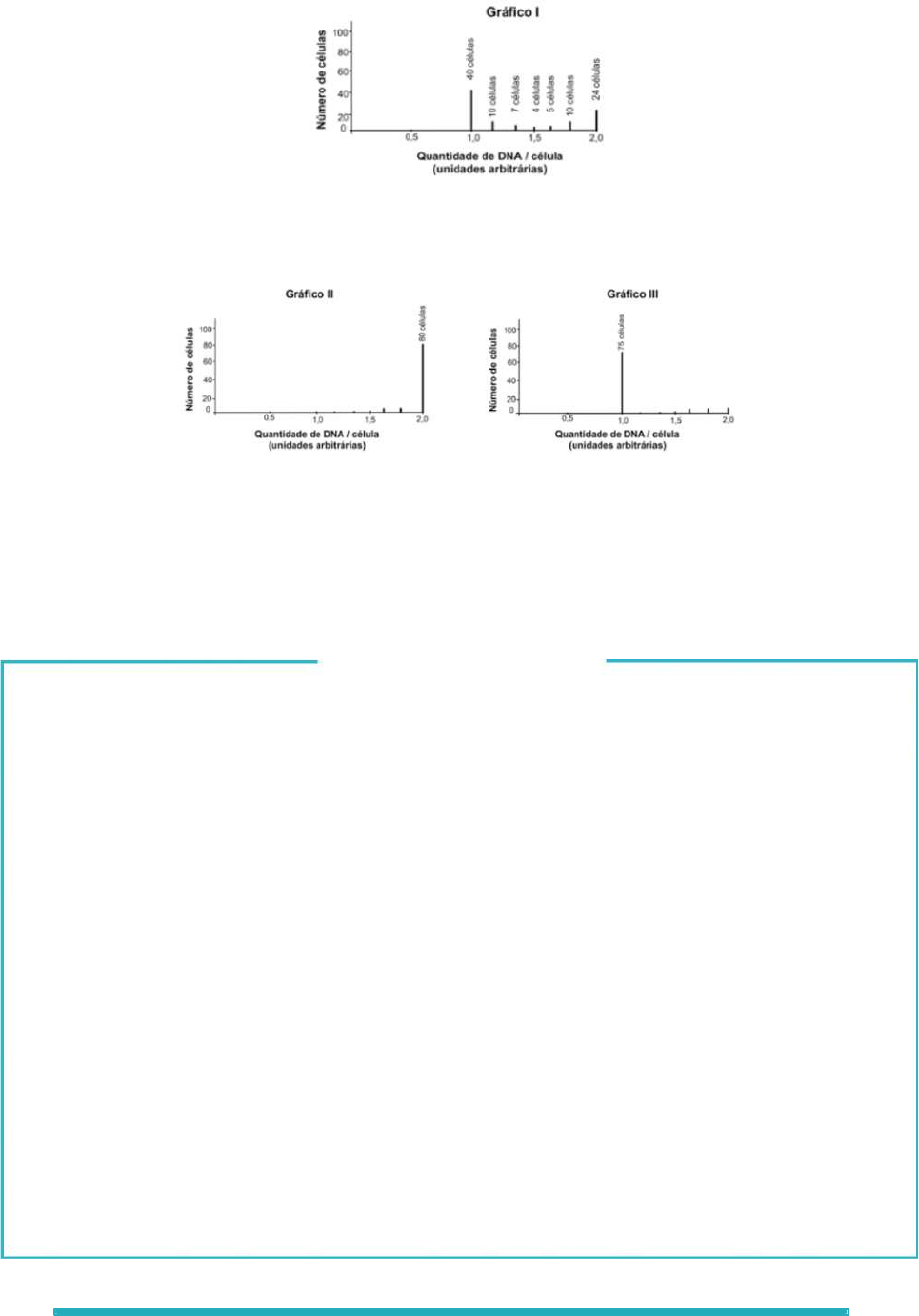 44 Questão bônus: (Uff) Células eucarióticas que possuem um ciclo de divisão em torno de 24 horas estão sendo cultivadas em meio adequado. Em um determinado momento, coletam-se, aleatoriamente, 100 células dessa cultura e determina-se a quantidade de DNA em cada uma delas. Os resultados estão mostrados abaixo, no gráfico I. O restante da cultura foi, então, dividido em duas porções. Em uma delas, adicionou-se afidicolina e, na outra, colchicina. Após algumas horas, foram retiradas, da mesma forma, 100 células de cada porção, sendo também determinada a quantidade de DNA por célula. Esses resultados estão mostrados nos dois outros gráficos abaixo. Sabendo-se que: - a afidicolina inibe a enzima DNA polimerase; - a colchicina inibe a polimerização das subunidades que formam os microtúbulos. a) analise o resultado do experimento mostrado no gráfico I e calcule a porcentagem de células que se en- contram nas fases do ciclo celular G1, S e G2 + M; b) identifique os gráficos que representam, respectivamente, os resultados dos experimentos onde houve adição de afidicolina e de colchicina ao meio de cultura. Justifique sua resposta. Resolução e Respostas Definitivas