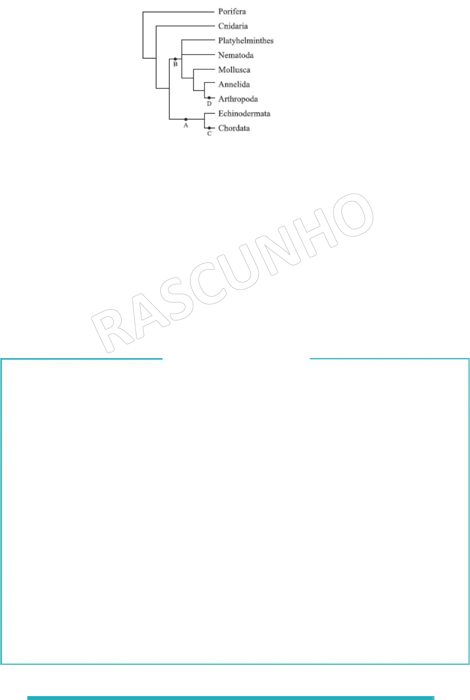 114 92. (Unesp) A figura representa uma proposta sobre as relações de parentesco entre os grupos de animais (Animalia ou Metazoa). www.tolweb.org. Modificado. Cite para cada um dos ramos indicados, A, B, C e D, uma característica presente apenas nos grupos representados nos ramos à direita desses pontos. Resolução e Respostas Definitivas