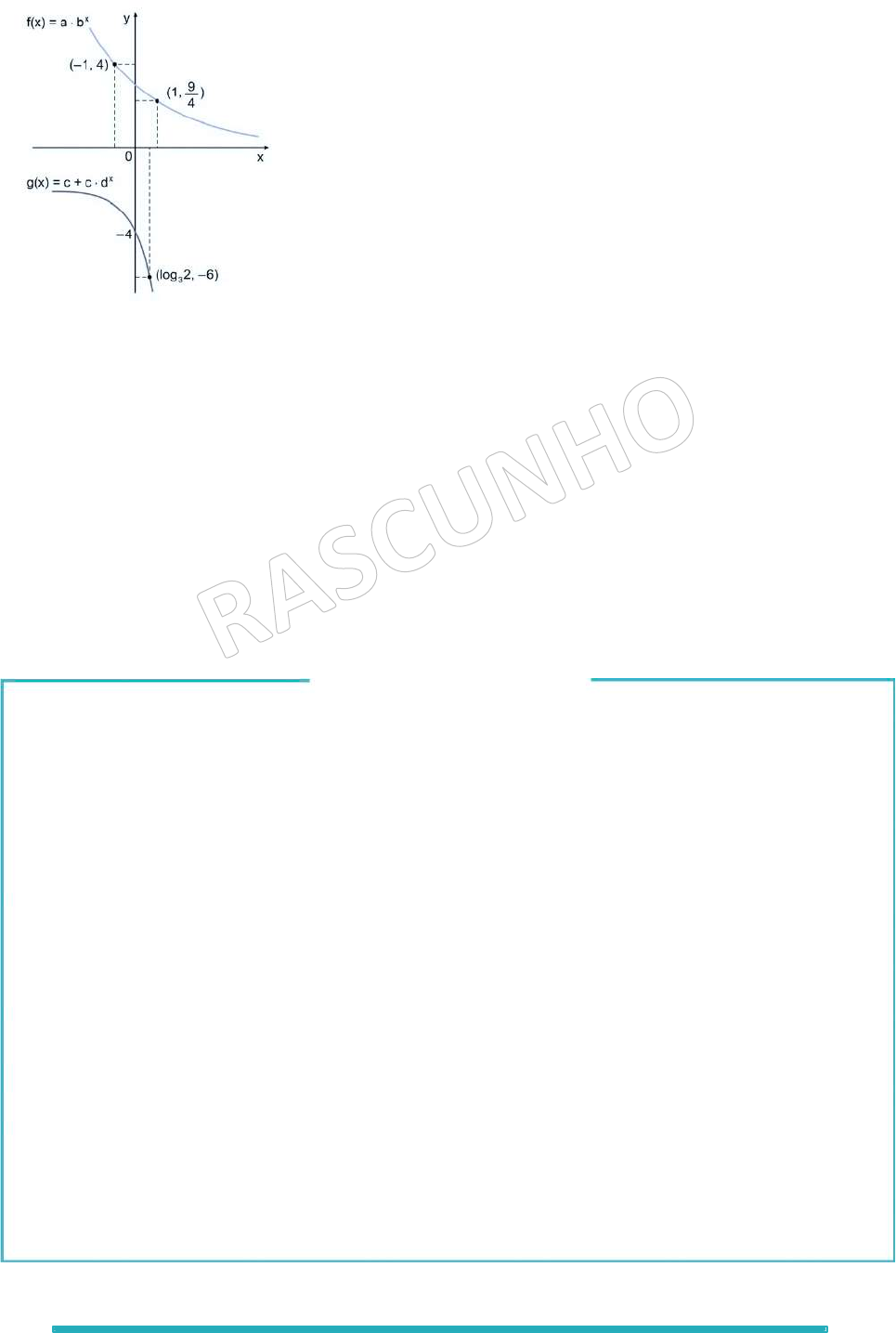 50 50. (Unesp) Os gráficos a seguir referem-se às funções exponenciais 𝑓 e 𝑔, de ℝ em ℝ, definidas por 𝑓(𝑥) = 𝑎 ∙ 𝑏. e 𝑔(𝑥) = 𝑐 + 𝑐 ∙ 𝑑. com 𝑎, 𝑏, 𝑐 e 𝑑 sendo números reais, 0 < 𝑏 ≠ 1 e 0 < 𝑑 ≠ 1. a) Determine a função 𝑓 e as coordenadas do ponto de intersecção do seu gráfico com o eixo 𝑦. b) Determine a função 𝑔 e a equação da assíntota do seu gráfico. Resolução e Respostas Definitivas