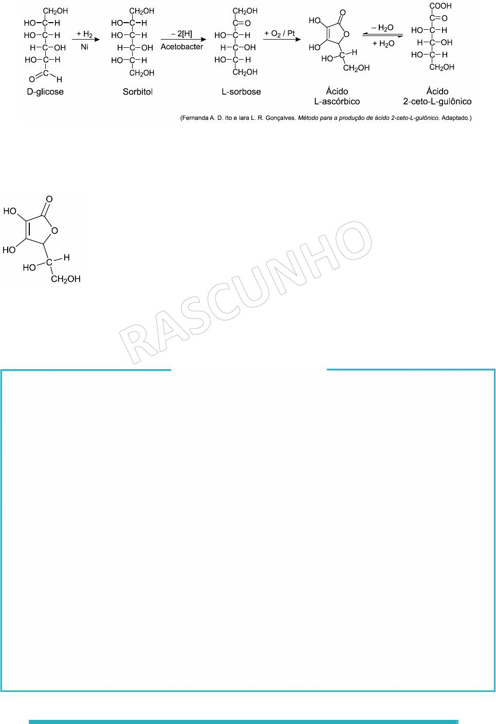 101 86. (Unifesp) A sequência de reações representada no esquema resume etapas de um dos processos de obtenção de ácido L-ascórbico (vitamina C) a partir da glicose. a) Dê o nome da substância que possui um grupo funcional éster. Quais substâncias, entre as representadas no esquema, são isômeras entre si? b) Dê o nome do composto que sofre redução na sequência de reações. Indique, na fórmula do ácido L- ascórbico a seguir, os dois átomos de carbono assimétrico. Resolução e Respostas Definitivas