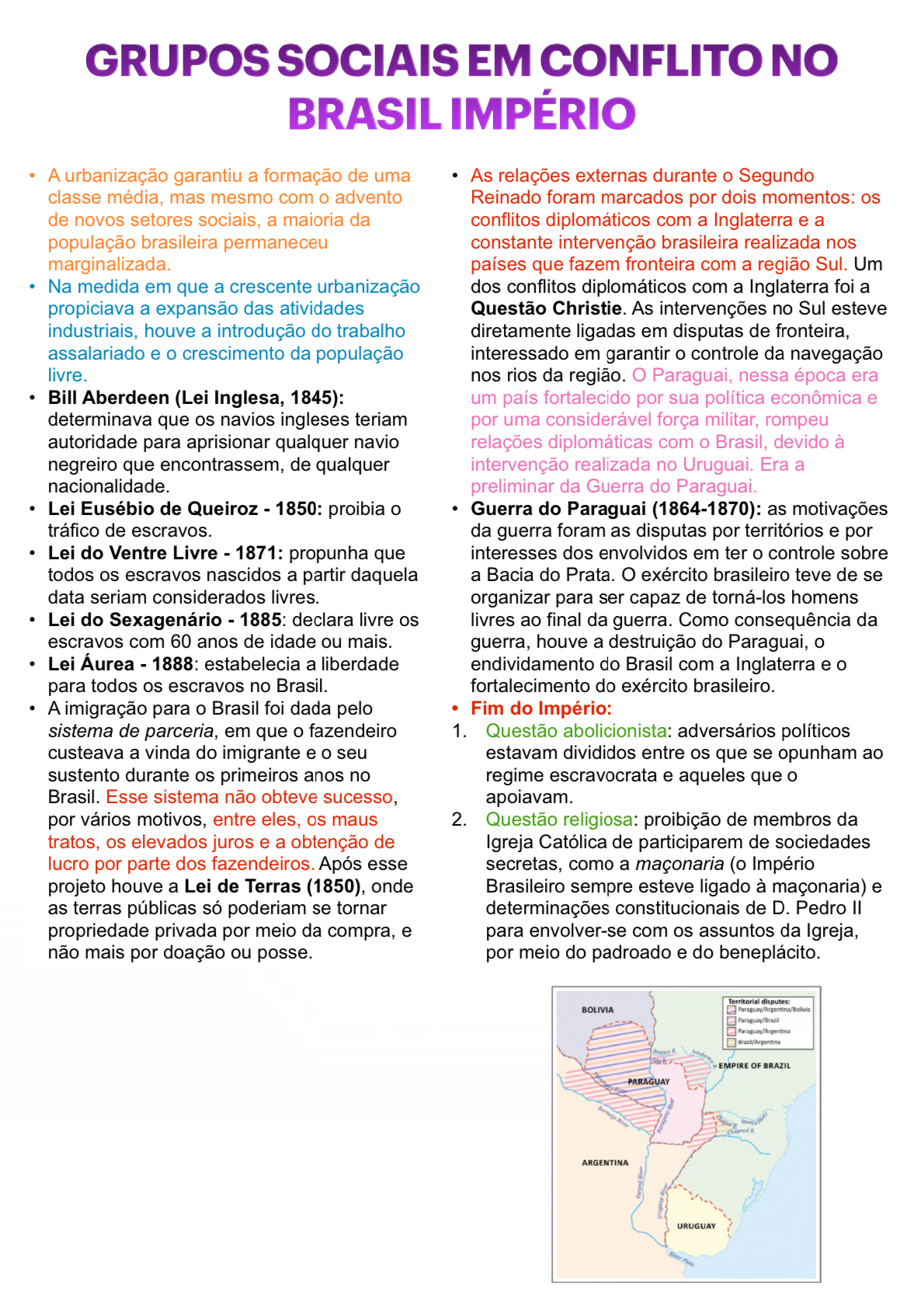@vestibularesumido 19 3. Questão militar: expressão de posicionamentos e República Presidencialista Centralizadora - positivismo. 4. Questão republicana: o movimento republicano teve uma forte influência do pensamento positivista (estruturado na crença inabalável na ciência e razão). • O Golpe Republicano: os republicanos aproveitaram a instabilidade para divulgar um boato de que D. Pedro II realizaria uma repressão contra os militares que fossem a favor da República. Deodoro da Fonseca foi convencido pelos republicanos de que ele representaria melhor o grupo de insatisfeitos contra o regime. Assim, Deodoro proclamou a República em 15 de novembro de 1889, informando a D. Pedro II que ele deveria se retirar do Brasil. GRUPOS SOCIAIS EM CONFLITO NO BRASIL IMPÉRIO @vestibularesumido 20 • A transição do Império para República no Brasil foi caracterizada por um difícil período de instabilidade politica e econômica. • Governo Provisório: curto período de organização das instituições brasileiras após o Golpe Republicano. Houve o banimento da família real, proclamação de um regime republicano e federativo e separação da Igreja do Estado (formação de um Estado Laico) e instituição do casamento civil. • Política do Encilhamento: Rui Barbosa lançou um projeto econômico que objetivava o desenvolvimento industrial e o aumento de recursos financeiros circulantes para solucionar a baixa quantidade de dinheiro em um período em que a mão de obra passou a ser assalariada. Porém, obteve elevada inflação, desvalorização da moeda brasileira e a alta do custo de vida. Assim, teve como nome pejorativo o “encilhamento.” • Constituição de 1891: esse documento foi fortemente influenciado pela constituição liberal estadunidense, afirmando o direito a igualdade, liberdade e propriedade privada. O voto era restrito aos brasileiros maiores de 21 anos, excluindo mendigos, soldados, analfabetos e religiosos e era voto aberto. • República da Espada: o curto governo de Deodoro da Fonseca foi caracterizado pelo autoritarismo do presidente e pelos reflexos econômicos do Encilhamento. A Marinha Brasileira deu início às Revoltas da Armada, exigindo a restauração da ordem democrática no país. Entre as correntes conflitantes, destacam-se três grupos: 1. Positivistas: defensores do positivismo e do papel centralizador 2. Jacobinos: projetavam uma pátria com o ideal de participação popular 3. Liberal: queriam a garantia da manutenção da propriedade e da liberdade individual, inspirados na república estadunidense. REPÚBLICA PROVISÓRIA E DA ESPADA