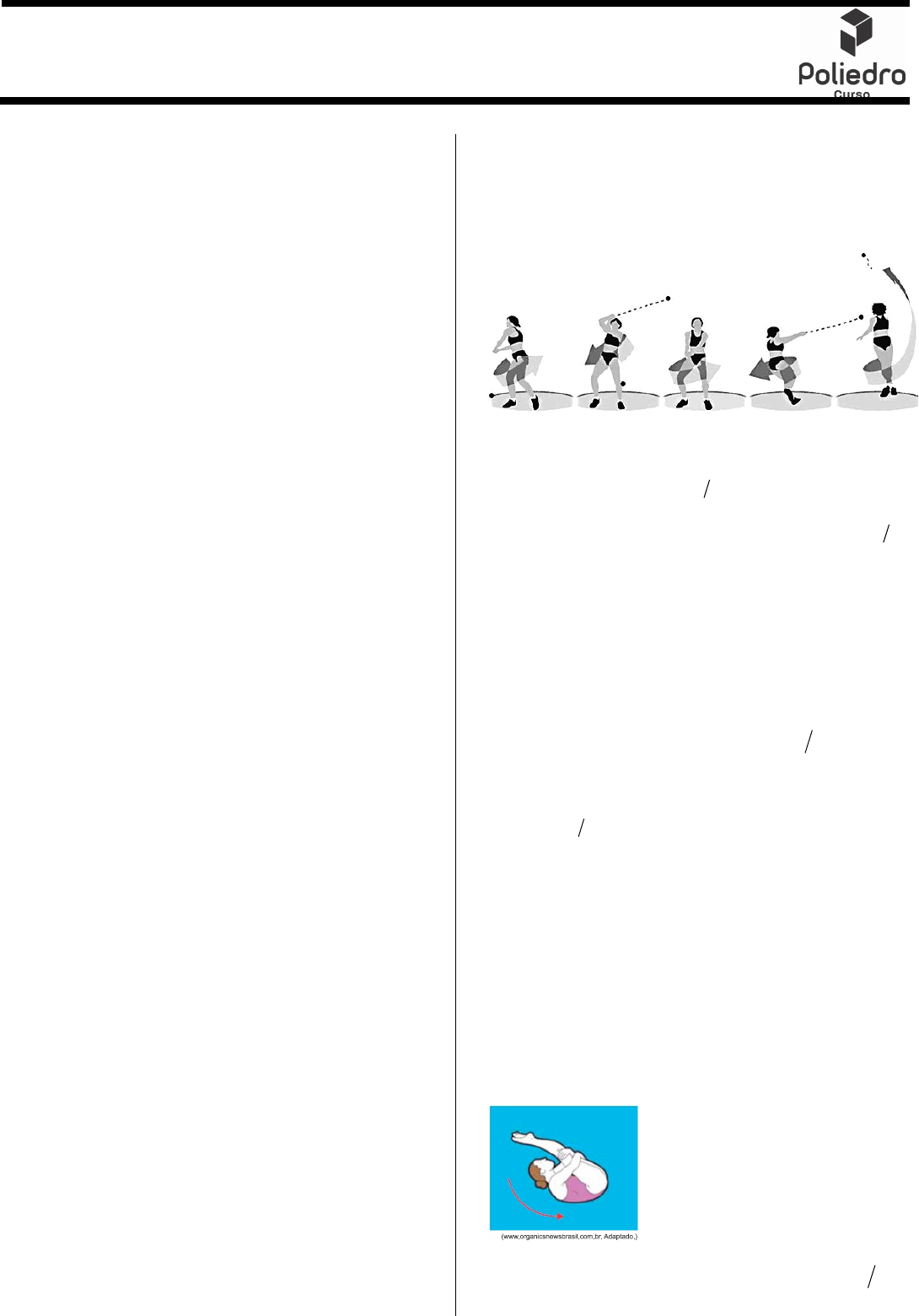 Extensivo 2021 – Lista 6 de Física 1 – Aulas: 13 e 14. Edu Leite 1 1. Começar lembrando que toda grandeza linear ou tangencial é igual à sua grandeza angular correspondente vezes o raio; assim ocorre com o deslocamento escalar, com a velocidade tangencial e com a aceleração tangencial ou escalar. 2. w = 2.π.f = 2.π/T = v/R = Δθ/Δt lembrando sempre que o período é o tempo de todos os eventos pelo número de eventos, a frequência é o número de eventos pelo tempo total e, por isso, o período é o inverso da frequência. 3. Lembrar que Hz é cps, rps, ou ops. Lembrar que de rph para rps dividir por 3600; de rpm para rps dividir por 60. 4. Os dois tipos de acoplamento: No acoplamento com eixo comum, a velocidade angular, período, frequência são sempre iguais, e a velocidade periférica é tanto maior quanto maior for o raio; no acoplamento com eixos independentes, a velocidade linear é a mesma, isto é, o produto entre o raio da polia e a frequência é constante: a menor gira mais rápido (marcha leve) e a maior gira mais lentamente (marcha pesada): 5. NA BICICLETA: lembrar que, para subida, marcha leve para trajetória pesada, isto é, coroa pequena e catraca maior; na descida, marcha pesada para trajetória leve, isto é, coroa grande e catraca pequena. Quanto menor o raio da coroa, menor o torque e menores as forças exercidas, apesar das velocidades rotacionais serem maiores. 1. (Fmp 2021) O lançamento de martelo é uma modalidade olímpica de atletismo na qual o atleta gira uma esfera de metal presa por um cabo e a solta, visando a que a esfera atinja a maior distância possível após o lançamento, conforme mostra a figura abaixo. Suponha que, no momento do lançamento, a esfera realizava um movimento circular de raio girando a uma velocidade angular de A velocidade da esfera no momento do lançamento, em é de, aproximadamente, a) b) c) d) e) TEXTO PARA A PRÓXIMA QUESTÃO: Sempre que necessário, use e 2. (Unicamp 2021) Ao passar pelo sensor magnético, a velocidade linear de um ponto de uma fita cassete é Depois de passar pelo sensor, a fita é enrolada em uma bobina circular de diâmetro Em quanto tempo a bobina completa uma volta? a) b) c) d) 3. (Fmj 2020) Em uma competição de saltos ornamentais, uma atleta, após tirar seus pés da plataforma, iniciando a queda livre, deve fazer seu corpo girar uma vez e meia em torno de seu centro de gravidade, antes de tocar a água. Considere que a aceleração gravitacional é igual a e que a atleta deve realizar o giro enquanto seu centro de 1,20 m, 25,0 rad s. m s, 30,0 26,2 36,0 25,0 20,8 3π = 2g 10 m s .= v 0,045m s.= d 6,0 cm.= 0,65 s. 1,3 s. 4,0 s. 0,27 s. 210 m s 2 gravidade se desloca verticalmente por a partir do repouso. Para que a atleta consiga realizar esse salto com perfeição, seu corpo deve girar com velocidade angular média de a) b) c) d) e) 4. (Espcex (Aman) 2020) Duas polias, e ligadas por uma correia inextensível têm raios e conforme o desenho abaixo. Admitindo que não haja escorregamento da correia e sabendo que a frequência da polia é então a frequência da polia é a) b) c) d) e) 5. (Famerp 2019) Uma pessoa parada sobre a linha do equador terrestre apresenta uma velocidade tangencial, devido à rotação da Terra, de módulo próximo a Sabendo que e uma pessoa em repouso sobre o solo, em São José do Rio Preto, cuja latitude é aproximadamente Sul, tem uma velocidade tangencial de módulo próximo a a) b) c) d) e) 6. (Upf 2019) Um corpo descreve um movimento circular uniforme cuja trajetória tem de raio. Considerando que o objeto descreve voltas em é possível afirmar que sua velocidade tangencial, em é de, aproximadamente (Considere a) b) c) d) e) 7. (Uece 2019) Considere um carrossel que gira com velocidade angular tal que cada cavalo percorre duas voltas completas em segundos. Assim, a velocidade angular do carrossel, em é a) b) c) d) 8. (Uerj 2019) Em um equipamento industrial, duas engrenagens, e giram vezes por segundo e vezes por minuto, respectivamente. O período da engrenagem equivale a e o da engrenagem a A razão é igual a: a) b) c) d) 9. (Efomm 2018) Um automóvel viaja em uma estrada horizontal com velocidade constante e sem atrito. Cada pneu desse veículo tem raio de metros e gira em uma frequência de rotações por minuto. A velocidade desse automóvel é de aproximadamente: (Dados: considere a) b) c) d) e) 10. (Eear 2018) Um ponto material descreve um movimento circular uniforme com o módulo da velocidade angular igual a Após o número de voltas completas percorridas por esse ponto material é Adote a) b) c) d) 5,0 m, 2,0 rad s.π 3,0 rad s.π 1,5 rad s.π 0,6 rad s.π 2,3 rad s.π A B, AR 60 cm= BR 20 cm,= A Af 30 rpm,= B 10 rpm. 20 rpm. 80 rpm. 90 rpm. 120 rpm. 1.700 km h. sen 21 0,36° = cos 21 0,93,° = 21f = ° 1.830 km h. 610 km h. 1.700 km h. 4.700 km h. 1.580 km h. 5 m 2 12 s, m s, 3,14 rad)π = 3,14 5,2 15,7 6,28 31,4 4 3π radianos s, 4 3. 4 3.π 2 3.π 3. A B, 100 6.000 A AT B, BT . A B T T 1 6 3 5 1 6 0,3 900 3,1.)π = 21m s 28m s 35m s 42m s 49m s 10 rad s. 100 s, 3.π = 150 166 300 333