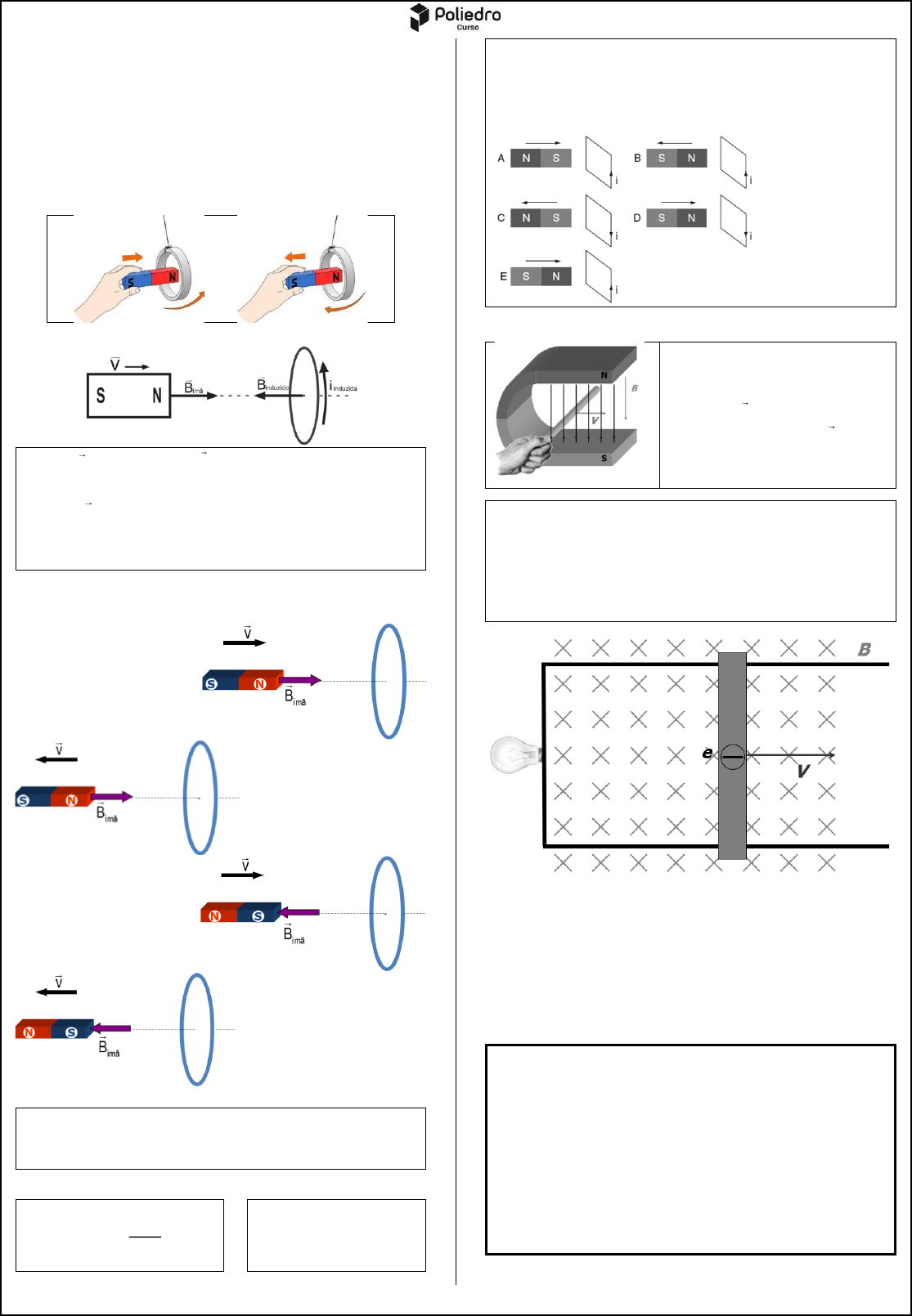 Aviso Legal: Os materiais e conteúdos disponibilizados pelo Poliedro são protegidos por direitos de propriedade intelectual (Lei nº 9.610/1998). É vedada a utilização para fins comerciais, bem como a cessão dos materiais a terceiros, a título gratuito ou não, sob pena de responsabilização civil e criminal nos termos da legislação aplicável. 2 4. CONCEITO DA LEI DE LENZ: Para determinar o sentido da corrente induzida em uma espira condutora, Lenz usou o conceito de ________________ _______________. Experimentalmente, ele percebeu que ao _______________ um ímã de uma espira, esta tentava __________ o ímã, e, ao __________ o ímã da espira, notava- se uma força que tentava ___________ as peças, se ________ ao movimento, como uma reação natural (___________). Observe o mapa mental a seguir: um ímã ( ímãB ) é aproximado ( v ) de uma espira→ a espira reage e tenta repelir o movimento do ímã→ surge na espira um campo induzido ( induzidoB )→ pela regra da mão direita podemos encontrar o sentido da corrente induzida ( induzidai ) que produziu este campo induzido. Obs: a induzidai veio da εinduzida . 5. CASOS DA LEI DE LENZ: Determine o sentido da corrente induzida em cada caso: Conclusão: A Lei de Faraday-Neumann-Lenz fica, finalmente: . t Δ ε Δ = Ф Exercício 03: (PUC-RS) Aproximando ou afastando um imã de uma espira condutora retangular, a variação do fluxo de indução magnética determina o aparecimento de uma corrente elétrica induzida i. Qual a figura que melhor representa a corrente elétrica induzida? 6. INDUÇÃO EM CONDUTORES EM MOVIMENTO Vamos considerar uma barra condutora, de comprimento (L), sendo movimentada com uma velocidade ( v ), submetida a ação de um campo magnético ( B ). Essa barra ficará induzida com f.e.m. L.B.vε = (em volts) Guia de estudos: Semana 25: Indução eletromagnética No livro Física - VOLUME 3, Frente 2, Capítulo 9. Ler página 126 até 130. Estudar o exercício resolvido 3 e 4. Fazer, seguindo a ordem: Propostos: 37, 26, 53, 47, 50, 62, 43, 44, 27, 30, 34, 39, 52, 38, (45, 56, 57). Complementares: 9, 14, 18, 22, 10, 11, 32, (37, 20). BNCC em foco: 2, (1). oposição magnética aproximar repelir afastar atrair opondo Felástica fat Highlight A natureza é contra variações 1 Campo Magnético Gerado por Corrente Elétrica “Eletromagnetismo” Experiência de Oersted Campo ao redor de fio retilíneo Experiência de Oersted Oersted esticou um fio metálico sobre uma bússola (fig. 1) e fez passar nele uma corrente contínua (fig. 2). Em seguida a agulha da bússola se movimentou comprovando a existência do campo magnético. Campo Magnético ao redor de um fio condutor retílineo Ao redor de um condutor retilíneo percorrido por uma corrente elétrica existe um campo magnético cujas linhas de força são circunferências concêntricas ao fio. Linhas de Indução 1 2 3 4