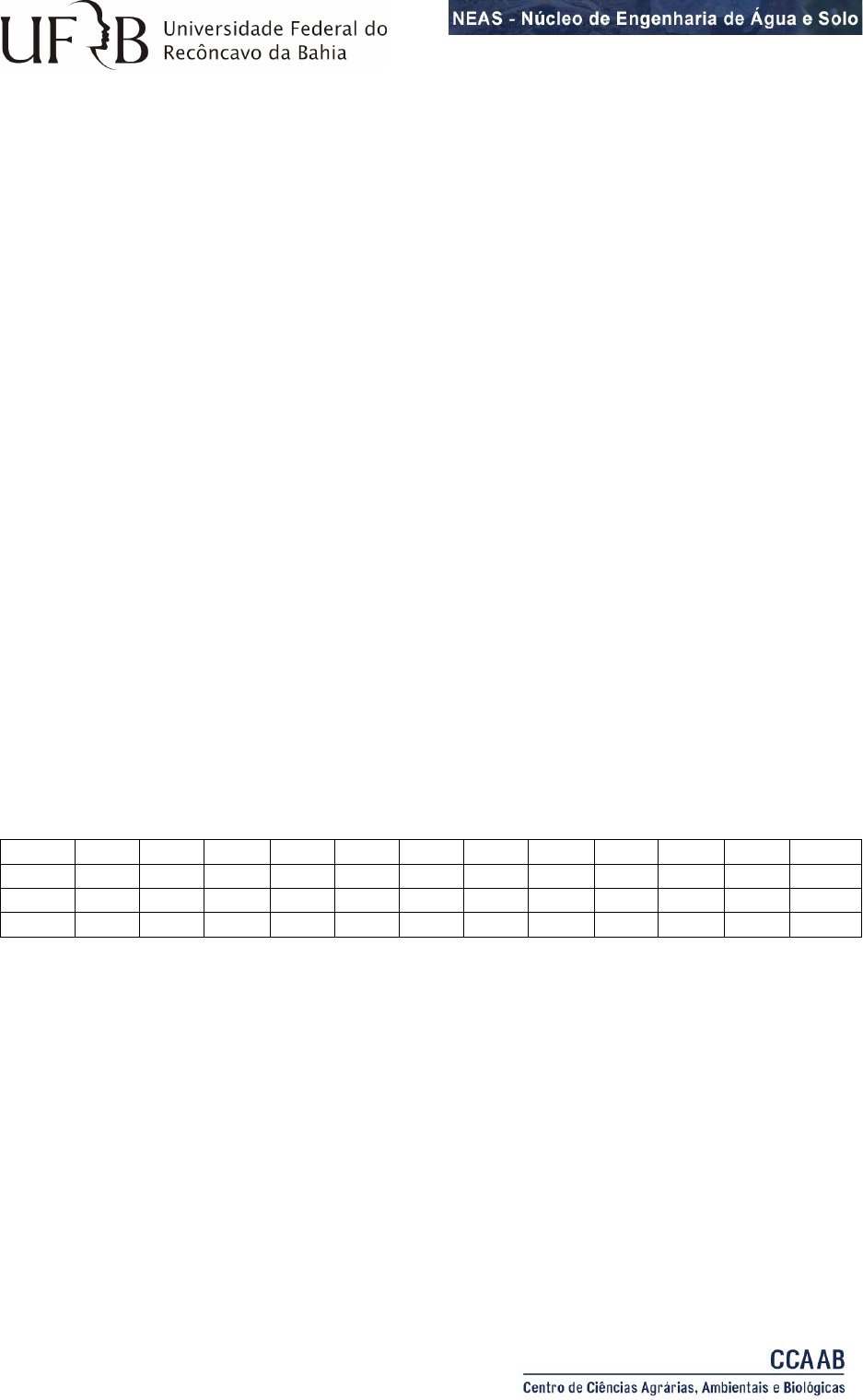 www.ufrb.edu.br/neas +55 (75) 3621-2798 Rua Ruy Babosa, 710 – Campus Universitário CEP 44380-000 – Cruz das Almas - BA 1. Estudar o capítulo 2 “Relação Solo-Água-Planta e Atmosfera” do livro Manual de Irrigação (Salassier Bernardo). 2. Em dada localidade, em certo dia, a evapotranspiração potencial de referência é 5,3mm/dia. Neste mesmo dia, quais as evapotranspirações máximas para outras culturas com coeficientes de cultura de 0,4;0,8;1,0 e 1,2? 3. Qual o valor de ETo estimado pelo método de Thornthwaite, para uma localidade no Equador, de temperatura média 25oC, para um período de 7 dias, em setembro, quando a temperatura média do ar para o período em questão é de 24oC? 4. Um tanque de evaporação tipo Classe A, tem uma bordadura de grama 8m. Em um dia no qual ele perdeu 6,7 mm, a umidade relativa foi sempre maior que 75% e o vento moderado. Qual o valor de ETo? 5. Sabendo-se que a ETp de uma determinada região é 4,5 mm/dia e que o Kc da cultura é 1,1, calcule a lâmina líquida necessária para essa cultura. 6. Determinar a evapotranspiração de referência para a localidade de Cruz das Almas – Bahia localizada a 12º40´Sul pelo método de Thorntwaite, sabendo-se que a temperatura normal (ºC) tem a seguinte distribuição ao longo do ano: JAN = 26,3 FEV = 26,5 MAR = 26,4 ABR = 25,1 MAI = 23,8 JUN = 22,5 JUL = 21,8 AGO = 22,0 SET = 23,0 OUT = 24,5 NOV = 25,5 DEZ = 26,0 Média anual = 24,5 (ºC) ETPp = 16 (10 Ti/I)a Ti>0oC a = 6,75.10-7.I3 – 7,71.10-5.I2 + 1,7912.10-2.I + 0,49239 I = som (i=1 até 12) (0,2.Ti)1,514, Ti>0oC Duração máxima de insolação diária (N), em horas nos meses e latitude. Os valores correspondem ao 15o dia de cada mês. Lat. JAN FEV MAR ABR MAI JUN JUL AGO SET OUT NOV DEZ 12oS 12,7 12,5 12,2 11,8 11,6 11,4 11,5 11,7 12,0 12,1 12,7 12,8 14oS 12,8 12,6 12,2 11,8 11,5 11,3 11,4 11,6 12,0 12,1 12,8 12,9 20oS 13,2 12,8 12,2 11,6 11,2 10,9 11,0 11,4 12,0 12,5 13,2 13,3