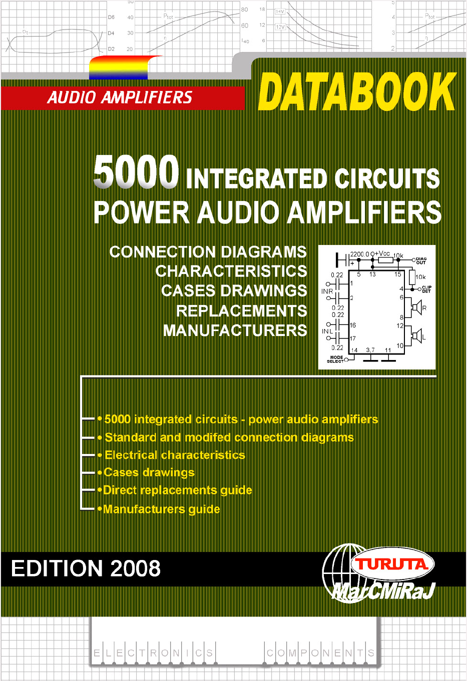 Eugene Turuta 5000 Inte5000 Inte5000 Inte5000 Inte5000 Integggggrrrrraaaaated Cirted Cirted Cirted Cirted Circuits-cuits-cuits-cuits-cuits- popopopopowwwwwer audio amplifer audio amplifer audio amplifer audio amplifer audio amplifierierierieriersssss databook Introduction 3 Power audio amplifiers schematics of connections 5 Electrical characteristics tables 363 Case drawings. Case Index 431 Logos, contact info and web-adresses of integrated circuits powe raudio amplifiers manufacturers 449 SMD marking codes for power audio amplifiers in SMD cases 459 Functional index 463 Alphanumeric index 501 Toronto, 2008 edition 3 INTRODUCTION One of the basic components of any sound-reproducing system, without dependence from its class is the power amplifier of audio frequencies called also the power audio amplifier. With reference to consumer and professional electronics equipments, the greatest popularity are the integrated circuits-power audio amplifiers, due to their advantages - schematic simplicity, small dimensionss, large range of output powers, polyfunctionality. For correct usage of integrated circuits of the power audio amplifiers, irresepective of a field of application, it is necessary to know following: - Function of integrated circuit; - The main electrical characteristics; - Schematic of connection and (or) internal structure; - Package type; - Equivalents (replacements). In the literature, the great many of the characteristics which one describe the electrical and operational param- eters of power audio amplifiers depending on evaluation yardsticks and can give completely different estimations to quality of operation of a amplifiers. Main of parameters used for the description of power audio amplifiers is following: a gain; a bandwidt; a dynamic (phase, phase-frequency, peak (amplitude)) characteristic; linear and nonlinear distortions; efficiency; input characteristics (impedance, current, voltage and power, impedance of a source of an input sound signal); output characteristics (impedance, current, voltage, output power); a dinamic range; signal- to-noise ratio and maximum ratings of electrical parameters. The gain Gv (on a current, a voltage or power, depending on purpose of the amplifier) represents the logarithm of the ratio of signal output from a amplifier to signal input to the amplifier. The gain Gv can be expressed as a direct ratio (V/mV or V/µV), and in the logarithmic relation (in decibels -dB). The gain depends on value of external compo- nents, from resistance of loading Rl, input resistance Rin, a supply voltage Vcc, frequency and temperature. The frequency bandwidt Bw - area of frequencies (a bandwidt from bottom limit frequency Fl up to top fre- quency Fh) within the gain changes no more than on ±3 dB, concerning gain measured on frequency 1 KHz. In the certain cases when the manufacturer wants to emphasize the expanded range of working frequencies of the amplifier at the improved non-uniformity frequency characteristics, the size of non-uniformity (1 dB, 0,5 dB etc.) is indicated also. Instead of a frequency bandwidt, sometimes defined a frequency bandwidt at gain equal to unit or a power frequency bandwidt. The frequency bandwidt at gain equal to unit is an interval of frequencies on which borders the gain values equal to unit. The power frequency bandwidt is an interval of frequencies within the limits of which at the certain factor of distortions k, output power changes no more, than on ±3 dB in relation to output power on frequency in 1 KHz. The dinamic range determines a ratio between maximum output and input tension of the amplifier. The ratio usually expresses in decibels and represents (in a theoretical case) a linear function. The frequency characteristics determines relation of a gain of amplifier to frequency; phase characteristics - the phase shift of an output signal on relation to input signal (in frequency function of an input signal). The frequency - phase characteristic summarizes frequency and phase characteristics of the amplifier in the field of a range of reproduced frequencies. All amplifiers alter input signals, generally in two ways: they make them stronger (amplify) them, and they add characteristics which did not exist in the original signal. These undesirable characteristics are lumped together and called distortion. Noise can be considered a type of distortion. One common type of distortion is harmonic distortion. Harmonics of a signal are signals which are related to the original (or fundamental) by an integer (non decimal) number. A pure tone (sinewave) signal has no harmonics; it consists of only one single frequency. If pure tone signal was applied to the input of an amplifier, we would (upon measurement with special test equipment) find that the output signal of the amplifier was no longer pure. Careful measurements would likely show that several �new� frequencies have appeared. These new frequencies are almost certainly to be integer multiples of the original tone; they are the harmonics of the original signal. In a good amplifier, the harmonics will be much weaker than the original tone. By much weaker, we mean on the order of a thousand times for decent amplifiers. Intermodulation distortion is the second �major� type of distortion that is often specified for amplifiers. Intermodulation distortion is much more objectionable to the human ear, because it generates non-harmonically related �extra� signals which were not present in the original. Basically, two pure tones are simultaneously applied to the input of the amplifier. If the amplifier were perfect, the two tones (and only the two tones) would be present at the amplifier output. In the real world, the amplifier would have some harmonic distortion (as described above), but careful observation of the output signal (using laboratory equipment) would reveal that there are a number of new tones present which cannot be accounted for as a result of harmonic distortio