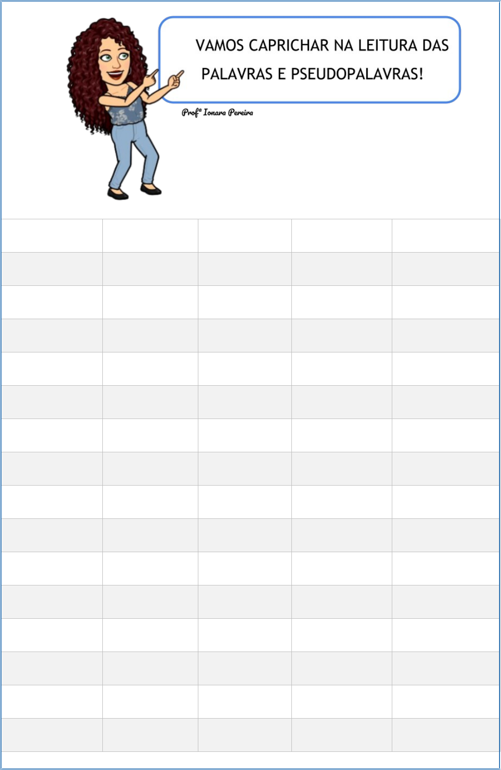 PALAVRAS: VAGO CABELO GATO CAMISA SETA LUVA MESA CANELA PEPINO FELINO LEGUME DEMORA CARECA SINO NATUREZA SOFÁ BUZINA VILA CIDADE BOCEJO MATEMÁTICA XÍCARA MICO PERFUMARIA DOMINÓ ESCRITORA HABITANTE VOGAL DEZ VOLANTE MOLHADO PEDAÇO MÉDICO PINTOR DÚVIDA FEIJÃO DEZENA PIMENTÃO BOLSA PINTURA TERRAÇO TORRE PEDIDO PEÇA TRAVESSEIRO OBRA VISÃO FRUTEIRA MEL ÔNIBUS PIJAMA BANHEIRO BATATA SÓ ÓLEO FLOR CONSULTA MÊS PAISAGEM CERTO HORTELÃ PESSOA FREIO CLÍNICA ESPUMA LOCOMOTIVA DUPLA ESPONJA DANÇA PÉ FUBÁ RÃ IRMÃO ABELHA POÇO MARACUJÁ EQUIPE VASILHA RÉ UMBIGO PSEUDOPALAVRAS: PAPE RACO GUROTE COPEFA JELE CAFOVA TIDE RERO LAFA MIDEMO FUNALA REBA VIMO ROPA GILANO INSITONA GONANTE BOLOTERAL RÁ FURGO ADELVO CE DRUDO CHISO CARMEVEL TEGINA RI PEFE MUREVE REMUVATO PRERA CASIGIRA SEDOLIDO ICRE VICOVEL GLUPADO CESVA GECAL VIFAÇÃO CAMACULO MOCARA CIM ADENQUE NANCIL GROPEDO BU PIVOGA TAPUCHO GREL PLUCO ATANO FIASE BARTUTILE NECRU FEM DESSITOLE MEPITA FARLOVAL REDUPO LOZ [ ] [ ] [ ] [ ] Professora Ionara Pereira