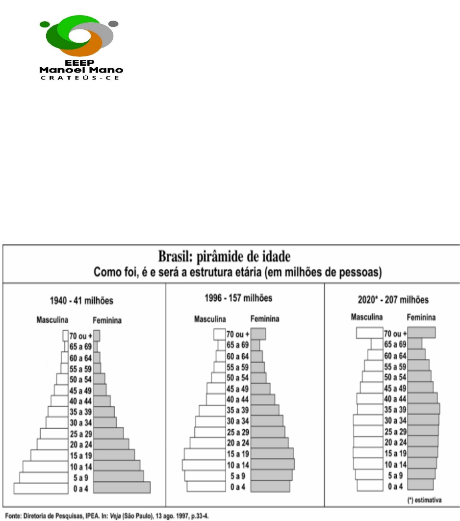 TRABALHO DE GEOGRAFIA PROFESSOR : EMERSON TELES VIANA 2º ANO NÍVEL MÉDIO. Nome : nº Turma: QUESTÃO 1 Analise as pirâmides etárias a seguir e responda às questões propostas. a) O que é pirâmide etária ou de idades? b) O que as pirâmides apresentadas acima revelam a respeito da dinâmica demográfica brasileira? C) Qual a importância das pirâmides etárias para os órgãos públicos e para as empresas de planejamento QUESTÃO 2 -Leia o texto abaixo e responda às questões propostas sobre movimentos migratórios internacionais. "Em 2001, segundo dados da ONU, cerca de 175 milhões de pessoas residiam fora de seu país de origem, o que equivale a aproximadamente 3% da população mundial, percentual que duplicou desde 1970. " MOREIRA, J. C.; SENE, E. Geografia geral e do Brasil. São Paulo: Scipione, 2003. p. 438. a) Quais os principais motivos que desencadeiam os movimentos migratórios? b) Quais os principais pólos mundiais de atração populacional na atualidade? Questão 03 -Leia os seguintes itens e responda : a) Explique de que maneira as transformações do comportamento reprodutivo se relacionam com a economia. c) Qual é a diferença entre refugiado e emigrante? Por que é importante diferenciar esses dois grupos. Questão 04-Observe a letra da canção abaixo: Nas grandes cidades do pequeno dia-a-dia O medo nos leva a tudo, sobretudo a fantasia Então erguemos muros que nos dão a garantia De que morreremos cheios de uma vida tão vazia Nas grandes cidades de um país tão violento Os muros e as grades nos protegem de quase tudo Mas o quase tudo quase sempre é quase nada E nada nos protege de uma vida sem sentido (Engenheiros do Hawaii – “Muros e Grades”) Nos versos acima, há alguns apontamentos referentes a alguns problemas urbanos, dentre os quais podemos mencionar: a) a crescente desorganização e descentralização das cidades b) a violência familiar e o aumento de sequestros em domicílios c) a onda de protestos que marcou o Brasil a partir de maio de 2013. d) a violência urbana e o baixo padrão de vida sociocultural contemporâneo. e) a banalização da cultura televisiva especialmente exibida para a população das cidades. 5- O processo de urbanização nos países desenvolvidos aconteceu de forma lenta e gradual, de maneira que houve uma estruturação das cidades e um investimento em políticas de emprego e renda para a população. Por sua vez, nos países subdesenvolvidos, a urbanização foi caracterizada pelo: A) emprego de mão de obra escrava na construção civil. B) aumento da oferta de mão de obra qualificada na indústria. C) fomento de políticas públicas para habitação social. D) crescimento rápido e desordenado dos centros urbanos. E) investimento na expansão de monoculturas de exportação. 06-Leia com atenção a notícia que se segue: França pagará 750 euros mensais por terceiro filho O governo francês irá pagar uma licença de 750 euros (cerca de R$ 2.050,00) por mês durante um ano a famílias que decidirem ter um terceiro filho, anunciou ontem o primeiro ministro do país, Dominique Villepin. Folha de S. Paulo, 23/09/2005. Folha mundo, p. A-16. A medida anunciada pelo governo francês está diretamente relacionada: a) à política anti-imigração (xenófoba) e de purificação racial adotada pela França nas últimas décadas. b) às elevadas taxas de natalidade verificadas no país e em toda a Europa. c) à sobrecarga no sistema de previdência social francês, em que um número cada vez menor de jovens precisa sustentar um número cada vez maior de aposentados. d) à aproximação do governo francês com as ideias da Igreja Católica, que proíbe o uso de métodos contraceptivos não naturais. e) à ideia imperialista de que o poderio econômico de uma nação está diretamente ligado ao tamanho de sua população. 07 -Existem duas formas principais de se abordar o quantitativo populacional em um espaço. De um lado temos as taxas de __________________, que representam o número de habitantes por quilômetro quadrado; de outro, temos as taxas de __________________, que estão relacionais ao número de habitantes independente do tamanho do território. A alternativa que completa corretamente as lacunas acima é: a) densidade demográfica e superpovoamento b) crescimento vegetativo e população absoluta c) população local e população geral d) densidade demográfica e população absoluta e) crescimento vegetativo e população geral. 08-- Leia a Pirâmide etária : A evolução da pirâmide etária apresentada indica a seguinte tendência: A) Crescimento da faixa juvenil. B) Aumento da expectativa de vida. C) Elevação da taxa de fecundidade. D) Predomínio da população masculina. E) Expansão do índice de mortalidade. 09- o que se entende por migração clandestina e migração legal ? 10- o que é Xenofobia ? quais suas principais problemáticas na sociedade ? BOM DESEMPENHO ! LEMBRE-SE QUE SUA PESQUISA PODERÁ SER FEITA PELO LIVRO E CADERNO ,PORÉM SE FAZ NECESSÁRIO REFLETIR NAS QUESTÕES POIS AS MESMAS NÃO SÃO DECORATIVAS .