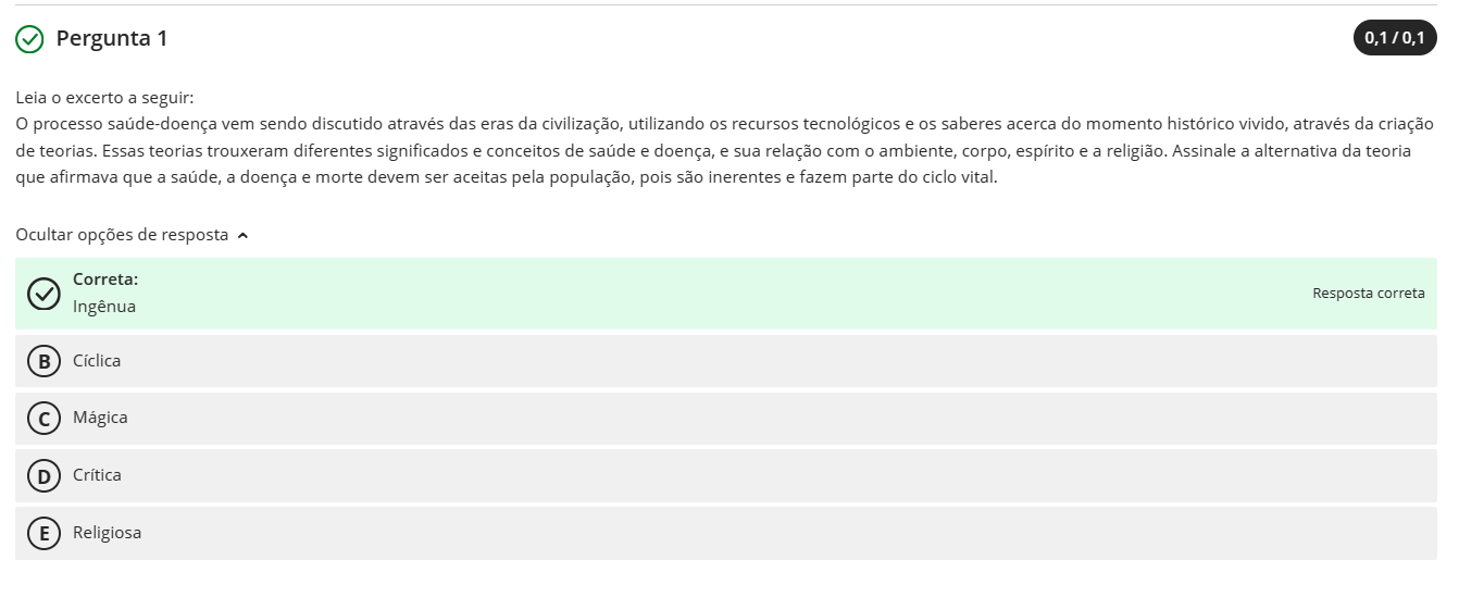 Leia excerto a seguir: o processo saúde-doença vem sendo discutido através das eras da civilização, utilizando os recursos tecnológicos e os saberes acerca do momento histórico vivido, através da criação de teorias. Essas teorias trouxeram diferentes significados e conceitos de saúde e doença, e sua relação com ambiente, corpo, espírito e a religião. Assinale a alternativa da teoria que afirmava que a saúde, a doença e morte devem ser aceitas pela população, pois são inerentes e fazem parte do ciclo vital.
