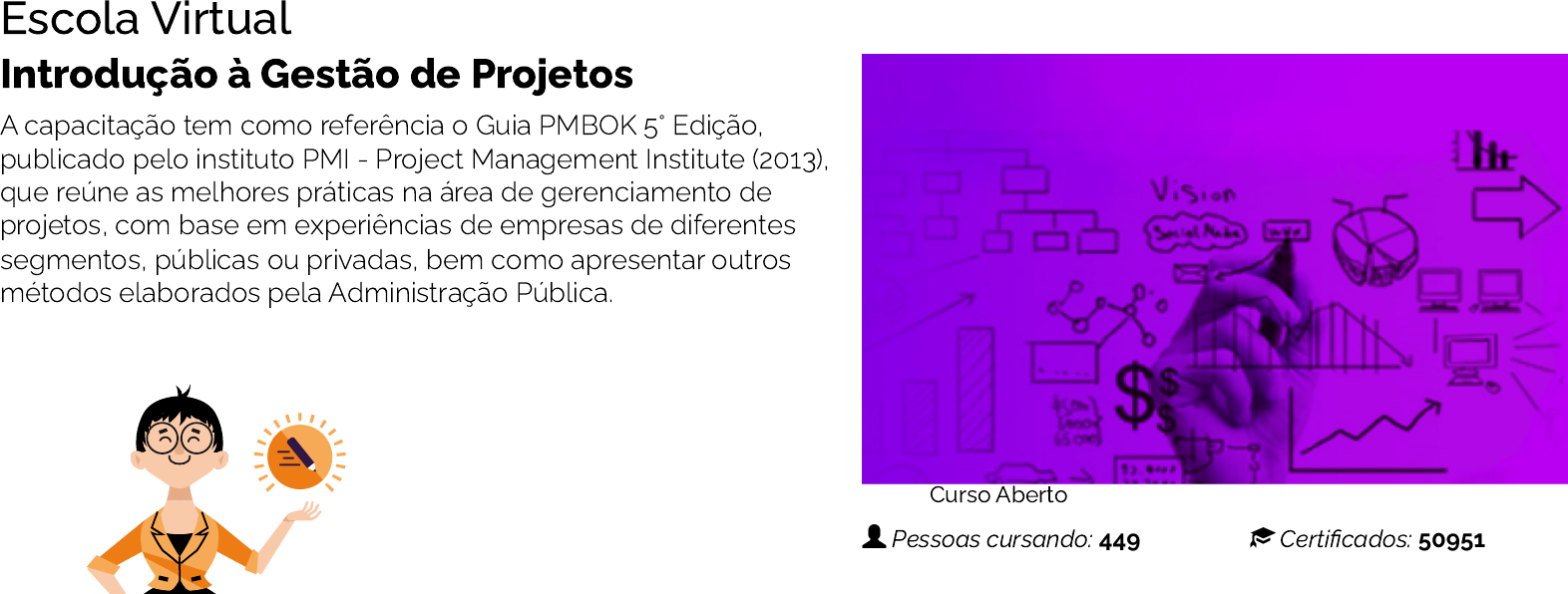 Escola Virtual Introdução à Gestão de Projetos A capacitação tem como referência o Guia PMBOK 5° Edição, publicado pelo instituto PMI - Project Management Institute (2013), que reúne as melhores práticas na área de gerenciamento de projetos, com base em experiências de empresas de diferentes segmentos, públicas ou privadas, bem como apresentar outros métodos elaborados pela Administração Pública. Curso Aberto Pessoas cursando: 449 Certi�cados: 50951 https://www.escolavirtual.gov.br/ OFERTA CONTEUDISTA Conselho Nacional de Justiça CERTIFICADOR Enap - Escola Nacional de Administração Pública CARGA HORÁRIA 20h DISPONIBILIDADE 20 dias IDIOMA Português PÚBLICO ALVO Agentes públicos federais, municipais e estaduais que atuem no gerenciamento de projetos das organizações. Curso aberto, gratuito e com certi�cado, qualquer pessoa pode se inscrever. CONTEÚDO PROGRAMÁTICO OUTRAS INFORMAÇÕES Você pode inscrever-se a qualquer momento e iniciar imediatamente. Realize o seu cadastro ou faça o seu login no botão Entrar (/login). Veri�que no campo Público-Alvo se este curso é aberto ou restrito a um público especí�co. Este curso faz parte das seguintes CERTIFICAÇÕES: 1 Contextualização 1.1 História do gerenciamento de projetos 1.2 Fontes de conhecimento sobre gerenciamento de projetos 1.3 Projeto e Operação 1.4 Gerenciamento de projetos 1.5 Programa e Portfólio 2 Conceitos básicos 2.1 Partes interessadas 2.2 Competências necessárias ao líder/gerente de projetos 2.3 Estilos de gerência 2.4 Estrutura organizacional 2.5 Escritório de gerenciamento de projetos 2.6 Áreas de conhecimento e grupos de processos 2.7 Ciclo de vida de um projeto 2.8 Fases do projeto 2.9 Metodologias e ferramentas 3 Grupos de processos e gerenciamento de projetos 3.1 Iniciação do projeto 3.2 Planejamento 3.3 Execução 3.4 Monitoramento e Controle 3.5 Encerramento MULTIPLICADORES - PLATAFORMA +BRASIL - NÍVEL II (HTTPS://WWW.ESCOLAVIRTUAL.GOV.BR/PROGRAMA/86) 1 https://www.escolavirtual.gov.br/login https://www.escolavirtual.gov.br/login https://www.escolavirtual.gov.br/programa/86