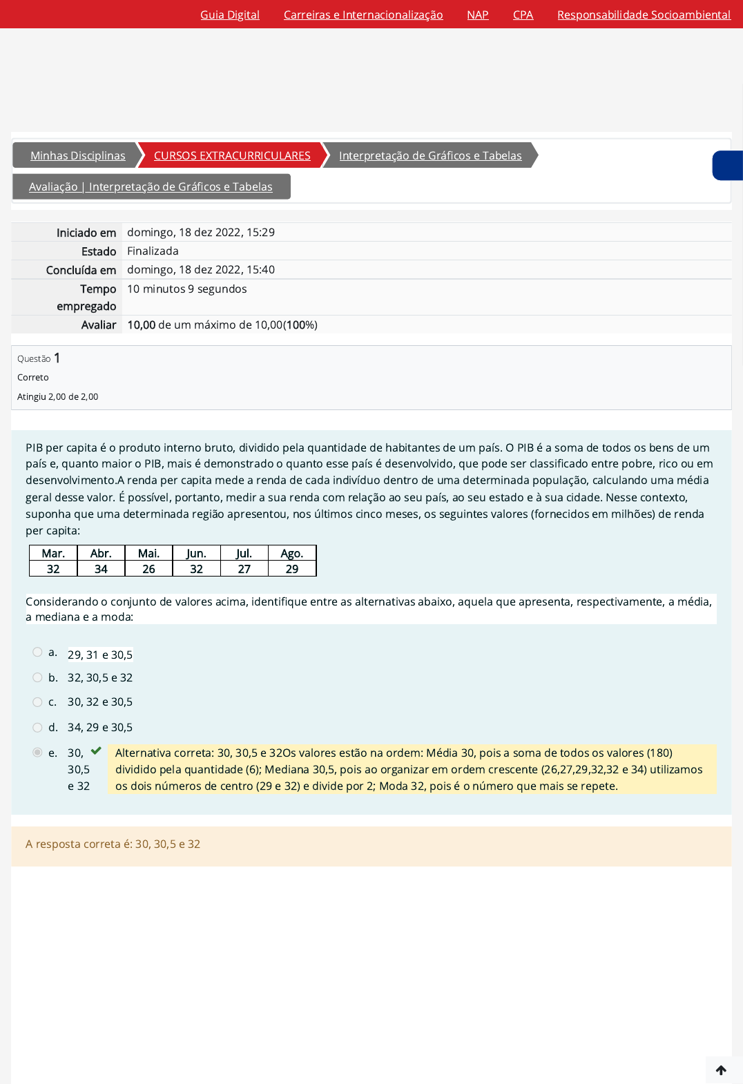18/12/2022 15:42 Avaliação | Interpretação de Gráficos e Tabelas: Revisão da tentativa https://ambienteacademico.com.br/mod/quiz/review.php?attempt=1740786&cmid=213891 1/4 Minhas Disciplinas CURSOS EXTRACURRICULARES Interpretação de Grá�cos e Tabelas Avaliação | Interpretação de Grá�cos e Tabelas Iniciado em domingo, 18 dez 2022, 15:29 Estado Finalizada Concluída em domingo, 18 dez 2022, 15:40 Tempo empregado 10 minutos 9 segundos Avaliar 10,00 de um máximo de 10,00(100%) Questão 1 Correto Atingiu 2,00 de 2,00 PIB per capita é o produto interno bruto, dividido pela quantidade de habitantes de um país. O PIB é a soma de todos os bens de um país e, quanto maior o PIB, mais é demonstrado o quanto esse país é desenvolvido, que pode ser classi�cado entre pobre, rico ou em desenvolvimento.A renda per capita mede a renda de cada indivíduo dentro de uma determinada população, calculando uma média geral desse valor. É possível, portanto, medir a sua renda com relação ao seu país, ao seu estado e à sua cidade. Nesse contexto, suponha que uma determinada região apresentou, nos últimos cinco meses, os seguintes valores (fornecidos em milhões) de renda per capita: Mar. Abr. Mai. Jun. Jul. Ago. 32 34 26 32 27 29 Considerando o conjunto de valores acima, identi�que entre as alternativas abaixo, aquela que apresenta, respectivamente, a média, a mediana e a moda: a. 29, 31 e 30,5 b. 32, 30,5 e 32 c. 30, 32 e 30,5 d. 34, 29 e 30,5 e. 30, 30,5 e 32 Alternativa correta: 30, 30,5 e 32Os valores estão na ordem: Média 30, pois a soma de todos os valores (180) dividido pela quantidade (6); Mediana 30,5, pois ao organizar em ordem crescente (26,27,29,32,32 e 34) utilizamos os dois números de centro (29 e 32) e divide por 2; Moda 32, pois é o número que mais se repete. A resposta correta é: 30, 30,5 e 32 Guia Digital Carreiras e Internacionalização NAP CPA Responsabilidade Socioambiental https://ambienteacademico.com.br/my/ https://ambienteacademico.com.br/course/view.php?id=9158 https://ambienteacademico.com.br/course/view.php?id=9158§ion=3 https://ambienteacademico.com.br/mod/quiz/view.php?id=213891 https://codely-fmu-content.s3.amazonaws.com/Moodle/GuiaDigital/Guia+digital/index.html https://informa.fmu.br/carreiras/ https://codely-fmu-content.s3.amazonaws.com/Moodle/NAP/inicial/nap/fmu/index.html https://codely-fmu-content.s3.amazonaws.com/Moodle/CPA/landing_CPA/index.html https://portal.fmu.br/sustentabilidade 18/12/2022 15:42 Avaliação | Interpretação de Gráficos e Tabelas: Revisão da tentativa https://ambienteacademico.com.br/mod/quiz/review.php?attempt=1740786&cmid=213891 2/4 Questão 2 Correto Atingiu 2,00 de 2,00 Questão 3 Correto Atingiu 2,00 de 2,00 Suponha que determinado jornal publicou uma matéria sobre as eleições presidenciais de 2018, com a seguinte tabela sobre a pesquisa (dados �ctícios): Regiões Bolsonaro Alckmin Marina Nordeste 2º 1º 3º Norte 1º 2º 3º Sudeste 2º 1º 3º Centro-oeste 2º 1º 2º Sul 2º 1º 2º “No primeiro turno da eleição presidencial de 2018, o candidato governista, Geraldo Alckmin, venceria já no primeiro turno. ” Pelas pesquisas, ele está em 1º lugar nas pesquisas eleitorais. A variável “1º lugar” é classi�cada como: a. Variável qualitativa nominal b. Variável qualitativa ordinal Alternativa correta: Variável qualitativa ordinal. É uma variável qualitativa ordinal porque está classi�cando o dado em ordem de grandeza. c. Variável quantitativa discreta d. Variável quantitativa contínua e. Variável quantitativa ordinal A resposta correta é: Variável qualitativa ordinal As variáveis podem ser classi�cadas em qualitativas ou quantitativas e referem-se aos valores que assumem determinadas características dentro de uma pesquisa. A partir disso, identi�que entre as alternativas abaixo, aquela que obedece a uma relação de ordem: a. Qualitativa ordinal. Alternativa correta: Qualitativa ordinal. Existe uma ordenação entre as categorias. Exemplos: escolaridade (1º, 2º, 3º graus), estágio da doença (inicial; intermediário; terminal) etc.As variáveis qualitativas podem ser ordinais e nominais. As nominais não estão relacionadas à ordem, elas são identi�cadas apenas por nomes, por exemplo, as cores: vermelho, amarelo, preto, azul, rosa, verde etc. b. Variável qualitativa discreta c. Quantitativa ordinal d. Variável qualitativa numérica e. Variável quantitativa nominal A resposta correta é: Qualitativa ordinal. Guia Digital Carreiras e Internacionalização NAP CPA Responsabilidade Socioambiental https://codely-fmu-content.s3.amazonaws.com/Moodle/GuiaDigital/Guia+digital/index.html https://informa.fmu.br/carreiras/ https://codely-fmu-content.s3.amazonaws.com/Moodle/NAP/inicial/nap/fmu/index.html https://codely-fmu-content.s3.amazonaws.com/Moodle/CPA/landing_CPA/index.html https://portal.fmu.br/sustentabilidade 18/12/2022 15:42 Avaliação | Interpretação de Gráficos e Tabelas: Revisão da tentativa https://ambienteacademico.com.br/mod/quiz/review.php?attempt=1740786&cmid=213891 3/4 Questão 4 Correto Atingiu 2,00 de 2,00 Média, moda e mediana são medidas obtidas de conjuntos de dados que podem ser usadas para representar todo o conjunto. A tendência dessas medidas é resultar em um valor central. Por essa razão, elas são chamadas de medidas de centralidade. Fonte: https://brasilescola.uol.com.br/matematica/moda-media-mediana.htm O grá�co a seguir demonstra o acompanhamento das vendas por país.Assim, identi�que entre as alternativas abaixo, aquela que apresenta a média e mediana, respectivamente: Fonte: https://www.google.com.br/search?q=gra�cos&rlz a. 137,80 e 108,50 Alternativa correta: 137,80 e 108,50Média: 459 + 166 + 150 + 149 + 109 + 108 + 79 + 59 + 52 + 47 = 1378/10=137,80Mediana: 459, 166, 150, 149, 109, 108, 79, 59, 52 e 47 = 217/2=108,50 b. 140,80 e 118,50 c. 107,50 e 108,50 d. 147,80 e 138,50 e. 139,50 e 158,50 A resposta cor