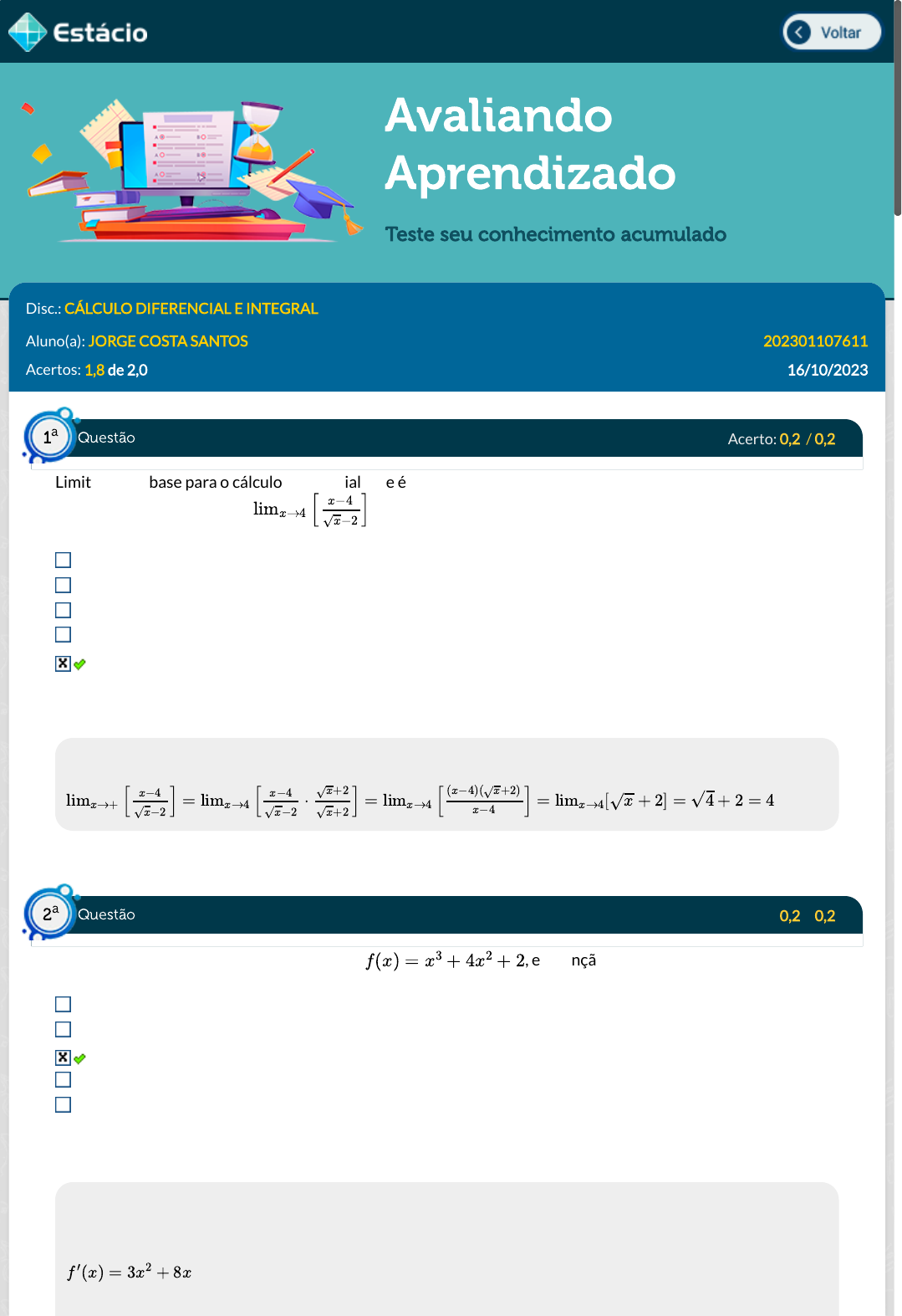 Avaliando Aprendizado Teste seu conhecimento acumulado Disc.: CÁLCULO DIFERENCIAL E INTEGRAL Aluno(a): JORGE COSTA SANTOS 202301107611 Acertos: 1,8 de 2,0 16/10/2023 Acerto: 0,2 / 0,2 Limites são a base para o cálculo diferencial, que é empregado em diversas situaçöes e áreas do saber. Dessa forma, a resolução do limite é: -2. 1/2. -3. -1/2. 4. Respondido em 16/10/2023 18:32:52 Explicação: Acerto: 0,2 / 0,2 Determine a taxa de crescimento da função , em função de x, no ponto x=2 12. 16. 28. 20. 0. Respondido em 16/10/2023 18:36:36 Explicação: Calculando a derivada da função em x: , Substituindo o ponto x = 2, limx→4 [ ]x−4 √x−2 limx→+ [ ] = limx→4 [ ⋅ ] = limx→4 [ ] = limx→4[√x + 2] = √4 + 2 = 4x−4 √x−2 x−4 √x−2 √x+2 √x+2 (x−4)(√x+2) x−4 f(x) = x3 + 4x2 + 2 f ′(x) = 3x2 + 8x Questão1 a Questão2 a https://simulado.estacio.br/alunos/inicio.asp https://simulado.estacio.br/alunos/inicio.asp javascript:voltar(); javascript:voltar();