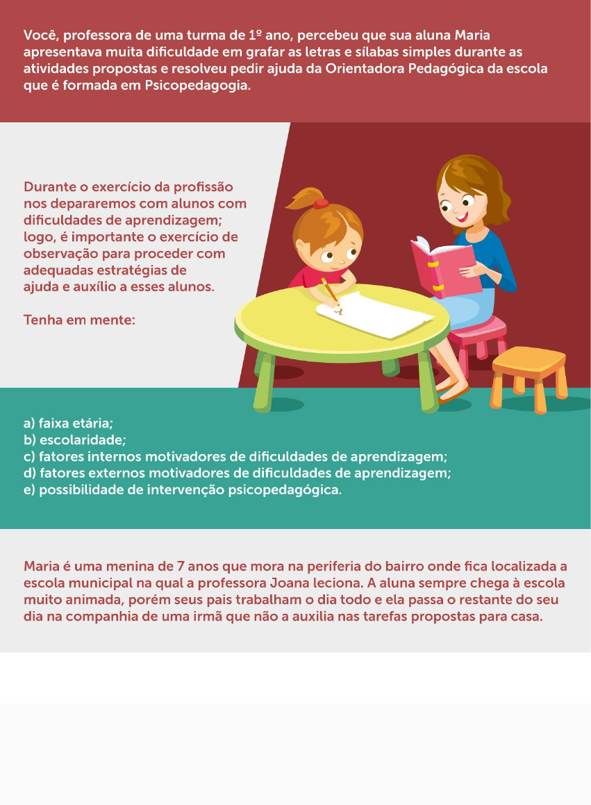 Desafio A intervenção psicopedagógica, assim como as dificuldades de aprendizagem, é uma situação na qual o psicopedagogo coloca seus conhecimentos à prova, uma vez que estará inserido em seu campo de atuação, na busca pela resolução dos conflitos de aprendizagem. Acompanhe a seguir uma situação que a você, enquanto professora de ma turma de 1º ano, idenfificou com uma de suas alunas: Aponte quais atividades podem ser desenvolvidas com Maria para que ela supere as dificuldades iniciais na aquisição da escrita e da leitura. Sua resposta Com base na imagem fornecida, que retrata uma criança escrevendo de forma invertida, possivelmente espelhando as letras, é importante desenvolver atividades específicas para auxiliar Maria a superar suas dificuldades iniciais na aquisição da escrita e da leitura. Aqui estão algumas sugestões de atividades: Exercícios de consciência fonológica: Realizar atividades que envolvam a identificação e manipulação dos sons das palavras, como jogos de rimas, segmentação de sílabas e identificação de fonemas. Prática de escrita correta: Oferecer folhas pautadas e orientar Maria a escrever as letras e palavras corretamente, destacando a direção da escrita da esquerda para a direita e de cima para baixo. Utilizar modelos de letras para que ela possa copiá-las corretamente. Atividades de discriminação visual: Propor jogos e exercícios que estimulem a percepção visual, como identificar diferenças entre letras e palavras, encontrar letras específicas em um texto ou em um conjunto de letras embaralhadas. Utilização de recursos táteis e manipulativos: Utilizar materiais sensoriais, como areia, massinha ou letras magnéticas, para que Maria possa explorar as letras de forma tátil e visual, auxiliando na memorização e reconhecimento das mesmas. Leitura compartilhada: Realizar sessões de leitura compartilhada, onde Maria acompanha a leitura de histórias por parte do professor ou dos colegas, incentivando-a a associar os sons das palavras com suas representações escritas. Reforço positivo e apoio emocional: Oferecer incentivo e elogios sempre que Maria demonstrar esforço e progresso em suas atividades de escrita e leitura. Além disso, proporcionar um ambiente acolhedor e seguro, onde ela se sinta à vontade para expressar suas dificuldades e receber apoio emocional. Essas atividades devem ser adaptadas de acordo com as necessidades específicas de Maria e podem ser realizadas de forma individualizada ou em pequenos grupos, de modo a proporcionar um ambiente de aprendizagem estimulante e inclusivo. É importante também envolver os pais ou responsáveis no processo, para que possam oferecer suporte adicional em casa. Enviado em: 20/03/2024 20:01 Padrão de resposta esperado É fundamental a percepção do aluno sobre o que ele considera, efetivamente, como intervenção diagnóstica e dificuldade de aprendizagem. Podem ser propostas inicialmente atividades que envolvam a coordenação motora fina como alinhavo, psicomotricidade sobre linhas sinuosas e manipulação de massa de modelar para formar as letras. Posteriormente podem ser utilizados jogos com letras para formas sílabas, dominós para identificação de um objeto e a letra inicial que o represente além de pequenas fichas de leitura ilustradas. Exercícios 1. De acordo com a conceitualização internacional, as dificuldades de aprendizagem se caracterizam por: A. Funcionamento abaixo do esperado, não interferindo no rendimento escolar do aluno ou no seu cotidiano. B. Funcionamento acima do esperado, não interferindo no cotidiano do aluno. C. Funcionamento normal do desenvolvimento, sem interferências no rendimento escolar do aluno. D. Funcionamento abaixo do esperado, interferindo no rendimento escolar do aluno ou em seu cotidiano. E. Funcionamento acima do esperado, interferindo somente em pequenas situações do cotidiano. D. Funcionamento abaixo do esperado, interferindo no rendimento escolar do aluno ou em seu cotidiano. 2. Sobre a função do diagnóstico psicopedagógico, podemos AFIRMAR que é: A. O desenvolvimento humano, compreendendo suas dificuldades e reflexões. B. Determinar o que é considerado normal em seu contexto social e escolar. C. Verificar em que contexto ocorre a aprendizagem do aluno, bem como suas competências e dificuldades. D. Identificar a ocorrência da aprendizagem e recomendar a sala de recursos como solução final. E. Uma formalidade profissional para os padrões escolares contemporâneos. C. Verificar em que contexto ocorre a aprendizagem do aluno, bem como suas competências e dificuldades. 3. Considerando o processo de intervenção psicopedagógica, podemos considerar que a psicopedagogia tem como campo profissional áreas como: A. Ideologia e filosofia. B. Política e econômica. C. Sociologia e educação. D. Política e religião. E. Educação e saúde. E. Educação e saúde. 4. No decorrer desta unidade, você viu que a psicopedagogia teve sua origem na urgência em atender crianças que apresentavam dificuldades de aprendizagem. Anteriormente, essas crianças e seus agentes dificultadores da aprendizagem eram estudados por algumas áreas específicas. Quais são elas? A. Medicina e psicologia. B. Medicina. C. História. D. Filosofia. E. Didática e educação. A. Medicina e psicologia. 5. Podemos afirmar que o objeto de estudo da psicopedagogia é: A. A complexidade da existência do ser. B. A história social. C. A natureza humana. D. O comportamento social. E. A aprendizagem humana. E. A aprendizagem humana. 1. De acordo com a conceitualização internacional, as dificuldades de aprendizagem se caracterizam por: Resposta incorreta. A. Funcionamento abaixo do esperado, não interferindo no rendimento escolar do aluno ou no seu cotidiano. Seu funcionamento é abaixo do esperado, mas com considerável interferência no rendimento escolar e cotidiano do aluno. Resposta incorreta. B. Funcionamento acima do esperad