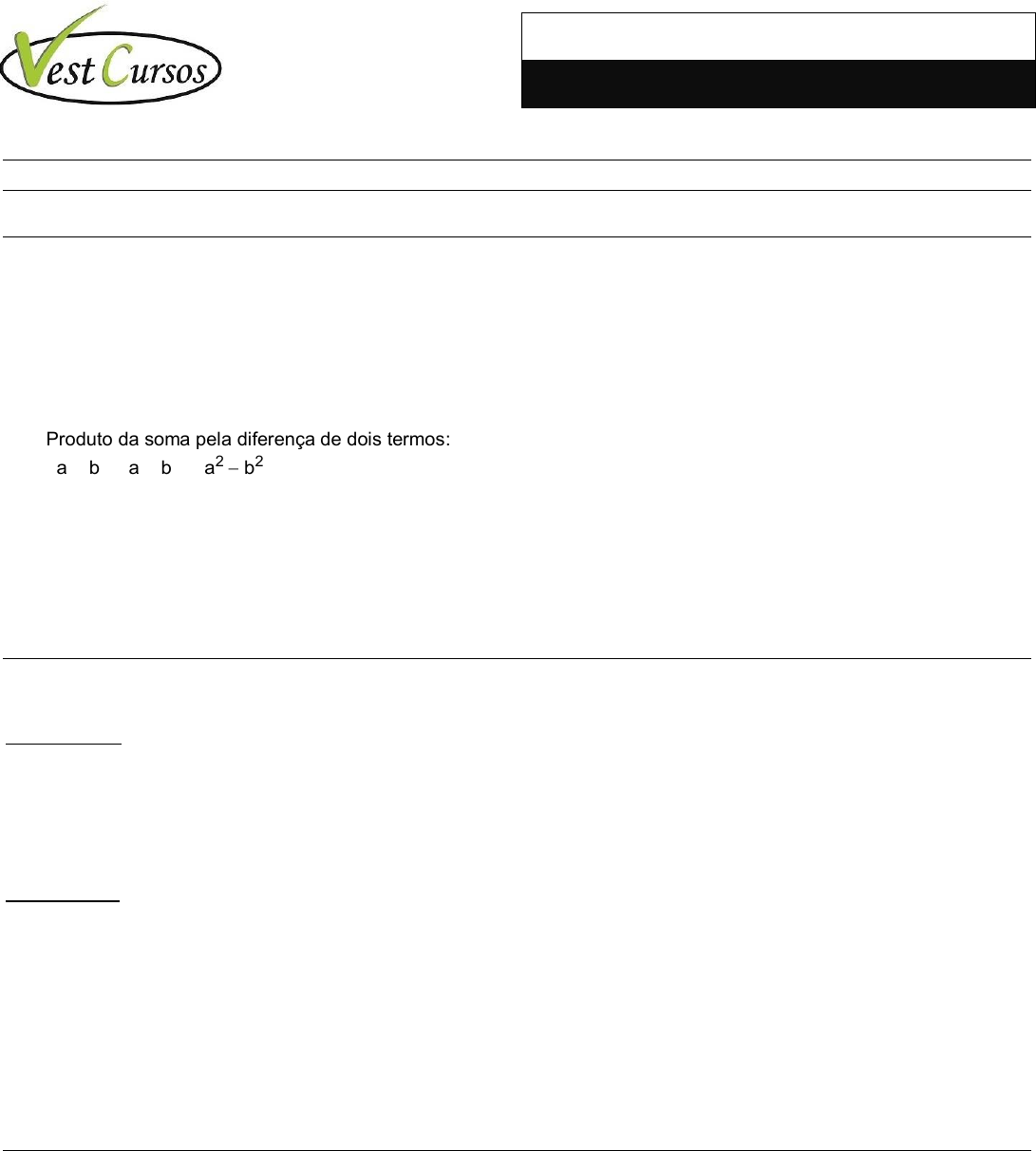 PRODUTOS NOTÁVEIS E FATORAÇÃO Produtos Notáveis Os produtos notáveis são identidades que podem ser obtidas de maneira prática. Assim, como são muito frequentes no cálculo algébrico, iremos listar os principais. I. Quadrado da soma de dois termos: 2 2 2a b a 2 a b b II. Quadrado da diferença de dois termos: 2 2 2a b a 2 a b b III. Produto da soma pela diferença de dois termos: 2 2a b a b a b IV. Cubo da soma de dois termos: 3 3 2 2 3a b a 3 a b 3 a b b V. Cubo da diferença de dois termos 3 3 2 2 3a b a 3 a b 3 a b b Fatoração Seja uma expressão algébrica escrita como uma soma de termos. Fatorar essa expressão significa escrevê-la na forma de um produto. Para tanto, existem determinadas técnicas, descritas a seguir: Fator Comum Inicialmente, identificamos um termo comum a todas as parcelas da expressão. Em seguida, colocamos esse termo em evidência. Exemplos 1º) ab + ac = a(b + c) 2º) 24x 3 y 2 – 6x 4 y + 12x 2 y 5 = 6x 2 y (4xy – x 2 + 2y 4 ) Agrupamento Às vezes, não é possível identificar, de início, um fator comum a todas as parcelas de expressão. Nesse caso formamos dois ou mais grupos com um termo comum. Em seguida, colocamos em evidência o fator comum a todos os grupos. Exemplos 1º) ax + ay + bx + by = a(x + y) + b(x + y) = (x + y) (a + b) 2º) 8x 2 – 4xz – 6xy + 3yz = 4x (2x – z) – 3y (2x – z) = (2x – z) (4x – 3y) Exercício Resolvido 01. Fatorar a expressão a 2 – 4ba + 3b 2 . Resolução: 2 2 2 2a 4ab 3b a ba 3ba 3b a(a b) 3b(a b) (a b)(a 3b) Soma e diferença de cubos São identidades muito úteis em cálculo algébrico. São elas: I. Soma de cubos: 3 3 2 2a b a b a ab b II. Diferença de cubos: 3 3 2 2a b a b a ab b CURSO ANUAL DE MATEMÁTICA AULA 1 – Prof. Raul Brito TEM QUE SUMIRRRRRRRRRRRRRRRRRRRRRR TEM Q SUMIRRRRRRRRRRRRRRRRRRRRRR Thiago Realce 2 CURSO DE MATEMÁTICA ANUAL – AULA 1 – Prof. Raul Brito PRODUTOS NOTÁVEIS E FATORAÇÃO 02. Fatorar a expressão x 3 – 27: Resolução: x 3 – 27 = x 3 – 3 3 = (x – 3) (x 2 + 3x + 9) Identificação de um produto notável Exemplos 1º) x 2 + 10x + 25 = (x + 5) 2 - Quadrado da soma. 2º) 222 2 6 3 3 3a b c ab c ab c ab c - Produto da soma pela diferença. 3º) a 3 – 3a 2 + 3a – 1 = (a – 1) 3 – Cubo da diferença. Fatoração do trinômio da forma ax 2 + bx + c Sejam x1 e x2, as raízes reais do trinômio P(x) = ax 2 + bx + c, com a 0. Esse trinômio pode ser escrito na forma: 1 2P x a x x x x Observação As raízes podem ser obtidas pela Fórmula de Bhaskara: 2bx , em que b 4ac 2a Exercício Resolvido 03. Fatorar a expressão x 2 – 5x + 6. Resolução: Cálculo das raízes: 2 1 2 5 4 1 6 25 24 1 5 1 x x 2 e x 3 2 Substituindo na forma fatorada, temos 1(x – 2) (x – 3). 04. (FEI) fatorar 2 2 2a b c 2ab. Resolução: 2 2 2 2 2 2 2 2a b c 2ab a 2ab b c (a b) c (a b c)(a b c) . 05. (UFGO) Simplificando 3 2 2 2 x y 2y y x x y , obtém-se: a) (x + y) 2 / (x – y) b) x – y – 2yx 2 c) x + y d) x – y e) (x 2 + y 2 ) / (x – y) Resolução: 3 2 2 2 2 x y x yx y 2y x y x y x y 2y x y x yx y x y x y x y x y . 06. Se 2 3 3 1 1 R 3, então R é igual a : R R a) 1 b) 2 c) 0 d) 3 e) 6 Resolução: 3 CURSO DE MATEMÁTICA ANUAL – AULA 1 – Prof. Raul Brito PRODUTOS NOTÁVEIS E FATORAÇÃO Dados: 2 3 3 3 2 3 2 3 3 3 3 3 3 3 3 3 1 R 3 R Desenvolvendo temos : 1 1 1 1 1 1 1 R R 3 R 3 R R R 3 R R R R RR R R 1 Como R 3 temos : R 1 1 1 3 R 3 3 3 3 R 3 3 R 0 R R R Letra “c” 07. Simplificando 4 4 3 2 2 3 a b a a b ab b Resolução: 2 22 2 2 24 4 3 2 2 3 2 2 a ba b a ba b a a b ab b a (a b) b (a b) a b a b (a b) 2 2a b a b 08. Simplificando a expressão 2 2 a 7a 12 a 6a 9 encontramos: a) a 4 a 3 b) 12 9 c) 19 15 d) a 7 a 6 e) 4 3 Resolução: 2 2 2 2 a 7a 12 Resolvendo as equações a 6a 9 a 7a 12 0 a 3 a 4 a 6a 9 0 a 3 a 3 Podemos escrever a fatoração: 2 2 2 2 a 7a 12 (a 3) (a 4) e a 6a 9 (a 3) (a 3) Logo : (a 3)a 7a 12 a 6a 9 (a 4) (a 3) a 4 a 3(a 3) 4 CURSO DE MATEMÁTICA ANUAL – AULA 1 – Prof. Raul Brito PRODUTOS NOTÁVEIS E FATORAÇÃO EXERCÍCIOS DE APRENDIZAGEM Questão 01 Se a.b 1 e 2 2a b 3 . Qual o valor numérico da expressão 2 2 2 2 a b 2 b a ? Questão 02 Se o comprimento da diagonal de um quadrado é x + y, a área desse quadrado é: a) 2 2x y b) 2 x y 2 c) 2 x y 2 d) 2 2x y Questão 03 Calculando 2 2934287 934286 obtemos: a) 1 b) 2 c) 1868573 d) 1975441 Questão 04 O valor numérico da expressão 4 2 a 1 a 1 . a 1 a 1 , para a = 101, é: a) 101 b) 1110 c) 9801 d) 9900 e) 10000 Questão 05 O número real 4 2 2 x 2x 1 r x 2x 1 é igual a: a) 2x x b) 2x x 1 c) 2x 2x 1 d) 2x 2x 1 e) x 1 Questão 06 Se 3x 3 7 e 3y 7 1 , calcule o valor numérico da expressão 3 3 2 2x y 3x y 3xy a) 7 b) 3 7 c) 7 d) 8 e) 12 5 CURSO DE MATEMÁTICA ANUAL – AULA 1 – Prof. Raul Brito PRODUTOS NOTÁVEIS E FATORAÇÃO Questão 07 Se m + n + p = 6 , mnp = 2 e mn + mp + np = 11, o valor numérico de 2 2 2m n p mnp é: a) 1 b) 3 c) 7 d) 18 e) 22 Questão 08 Se 8 11 n2 2 2 é um quadrado perfeito , o valor de n é: a) 12 b) 14 c) 16 d) 18 e) 20 Questão 09 Sabendo que x > 0 e simplificando a fração algébrica: 3 3 1 1 E x 1 . x 1 x x obtemos: a) 3 2x x 1 x b) 3 2x x 1 x c) 3 3 3 1 x x d) 3 2 x 1 x e) 3 1 x x Questão 10 O menor valor que a expressão 2 236x y 12x 3 pode assumir para x e y reais é: a) 0 b) – 1 c) – 2 d) – 3 e) – 4 Questão 11 O valor de 99 99 x 2 5 2 5 é: a) 2 b) 5 c) 2 5 d) 1 e) – 1 6 CURSO DE MATEMÁTICA ANUAL – AULA 1 – Prof. Raul Brito PRODUTOS NOTÁVEIS E FATORAÇÃO Questão 12 (Mackenzie-SP) A expressão 2 4 x x 6 x 2 x 16 é: a) x 3 x 2 b) x 2 x 2 c) 2 x 2 x 4 d) x 3 x 2 e) 2 x 3 x 4 Questão 13 (UFMG) Os lados de um retângulo são 1a x 1 e 1b x 1 e os de outro retângulo são 2a 3x 7 e 2b 3x 7 . Se os retângulos possuem a mesma área, o valor de x é: a) 2 2 b) 3 c) 10 d) 2 e) 4 Questão 14 (UFMG) Fatorando-se a expressão 4 4 3 3x y 2x y 2xy , obtém-se: a) 2 2 x y x y b) 3 x y x y c) 22 2x y x y d) 4 x y e) x + y Questão 15 (UF