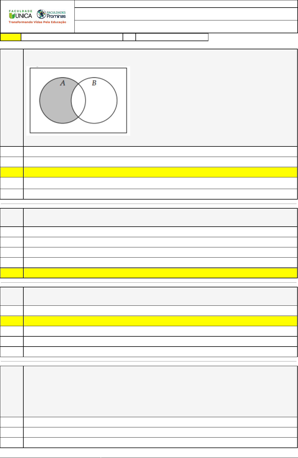 03/04/2022 17:20:52 1/3 REVISÃO DE SIMULADO Nome: MARCIO PEREGINI DA SILVA Disciplina: Matemática Básica Respostas corretas são marcadas em amarelo X Respostas marcardas por você. Questão 001 Observe o diagrama abaixo com a região pintada e indique a operação que representa essa região. A) B - A B) A ∩ B X C) A - B D) A ∪ B E) A Questão 002 Da Dados os conjuntos A={x∈Z| 2≤x<10} e B= {x∈R| x é primo e menor que 20}. Assinale a alternativa que corresponde à operação (A-B)∪(B-A): A) {2,3,4,5,6,8,11,13} B) {6,8,9,10} C) {5,6,11,13,17,19} X D) {3,6,9,10,11,13,17,19} E) {4, 6, 8, 9, 11, 13, 17, 19} Questão 003 Em uma escola que tem 415 alunos, 221 estudam inglês, 163 estudam francês e 52 estudam ambas as línguas. Quantos alunos não estudam nenhuma das duas? A) 21 alunos. X B) 83 alunos. C) 52 alunos. D) 36 alunos. E) 163 alunos. Questão 004 (UFBA – Adaptado) Em uma viagem, 35 estudantes estrangeiros vieram ao Brasil. Eles visitaram diferentes estados, sendo que: 16 visitaram Manaus; 16, S. Paulo e 11, Salvador. Desses estudantes, 5 visitaram Manaus e Salvador e, desses 5, 3 visitaram também São Paulo. O número de estudantes que visitaram Manaus ou São Paulo foi Fonte: https://www.mundovestibular.com.br/estudos/matematica/exercicios-de-conjuntos/ A) 5. B) 8. C) 24. 03/04/2022 17:20:52 2/3 D) 11. X E) 29. Questão 005 Considere A, B e C conjuntos quaisquer. Classifique as seguintes afirmativas em verdadeiras ou falsas, e posteriormente marque a alternativa com a sequência correta. ∅⊂(A∩B) A⊂(A∩B) A∈(A∩B) (A∩B)⊂B (A∩B)⊃(A∩B∩C) A sequência correta é: A) V, V, F, F, F X B) V, F, F, V, V . C) F, F, F, V, V D) V, V, V, F, F E) F, V, F, V, V Questão 006 (CRM ES 2016 – Quadrix) Numa pesquisa, verificou-se que, das pessoas consultadas, 100 se informavam pelo site A; 150 por meio do site B; 20 buscavam se informar por meio dos dois sites, A e B; e 110 não se informavam por nenhum desses dois sites. Desse modo, é correto afirmar que o número de pessoas consultadas nessa pesquisa foi de: 1. (CRM ES 2016 – Quadrix) Numa pesquisa, verificou-se que, das pessoas consultadas, 100 se informavam pelo site A; 150 por meio do site B; 20 buscavam se informar por meio dos dois sites, A e B; e 110 não se informavam por nenhum desses dois sites. Desse modo, é correto afirmar que o número de pessoas consultadas nessa pesquisa foi de: A) 380 X B) 340 C) 230 D) 270 E) 360 Questão 007 (UFMG-Adaptado) Em uma pesquisa de opinião, foram obtidos estes dados: • 600 dos entrevistados leem o jornal A. • 825 dos entrevistados leem o jornal B. • 525 dos entrevistados leem o jornal C. • 180 dos entrevistados leem os jornais A e B. • 225 dos entrevistados leem os jornais A e C. • 285 dos entrevistados leem os jornais B e C. • 105 dos entrevistados leem os três jornais. • 135 pessoas entrevistadas não leem nenhum dos três jornais Considerando-se esses dados, é correto afirmar que o número total de entrevistados foi: X A) 1.500 B) 1.200 C) 1.250 D) 2.880 E) 1.350 03/04/2022 17:20:52 3/3 Questão 008 Considere os conjuntos: K = conjunto dos quadriláteros planos L = {x ∈ K|x tem 4 lados congruentes} R = {x ∈ K|x tem 4 ângulos retos} Determine os conjuntos L ∩ R . A) Paralelogramo. B) Losango. X C) Quadrado. D) Retângulo. E) Trapézio.