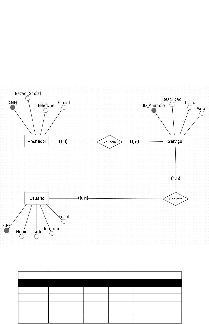 Alunos: Bruno Henrique Soares de Freitas Cálamo Andret da Silva Martins Gabriel de Souza Almeida Lucas Rodrigues Chaves Victor Henrique Fernandes Projeto Integrador – Agro Safari • Modelo Conceitual: • Dicionário de dados: Entidade: Prestador Atributo Classe Domínio Tamanho Descrição CNPJ Determinante Numérico Razão Social Simples Texto 50 Telefone Multivalorado Texto 50 Valores sem as máscaras de entrada Email Simples Texto 50 Entidade: Usuário Atributo Classe Domínio Tamanho Descrição CPF Determinante Numérico Nome Simples Texto 50 Idade Simples Numérico Telefone Multivalorado Numérico 50 Valores sem as máscaras de entrada Email Simples Texto 50 Entidade: Serviço Atributo Classe Domínio Tamanho Descrição ID_Anúncio Determinante Numérico Título Simples Texto 50 Título curto e objetivo Descrição Simples Texto 300 Valor Simples Numérico Valor do serviço • Modelo Lógico: