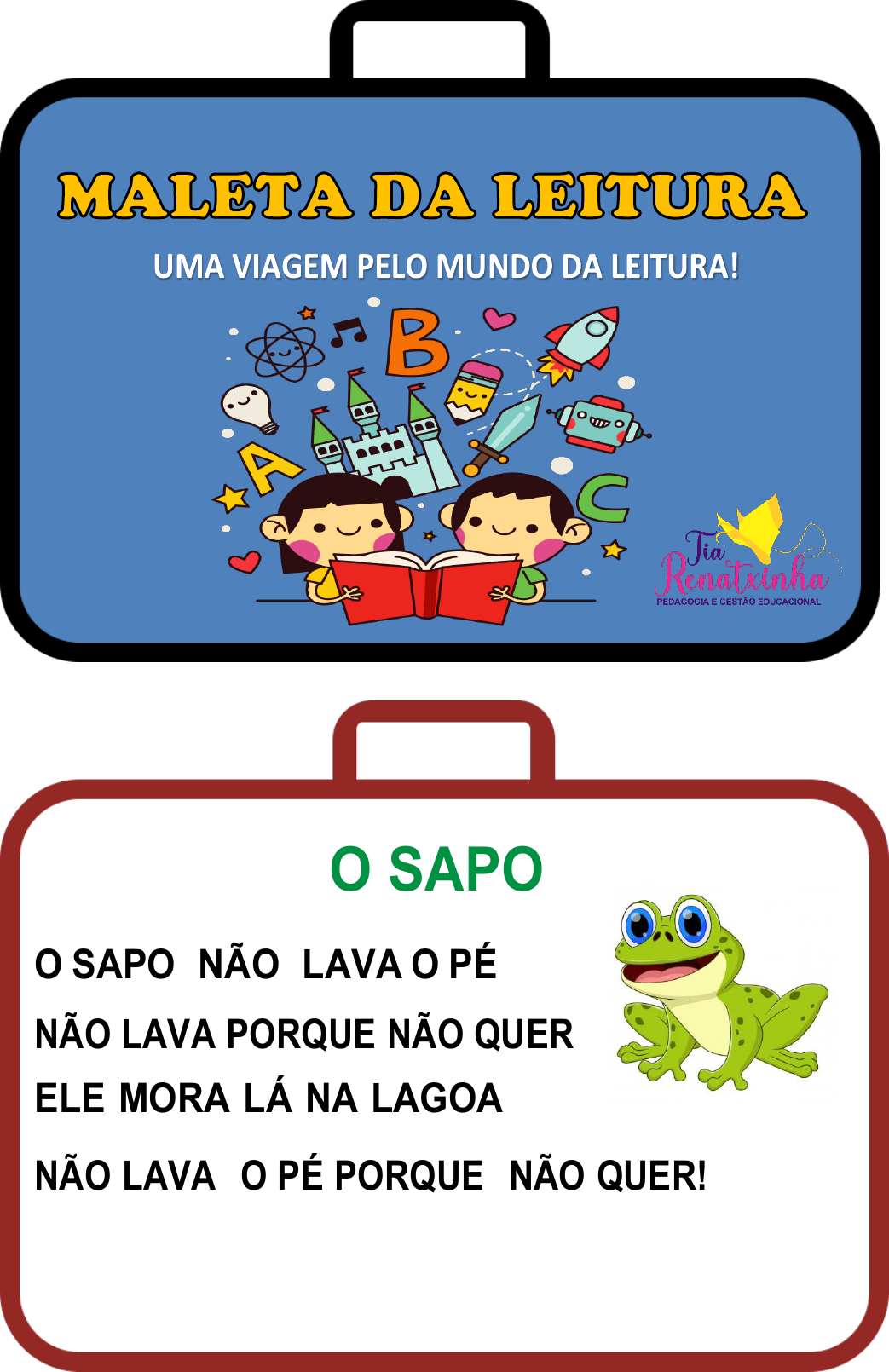VAMOS INICIAR UMA VIAGEM PELO MUNDO DA LEITURA!!!! O SAPO O SAPO NÃO LAVA O PÉ NÃO LAVA PORQUE NÃO QUER ELE MORA LÁ NA LAGOA NÃO LAVA O PÉ PORQUE NÃO QUER! A FOCA FILOMENA FILOMENA É UMA FOCA DE CIRCO. FABIANO É O DOMADOR DA FOCA. CADA VEZ QUE ELA FICA COM A BOLA NO NARIZ, FABIANO LHE DÁ UM PEIXE. A MENINADA VÊ FILOMENA COM A BOLA E PEDE BIS. ELA REPETE O QUE FEZ, DÁ UMA REBOLADA E SAI COM UM PEIXE NA BOCA TODA FELIZ! DEPOIS ELA VAI DESCANSAR, PARA MAIS TARDE FAZER OUTRO ESPETÁCULO. O GATO PEPEU PEPEU É O GATO MIMADO DE ANA. ELE GOSTAVA DE FICAR NO MATO. ANA VÊ PEPEU NO MATO E DIZ: – PEPEU! PEPEU! O GATO OUVE ANA E PULA NO COLO DELA. ANA DÁ UM PULO E DIZ: – PARE, PEPEU! VOCÊ É MUITO MIMADO. VÁ PARA SUA CAMA, POIS VOCÊ NÃO ME ENGANA! os dias TITA, A PATA DE TALITA TALITA TEM UMA PATA NA CHÁCARA DO TIO TINOCO. A PATA DE TALITA CHAMA-SE TITA. TITA É UMA PATA MUITO ESPERTA E BONITA. TITA E O PATO TOMÉ TÊM OITO PATINHOS. TITA CUIDA BEM DE SEUS FILHOTINHOS. A CHUVA QUE CHEGOU JÁ FAZIA SEIS DIAS E A CHUVA NÃO CHEGAVA. O JARDIM ESPERAVA POR ELA. O CHÃO ESTAVA MUITO SECO. NEM UM CHUVISCO CAIU. A MARGARIDA FICOU CHATEADA, E A CHUVA LOGO CHAMOU: - CHUVA! CHUVA! CHEGA LOGO! A MARGARIDA FICOU FELIZ COM A CHUVA QUE CHEGOU. SUA BONECA DE PANO! DE TIAGO. O GALO BICUDO BICUDO É UM GALO BEM BRAVO. ELE BICA TUDO O QUE VÊ PELA FRENTE. BICA A CAUDA DO GATO BILUCA, A CARECA DO BONECO GUTO, A PATA DA GATA GABI E A GOLA DA CAMISA, BICUDO BICA E SAI. ELE VAI DEPRESSA PARA O MATO. NINGUÉM PEGA O GALO BICUDO! O SÍTIO DO TIO SALOMÃO TIO SALOMÃO TEM UM BELO SÍTIO. ELE SE DEDICA AO SÍTIO E O DEIXA BEM BONITO! QUEM VAI LÁ, VÊ O PAPAGAI QUE FALA, O SABIÁ QUE CANTA E A VACA SABINA QUE DÁ O LEITE QUENTINHO TODA A MANHÃ. À TARDE, TIO SALOMÃO SE DEITA NA REDE, E LOGO O SONO VEM, PORQUE LÁ NÃO SE OUVEM RUÍDOS NEM APITOS. O SÍTIO DO TIO SALOMÃO É UMA BELEZA! "CORRE CUTIA, NA CASA DA TIA. CORRE CIPÓ, NA CASA DA AVÓ. LENCINHO NA MÃO, CAIU NO CHÃO. MOÇA BONITA, DO MEU CORAÇÃO... UM, DOIS, TRÊS!" "BATATINHA QUANDO NASCE SE ESPARRAMA PELO CHÃO. MENININHA QUANDO DORME PÕE A MÃO NO CORAÇÃO." "UM, DOIS, FEIJÃO COM ARROZ, TRÊS, QUATRO, FEIJÃO NO PRATO, "CINCO, SEIS, FALAR INGLÊS, SETE, OITO, COMER BISCOITO, NOVE, DEZ, COMER PASTÉIS." "HOJE É DOMINGO, PEDE CACHIMBO. O CACHIMBO É DE OURO, BATE NO TOURO. O TOURO É VALENTE, BATE NA GENTE. A GENTE É FRACO, CAI NO BURACO. O BURACO É FUNDO, ACABOU-SE O MUNDO." "O MACACO FOI À FEIRA NÃO TEVE O QUE COMPRAR. COMPROU UMA CADEIRA PRA COMADRE SE SENTAR. A COMADRE SE SENTOU... A CADEIRA ESBORRACHOU COITADA DA COMADRE. FOI PARAR NO CORREDOR." TRAVA-LÍNGUA DO DOCE O DOCE PERGUNTOU PRO DOCE QUAL É O DOCE MAIS DOCE QUE O DOCE DE BATATA- DOCE. O DOCE RESPONDEU PRO DOCE QUE O DOCE MAIS DOCE QUE O DOCE DE BATATA-DOCE É O DOCE DE DOCE DE BATATA-DOCE. O TEMPO O TEMPO PERGUNTOU AO TEMPO QUANTO TEMPO O TEMPO TEM, O TEMPO RESPONDEU AO TEMPO QUE O TEMPO TEM TANTO TEMPO QUANTO TEMPO, TEMPO TEM. x DENTRO DA JARRA TEM UMA ARANHA. TANTO A ARANHA ARRANHA A JARRA, COMO A JARRA ARRANHA A ARANHA. DEBAIXO DA CAMA TEM UMA JARRA. A LAGARTIXA LARGA A TIA, LARGATIXA! LAGARTIXA, LARGA A TIA! SÓ NO DIA EM QUE A SUA TIA CHAMAR A LARGATIXA DE LAGARTIXA.