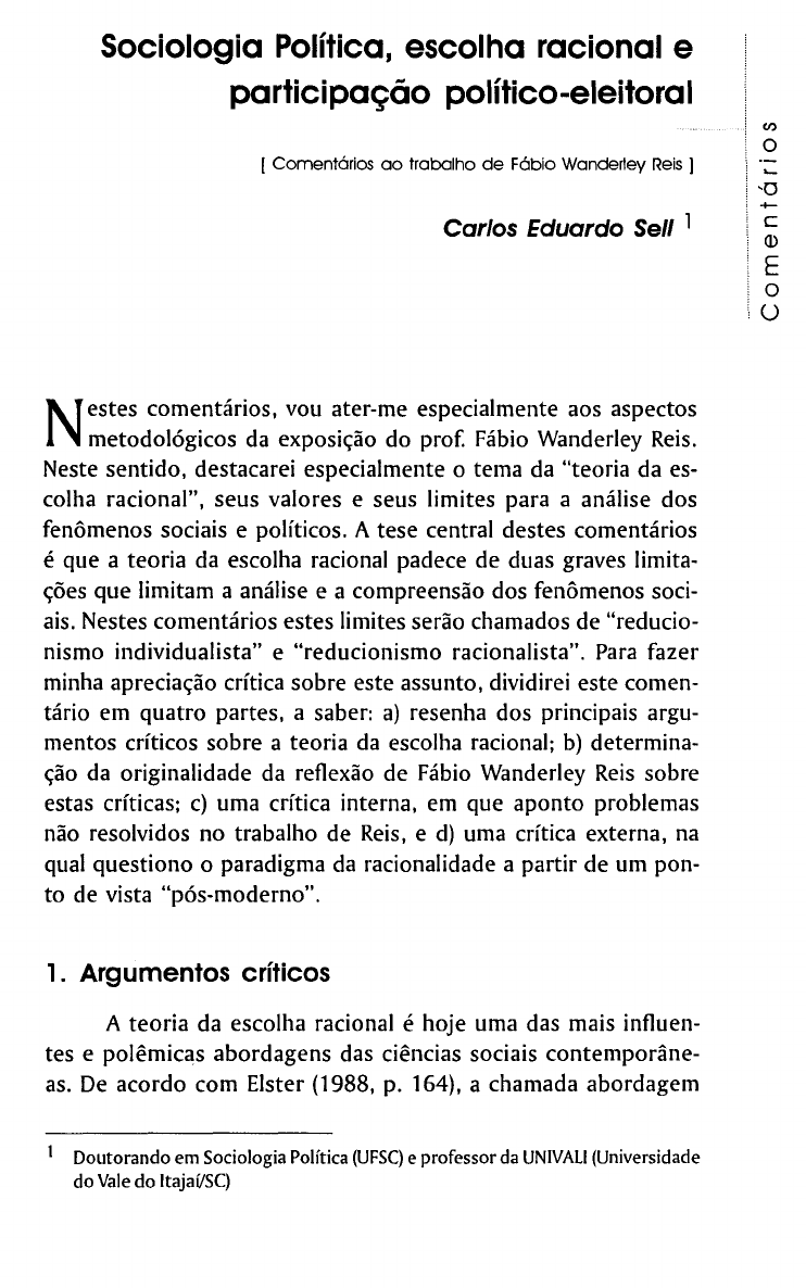 Sociologia Política, escolha racional e participação político-eleitoral [ Comentários ao trabalho de Fábio Wanderley Reis ] Carlos Eduardo Sell 1 N estes comentários, vou ater-me especialmente aos aspectosmetodológicos da exposição do prof. Fábio Wanderley Reis. Neste sentido, destacarei especialmente o tema da "teoria da es- colha racional", seus valores e seus limites para a análise dos fenômenos sociais e políticos. A tese central destes comentários é que a teoria da escolha racional padece de duas graves limita- ções que limitam a análise e a compreensão dos fenômenos soci- ais. Nestes comentários estes limites serão chamados de "reducio- nismo individualista" e "reducionismo racionalista". Para fazer minha apreciação crítica sobre este assunto, dividirei este comen- tário em quatro partes, a saber: a) resenha dos principais argu- mentos críticos sobre a teoria da escolha racional; b) determina- ção da originalidade da reflexão de Fábio Wanderley Reis sobre estas críticas; c) uma crítica interna, em que aponto problemas não resolvidos no trabalho de Reis, e d) uma crítica externa, na qual questiono o paradigma da racionalidade a partir de um pon- to de vista "pós-moderno". 1. Argumentos críticos A teoria da escolha racional é hoje uma das mais influen- tes e polêmicas abordagens das ciências sociais contemporâne- as. De acordo com Elster (1988, p. 164), a chamada abordagem 1 Doutorando em Sociologia Política (UFSC) e professor da UNIVALI (Universidade do Vale do Itajai/SC) econômica dos fenômenos sociais ou ainda a teoria da escolha racional pode ser definida da seguinte forma: "chamo de indivi- dualismo metodológico a doutrina segundo a qual todos os fe- nômenos sociais (sua estrutura e sua mudança) são explicáveis, em princípio, apenas em termos de indivíduos: de suas caracte- rísticas, fins e crenças". A centralidade desta abordagem nos debates contemporâ- neos é visível, se tomarmos como exemplo uma das principais publicações brasileiras na área de ciências sociais: a Revista Brasi- leira de Ciências Sociais (RBCS). Tomando aleatoriamente alguns números recentes da revista podemos constatar a existência de diversos artigos que discutem as contribuições e, especialmente, os limites da teoria da escolha racional 2 . Mas, para não tornar tediosa a tarefa do leitor, vou resumir esta literatura destacando que os críticos da teoria da escolha racional apontam sempre para duas deficiências básicas nesta teoria, que são: a) Reducionismo individualista: ou seja, a idéia de compreender os fe- nômenos sociais recorrendo à premissa de que são explicáveis a partir dos indivíduos desconsidera o peso das estruturas, das instituições sociais, da cultura e da própria história no condicio- namento das ações sociais. b) Reducionismo racionalista: a teoria da escolha racional ignora a influência das normas e dos valores morais na ação social, redu- zindo a ação social ao seu aspecto instrumental. De acordo com esta idéia, esta mesma teoria reduz o indivíduo à sua dimensão utilitária (indivíduo egoísta) e ignora a dimensão altruísta e solidá- ria das pessoas, cujas fontes são valores éticos e morais. 2. A originalidade da obra de Fábio W. Reis Estas críticas, com certeza, já são velhas conhecidas do prof. Reis, que dedica várias de suas obras e artigos a examinar estes argumentos, como é o caso de seus textos mais conheci- 2 Os textos consultados foram Baert (1995), Lessa (1998), Caillé (1998), Cohn (1998), Elster (1999) e Mosman (2000). Sobre o mesmo assunto, conferir ainda o trabalho de Avritzer (1995). Política & Sociedade 66 p. 65 - 71 Sociologia Política, escolha racional e participação político eleitoral Carlos Eduardo Sell dos como "Política e racionalidade" (1981) e vários dos capítu- los do livro "Mercado e utopia" (2000). Aliás, é o próprio autor [aqui presente] que nos diz que "essa linha de trabalho [a teoria da escolha racional] me parece merecer grande atenção, repre- sentando talvez a linha mais promissora na Ciência Política con- temporânea — contanto que saiba incorporar sua força analítica em incorrer em certos excessos que o exame crítico dos resulta- dos por ela obtido até agora revela"(2000, p.38). Neste tópico, portanto, gostaria de demonstrar de que modo o prof. Reis bus- ca responder às críticas formuladas contra a teoria da escolha racional, destacando, como já disse, a "originalidade" de seu trabalho em relação a essa questão. Em primeiro lugar, vejamos o modo como Reis procura en- frentar o que estou chamando aqui de reducionismo individualis- ta. Um trecho de sua obra parece bastante elucidativo. Vejamos: "Na perspectiva que aqui se propugna trata-se sem dúvida, por um lado, de ter em conta e de incorporar o aspecto institucional, histó- rico ou sociológico, refugando o "estado de natureza" e o individu- alismo conseqüente como supostos descritivos suficientes ou ade- quados à análise de situações reais" (1981, p. 122). Mas, de que forma Reis procura levar em conta o aspecto institucional na análi- se dos fenômenos sociais? Deixemos, novamente, que o próprio autor se explique: "O institucional aparece assim, por um lado, em contraste com o individualismo abstrato que caracteriza em geral a public choice como o contexto inelutável em que se desenvolve a interação entre os agentes e os sujeitos e que condiciona sempre as formas de que se revestirá esta ação. Mas, aparece também, por outro lado, como objeto sobre o qual se exerce a ação dos agentes, traduzindo-se num esforço permamente do organização e constru- ção institucional (idem, p. 124). Mais complexa é a reflexão de Reis sobre o reducionismo racionalista, que ocupa boa parte de seu livro de 1981, no qual o autor critica a estratégia de Habermas de cindir a razão em duas racionalidades: instrumental e comunicativa. De acordo com as reflexões de Reis, a aç