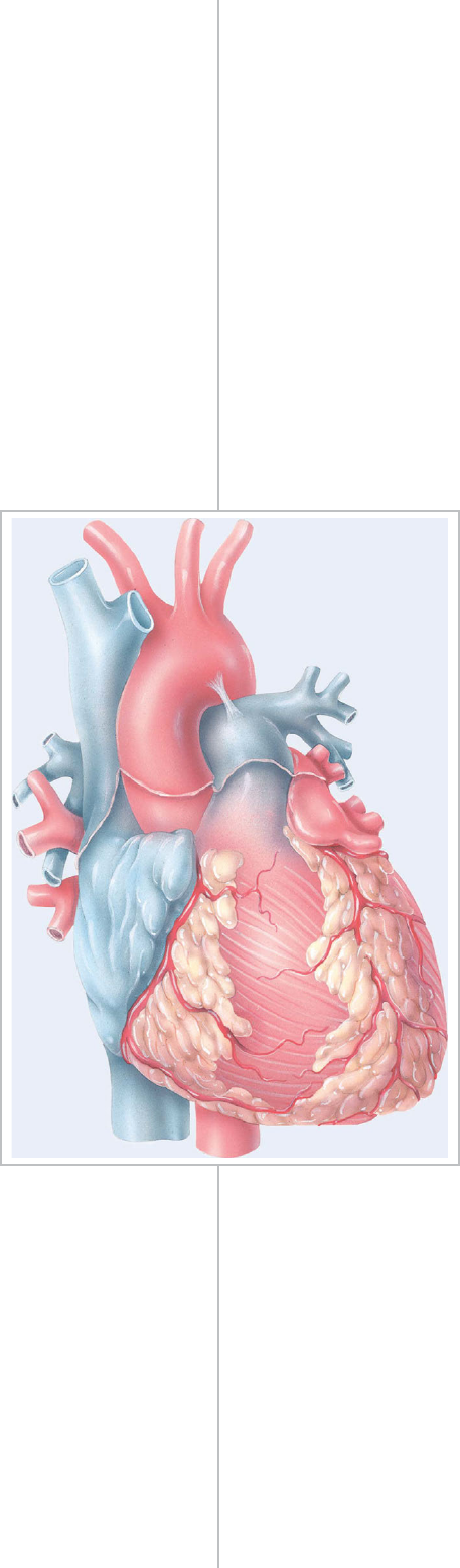 Como vimos en el capítulo anterior, el aparato cardiovascular está for- mado por la sangre, el corazón y los vasos sanguíneos. También analiza- mos la composición y las funciones de la sangre, y en este capítulo usted aprenderá sobre la bomba que la hace circular por todo el organismo: el corazón. Para que la sangre alcance las células del cuerpo e intercambie sustancias con ellos, debe ser bombeada constantemente por el corazón. El corazón late unas 100 000 veces por día, lo que suma 35 millones de latidos por año y 2 500 millones de veces en toda una vida. El lado izquierdo del corazón bombea sangre hacia unos 120 000 km de vasos sanguíneos, que es el equivalente a viajar 3 veces alrededor del mundo. El lado derecho del corazón bombea sangre hacia los pulmones, permi- tiendo que recoja oxígeno y descargue dióxido de carbono. Aun cuando usted duerme, su corazón late 30 veces su propio peso cada minuto, que representa unos 5 litros hacia los pulmones y el mismo volumen hacia el resto del cuerpo. Esto significa que su corazón bombea más de 14 000 litros de sangre por día o 5 millones de litros por año. Usted no pasa todo el tiempo durmiendo, y su corazón bombea más vigorosamente cuando se encuentra activo. Así, el volumen real de sangre que bombea su corazón durante el día es mayor. El estudio científico del corazón sano y las enfermedades asociadas se denomina cardiología. Este capítulo explora la estructura del corazón y las propiedades únicas que le permiten bombear toda la vida sin descanso. 757 APARATO CARDIOVASCULAR: EL CORAZÓN20 EL CORAZÓN Y LA HOMEOSTASIS A través de los vasos sanguíneos, el corazón bombea sangre hacia todos los tejidos del organismo. ¿Alguna vez pensó acerca de las diferencias entre el colesterol “bueno” y el “malo”?? 20.1 ANATOMÍA DEL CORAZÓN O B J E T I V O S • Describir la ubicación del corazón. • Describir las estructuras del pericardio y de la pared cardíaca. • Examinar la anatomía interna y externa de las cámaras cardíacas. • Relacionar el espesor de las cámaras cardíacas con sus funciones. Localización del corazón Si se considera la importancia de su función, el corazón es un órgano relativamente pequeño, casi del mismo tamaño (pero no de la misma forma) que un puño cerrado. Mide alrededor de 12 cm de largo, 9 cm en su punto más ancho y 6 cm de espesor, con un peso promedio de 250 g en mujeres adultas y de 300 g en hombres adultos. El corazón se apoya en el diafragma, cerca de la línea media de la cavidad torácica (recuerde que la línea media es una línea vertical imaginaria que divide el cuerpo en lados derecho e izquierdo, desiguales) y se encuentra en el mediasti- no, una masa de tejido que se extiende desde el esternón hasta la colum- na vertebral, desde la primera costilla hasta el diafragma y entre los pul- mones (Figura 20.1a). Aproximadamente dos tercios del corazón se encuentran a la izquierda de la línea media del cuerpo (Figura 20.1b). Se puede imaginar al corazón como un cono que yace de lado. El vértice o punta (ápex) está formada por el ventrículo izquierdo (una de las cáma- ras inferiores del corazón) y descansa sobre el diafragma. Se dirige hacia adelante, hacia abajo y hacia la izquierda. La base del corazón es su superficie posterior. Está formada por las aurículas (las cámaras inferio- res), principalmente la aurícula izquierda. Además de la base y el ápex, el corazón tiene diferentes caras y bor- des (márgenes). La cara anterior se ubica detrás del esternón y las cos- tillas. La cara inferior es la que se encuentra entre el vértice y el borde derecho y descansa principalmente sobre el diafragma (Figura 20.1b). El borde derecho mira hacia el pulmón derecho y se extiende desde la cara inferior hasta la base; contacta con el pulmón derecho y se extiende desde la superficie inferior hasta la base. El borde izquierdo, también denominado borde pulmonar, mira hacia el pulmón izquierdo y se extiende desde la base hasta el ápice. Pericardio El pericardio (peri-, de perí, alrededor) es una membrana que rodea y protege el corazón; lo mantiene en su posición en el mediastino y, a la vez, otorga suficiente libertad de movimientos para la contracción rápida y vigorosa. El pericardio se divide en dos partes principales: 1) el pericardio fibroso y 2) el pericardio seroso (Figura 20.2a). El pericardio fibroso es más superficial y está compuesto por tejido conectivo denso, irregular, poco elástico y resistente. Es semejante a un saco que descansa sobre el diafragma y se fija en él. Sus bordes libres se fusionan con el tejido conectivo de los vasos sanguíneos que entran y salen del corazón. El pericardio fibroso evita el estiramiento excesivo del corazón, provee protección y sujeta el corazón al medias- tino. El pericardio fibroso, cerca de la punta del corazón, está parcial- mente fusionado con el tendón central del diafragma y, por lo tanto, cuando éste se mueve, en el caso de una respiración profunda, facili- ta el flujo de la sangre en el corazón. El pericardio seroso es más profundo, más delgado y delicado, y forma una doble capa alrededor del corazón (Figura 20.2a). La capa parietal externa del pericardio seroso se fusiona con el pericardio fibroso. La capa visceral interna, también denominada epicardio (epi-, de epí, sobre), es una de las capas de la pared cardíaca y se adhiere fuertemente a la superficie del corazón. Entre las capas visce- ral y parietal del pericardio seroso, se encuentra una delgada película de líquido seroso. Esta secreción lubricante, producida por las células pericárdicas y conocida como líquido pericárdico, disminuye la fric- ción entre las hojas del pericardio seroso cuando el corazón late. Este espacio que contiene unos pocos mililitros de líquido pericárdico se denomina cavidad pericárdica. Capas de la pared cardíaca La pared cardíaca se divide en tres capas (Figura 20.2a): 