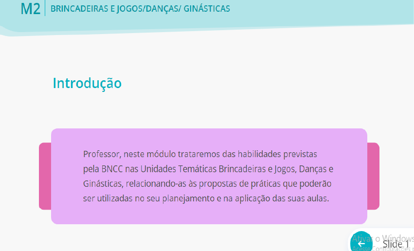 MD. II. FORMAÇÃO EM EDUCAÇÃO FÍSICA - ANOS FINAIS Para tanto, serão apresentadas as habilidades dentro de cada objeto de conhecimento proposto pela BNCC para os Anos Finais do Ensino Fundamental nas Brincadeiras e jogos, Danças e Ginásticas e possibilidades de trabalho para o desenvolvimento dessas habilidades, também articuladas às competências gerais e específicas. Refletiremos, também, sobre o que o estudante efetivamente deverá fazer para que essas habilidades possam ser realmente desenvolvidas, procurando contribuir com o seu planejamento e a sua atuação como professor. Unidade 1 Conexões entre o objeto de conhecimento e as habilidades esperadas Habilidades na BNCC: o que são? Conforme já abordamos no Módulo 1 do curso, a BNCC propõe o ensino baseado em dez competências gerais que favorecem, na esfera pedagógica, o desenvolvimento e a aprendizagem dos estudantes. Articuladas a essas competências gerais, o documento também apresenta competências específicas para a área das Linguagens que, por sua vez, se relacionam com competências específicas para a Educação Física. Para o desenvolvimento das competências, estão colocadas habilidades que se relacionam às especificidades da aprendizagem de cada componente curricular. (Segundo a BNCC (BRASIL, 2018, p.13). O desenvolvimento de competências se dá por meio do que os alunos devem ‘saber’ (considerando a constituição de conhecimentos, habilidades, atitudes e valores) e, sobretudo, do que devem ‘saber fazer’ (considerando a mobilização desses conhecimentos, habilidades, atitudes e valores para resolver demandas complexas da vida cotidiana, do pleno exercício da cidadania e do mundo do trabalho). Assim, as habilidades na BNCC podem ser compreendidas como as aptidões, as capacidades, os conhecimentos, as noções que os estudantes deverão adquirir na sua trajetória escolar e que irão favorecer o desenvolvimento das competências específicas. Com base nessa lógica, cada componente curricular apresenta uma gama de habilidades que estarão vinculadas aos diferentes objetos de conhecimento que compõem as Unidades Temáticas. Além disso, é importante entender que, ao desenvolver uma competência, várias habilidades (que envolvem aspectos cognitivos, afetivos e instrumentais) são mobilizadas, e juntas possibilitam a compreensão de determinado conteúdo. “As habilidades expressam as aprendizagens essenciais que devem ser asseguradas aos alunos nos diferentes contextos escolares. Para tanto, elas são descritas de acordo com uma determinada estrutura” (BRASIL, 2018, p. 29). Veja um exemplo do que são uma competência e uma habilidade na prática: EXEMPLOS Para andar de bicicleta com competência você deverá ser capaz de se locomover pela rua ou ciclovia com segurança, deverá usar os acessórios de proteção, respeitar os pedestres ou os outros ciclistas que também usam o mesmo espaço que você, desviar de possíveis obstáculos que poderão aparecer no percurso ou qualquer outra adversidade que possa surgir. É necessário que você desenvolva sua coordenação motora, equilíbrio, noção espaço-temporal, que tenha compreensão sobre as regras de trânsito ou da ciclovia, conhecimento do uso adequado de equipamentos de proteção, aptidão para tomada de decisão rápida, capacidade de lidar com as emoções para enfrentar um eventual acidente e respeitar os demais usuários da via. Tudo isso diz respeito às habilidades necessárias para que você tenha competência para andar de bicicleta. Portanto, a partir deste exemplo, podemos ver que a competência é formada por um conjunto de habilidades que dão condições para que ela se desenvolva. Entenda melhor assistindo ao vídeo a seguir: (VÍDEO) Veja também este vídeo que comenta como a BNCC está estruturada em competências e habilidades, explicando a lógica dessa estrutura: (VÍDEO) Você deve ter em mente que uma habilidade não apresenta as intenções do professor para determinada aula ou conteúdo, mas sim, o que o professor espera que seus estudantes aprendam e/ou sejam capazes de fazer. Isso quer dizer que as habilidades evidenciam a finalidade da aprendizagem, não do ensino. Portanto, uma habilidade define quais são os objetivos (os quais abordaremos no Módulo 4) esperados que o estudante alcance, tendo em sua estrutura três elementos centrais: O verbo de ação indica a ação específica do estudante com respeito ao objeto de conhecimento e poderá indicar se a habilidade a ser desenvolvida estará na esfera conceitual, atitudinal e procedimental. O complemento do verbo indica o objeto de conhecimento (conceitos, dados, procedimentos, atividades, processos e atitudes que serão desenvolvidos) e, portanto, explica sobre o que o aluno está aprendendo. O modificador do verbo ou do complemento indica um contexto, uma metodologia, um paradigma, uma perspectiva, uma situação ou condição em que a habilidade deve ser desenvolvida, considerando a faixa etária dos alunos. Vamos ver exemplos de habilidades para o 6º e o 7º ano: Habilidade (EF67EF06) Analisar as transformações na organização e na prática dos esportes em suas diferentes manifestações (profissional e comunitário/lazer). Habilidade (EF67EF15) Planejar e utilizar estratégias básicas das lutas do Brasil, respeitando o colega como oponente. Cabe ressaltar que, à medida que as habilidades se desenvolvem, articulam-se de formas novas, o que possibilita que as competências se reorganizem de maneiras diferentes. É importante também entender que na BNCC, essa articulação de distintas habilidades acontece de forma progressiva, exigindo graus crescentes de complexidade. Observe a figura a seguir para entender a progressão das habilidades dentro da BNCC: Fonte: Fundação Telefônica. Disponível em: https://fundacaotelefonicavivo.org.br/noticias/bncc-voce-sabe-a-diferenca-entre-competencias-e-habilidades/. Acesso em: 01 nov. 2021. Na Ed