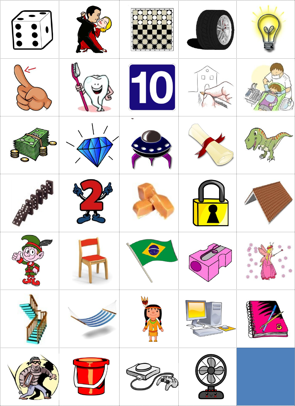 Figuras que contém o fonema /d/ no início, meio e final das palavras. Dado, dança, dama, roda, lâmpada, dedo, dente, dez, desenho, dentista, dinheiro, diamante, disco voador, diploma, dinossauro, dominó, dois, doce de leite, cadeado, telhado, duende, cadeira, bandeira, apontador, fada, escada, rede, índia, computador, caderno, bandido, balde, videogame, ventilador, quadrado.