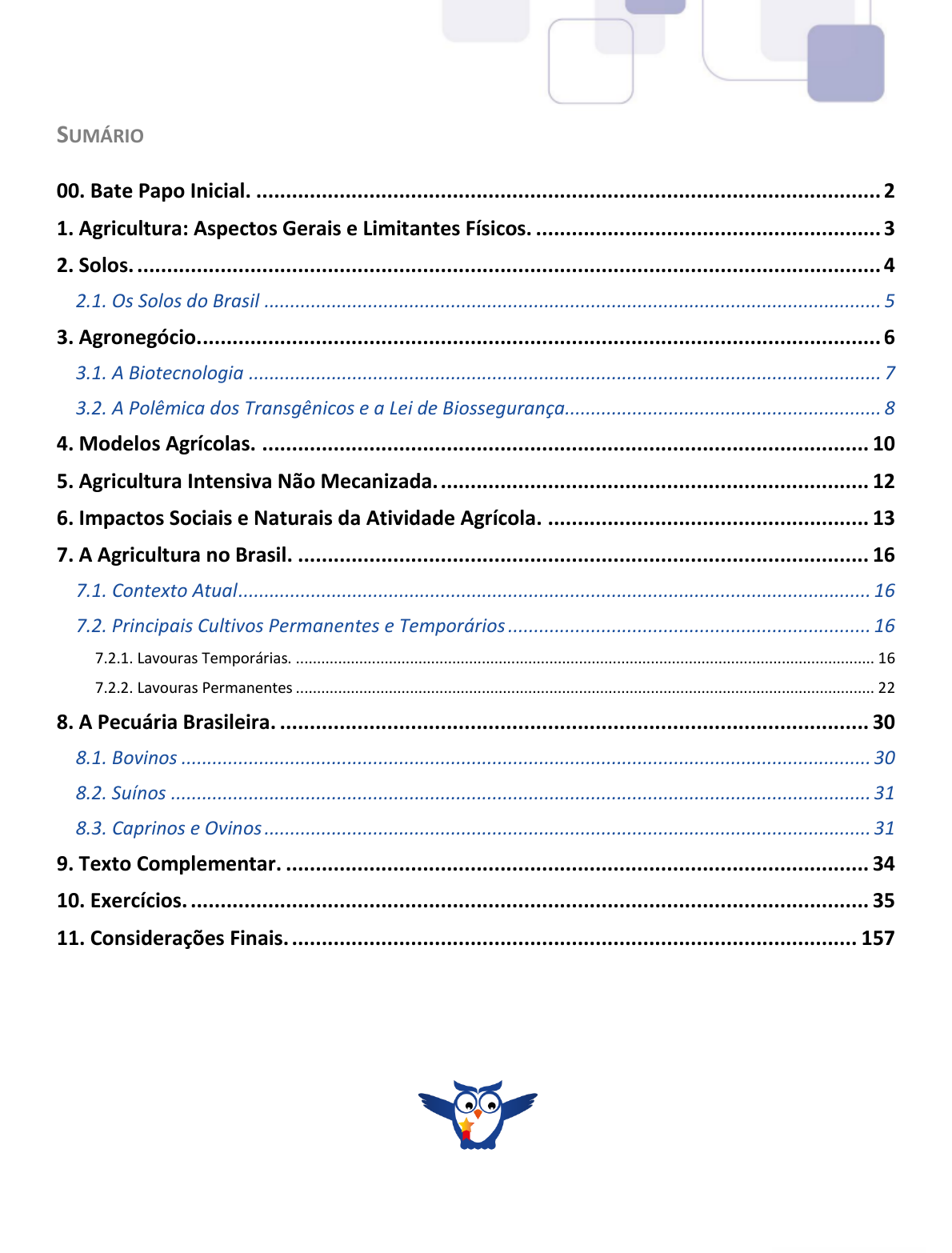 Geografia. www.estrategiaconcursos.com.br 1 157 SUMÁRIO 00. Bate Papo Inicial. ......................................................................................................... 2 1. Agricultura: Aspectos Gerais e Limitantes Físicos. .......................................................... 3 2. Solos. ............................................................................................................................. 4 2.1. Os Solos do Brasil ....................................................................................................................... 5 3. Agronegócio. .................................................................................................................. 6 3.1. A Biotecnologia .......................................................................................................................... 7 3.2. A Polêmica dos Transgênicos e a Lei de Biossegurança............................................................. 8 4. Modelos Agrícolas. ...................................................................................................... 10 5. Agricultura Intensiva Não Mecanizada. ........................................................................ 12 6. Impactos Sociais e Naturais da Atividade Agrícola. ...................................................... 13 7. A Agricultura no Brasil. ................................................................................................ 16 7.1. Contexto Atual .......................................................................................................................... 16 7.2. Principais Cultivos Permanentes e Temporários ...................................................................... 16 7.2.1. Lavouras Temporárias. ......................................................................................................................................... 16 7.2.2. Lavouras Permanentes ......................................................................................................................................... 22 8. A Pecuária Brasileira. ................................................................................................... 30 8.1. Bovinos ..................................................................................................................................... 30 8.2. Suínos ....................................................................................................................................... 31 8.3. Caprinos e Ovinos ..................................................................................................................... 31 9. Texto Complementar. .................................................................................................. 34 10. Exercícios. .................................................................................................................. 35 11. Considerações Finais. ............................................................................................... 157 Sergio Henrique Aula 12 Geografia p/ SEE-PB (Professor - Geografia) Com Videoaulas - Pós-Edital www.estrategiaconcursos.com.br 1187609 71177650460 - Markus Frederico de Oliveira Marques Prof. Sérgio Henrique Aula 00 – Agricultura e Modernização. Geografia. www.estrategiaconcursos.com.br 2 157 00. BATE PAPO INICIAL. Olá amigo concurseiro. É com muita alegria que o recebo novamente. Estudar as aulas anteriores é fundamental para que você possa compreender muitas das coisas que vamos tratar aqui. Leia com atenção seu texto de apoio e assista as vídeo-aulas. Leia e releia e pratique exercícios. Aos poucos o conteúdo básico vai ficar retido na sua memória. Claro que para isso é muito importante você fazer suas próprias anotações, ou em forma de resumo ou anotações nos exercícios, não importa, você escolhe. O importante é estudarmos bastante e nos concentrarmos nos estudos. Estimule sua disciplina e procure motivação pensando em seus sonhos. Bons estudos. Sergio Henrique Aula 12 Geografia p/ SEE-PB (Professor - Geografia) Com Videoaulas - Pós-Edital www.estrategiaconcursos.com.br 1187609 71177650460 - Markus Frederico de Oliveira Marques Prof. Sérgio Henrique Aula 00 – Agricultura e Modernização. Geografia. www.estrategiaconcursos.com.br 3 157 1. AGRICULTURA: ASPECTOS GERAIS E LIMITANTES FÍSICOS. Agricultura surgiu no Egito Antigo e na Mesopotâmia. Desenvolveu-se a aproximadamente 5.000 anos atrás nas margens das grandes planícies fluviais. O Egito é uma dádiva do Nilo, como dizia o historiador grego Heródoto, e na mesopotâmia nos vales férteis dádivas dos Rios Tigre e Eufrates. A revolução agrícola foi uma das principais revoluções promovidas pela inteligência humana. O controle da natureza e da produção de alimentos teve como consequência a sedentarização do homem. Além de fixar o homem à terra possibilitou um grande aumento populacional devido à maior oferta de alimentos. A maior parte do planeta pratica a agricultura, com exceção de algumas sociedades tribais ainda existentes pelo mundo, como tribos nômades africanas e algumas tribos amazônicas. Nas áreas no planeta que não se praticam atividades agrícolas, é porque existe algum elemento natural que limita a prática da agricultura, como nos grandes desertos, topos de montanhas e regiões glaciais. O principal elemento natural que limita a agricultura é o clima. Outro fator limitante são os solos. De acordo com a profundidade e fertilidade podemos produzir ou não. Sergio Henrique Aula 12 Geografia p/ SEE-PB (Professor - Geografia) Com Videoaulas - Pós-Edital www.estrategiaconcursos.com.br 1187609 71177650460 - Markus Frederico de Oliveira Marques Prof. Sérgio Henrique Aula 00 – Agricultura e Modernização. Geografia. www.estrategiaconcursos.com.br 4 157 2. SOLOS. Os solos são o resultado da rocha decomposta misturada à matéria orgânica. Vários fatores podem interf
