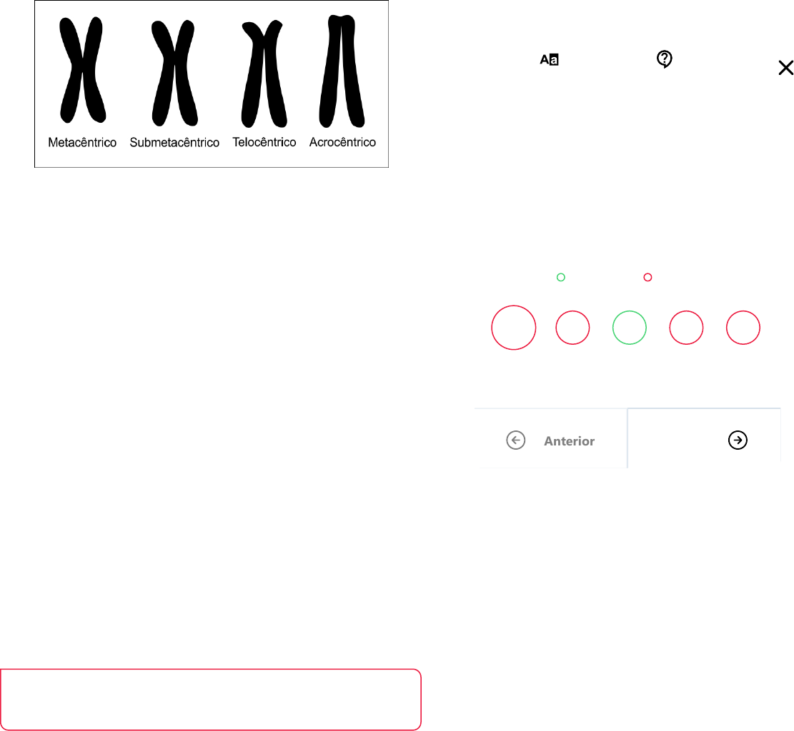 Os cromossomos metafásicos podem ser classificados em relação à posição do centrômero, que divide o cromossomo em dois braços cromossômicos. A razão entre os braços cromossômicos é utilizada para a descrição e classificação da sua morfologia. Baseando-se na morfologia cromossômicas, analise as sentenças a seguir. I- Cromossomos com morfologia metacêntrica possuem o centrômero terminal, dividindo os braços cromossômicos com tamanho diferentes. II- Cromossomos metacêntricos possuem o centrômero distribuído na posição central. III- Cromossomos submetacêntricos e telocêntricos possuem um braço cromossômico curto e outro longo. IV- Cromossomos acrocêntricos possuem centrômero terminal, com apenas um braço cromossômico. V- Cromossomos submetacêntricos possuem o centrômero distribuído centralmente distribuído com os braços cromossômicos de tamanho semelhantes. Assinale apenas a alternativa CORRETA sobre a posição do centrômero e a morfologia cromossômica. Apenas as alternativas II, III e V estão corretas. Sua resposta A morfologia cromossômica é estabelecida com base na posição do centrômero. Cromossomos metacêntricos possuem o centrômero na posição central dividindo cada cromátide em dois braços cromossômicos com Disciplina Genética Acertos 1 de 5 questões Nota 2 pontos Corretas Erradas 1 2 3 4 5 PróximaAnterior Questão 1 ErradaCorreção dos exercícios da unidade Tamanho da fonte Dúvidas ao tutor tamanhos semelhantes ou similares. Cromossomos submetacêntricos possuem o centrômero levemente distante da posição central, assim como os cromossomos telocêntricos, ambas as morfologias dividem o cromossomo em um braço curto e outro longo. Cromossomos acrocêntricos possuem o centrômero terminal acarretando em apenas um braço cromossômico.