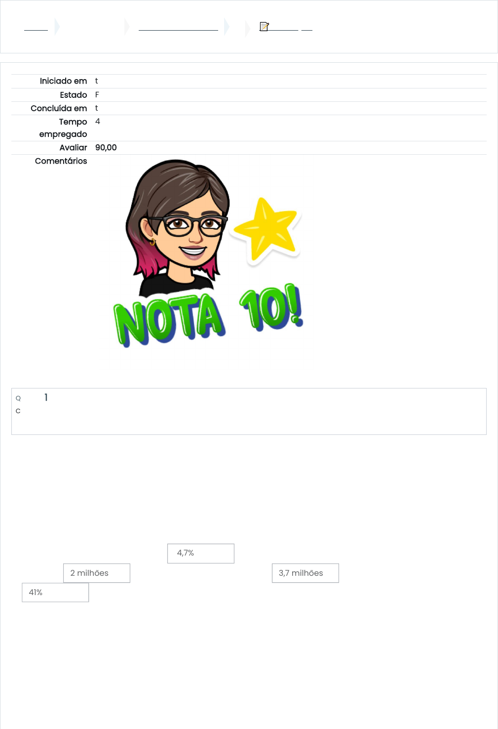 Painel Meus cursos 10152001-T01-2024-1 📝 Avaliação Iniciado em terça, 26 mar 2024, 20:15 Estado Finalizada Concluída em terça, 26 mar 2024, 20:59 Tempo empregado 44 minutos 7 segundos Avaliar 90,00 de um máximo de 100,00 Comentários Questão 1 Correto Atingiu 10,00 de 10,00 Os estudos de Mello (2023) analisam dados referentes ao panorama nacional da EaD no contexto brasileiro, demonstrando que nos últimos 10 anos, a Educação a Distância vem conquistando espaços na educação superior. De acordo com estes estudos, e observando o crescimento de matrículas em cursos de graduação no Brasil, complete os dados a seguir: 2011: a modalidade EaD representou de matrículas de graduação; 2018: a EaD ultrapassou a marca de de alunos; 2021: a EaD alcança , o que representa mais de dos alunos de graduação no país. 14,7% 2 milhões 3,7 milhões 41% https://ava.ufms.br/my/ https://ava.ufms.br/course/view.php?id=58288 https://ava.ufms.br/mod/quiz/view.php?id=801341 Questão 2 Correto Atingiu 10,00 de 10,00 Questão 3 Correto Atingiu 10,00 de 10,00 Os Referenciais de Qualidade para Educação Superior a Distância (2007) representam um importante conjunto de diretrizes e critérios estabelecidos para orientar e assegurar a qualidade dos cursos oferecidos nessa modalidade de ensino. Quais são as responsabilidades atribuídas aos tutores neste documento? Marque as alternativas que correspondem às respostas corretas. Obs.: Cada alternativa errada que for marcada anula a pontuação que seria recebida por uma alternativa correta. Escolha uma ou mais: a. Entre as responsabilidades do tutor não se inclui participar dos processos avaliativos de ensino- aprendizagem em conjunto com os docentes. b. Entre as responsabilidades do tutor inclui participar dos processos avaliativos de ensino- aprendizagem em conjunto com os docentes. c. O tutor a distância tem também a responsabilidade de promover espaços de construção coletiva de conhecimento, selecionar material de apoio e embasamento teórico aos conteúdos. d. É incumbência do tutor esclarecer dúvidas utilizando diferentes meios, tais como fóruns de discussão online, telefone e participação em videoconferências, conforme delineado no projeto pedagógico. Conforme Mello (2023) o papel do profissional tutor no contexto educacional é multifacetado, exigindo uma gama diversificada de habilidades e atribuições para garantir o sucesso do processo de aprendizagem dos alunos. A partir do que foi estudado no Módulo II, associe e complete as respostas: Responder em até 24 horas Ser mediador e Zelar pelo acompanhamento, Comentar, estimular e acompanhar constantemente Acompanhar os processos de ensino e Acompanhar os prazos e Respeitar as particularidades e Esclarecer dúvidas e sinalizar os questionamentos dos alunos. orientador das atividades de ensino; orientação e motivação dos alunos; as participações e atividades realizadas pelos alunos; aprendizagem; cumprimento de atividades; individualidades de cada aluno; as dificuldades mediante uma relação dialógica; Questão 4 Correto Atingiu 10,00 de 10,00 Questão 5 Correto Atingiu 10,00 de 10,00 Questão 6 Correto Atingiu 10,00 de 10,00 Questão 7 Incorreto Atingiu 0,00 de 10,00 De acordo com o percurso histórico da Educação a Distância, a segunda geração foi denominada Tele-Ensino. Escolha uma opção: Verdadeiro Falso Programa criado pelo MEC objetivando levar e disponibilizar computadores, recursos digitais e conteúdos educacionais para escolas da rede pública de educação básica brasileiras. Qual a sigla que representa este Programa? Resposta: PROINFO O Corpo Técnico-Administrativo tem a função oferecer o apoio necessário para a plena realização dos cursos ofertados, atuando na sede da instituição junto à equipe docente responsável pela gestão do curso e nos pólos descentralizados de apoio presencial. Escolha uma opção: Verdadeiro Falso A Portaria nº 2.117 de 6 de dezembro de 2019 dispõe sobre a oferta de carga horária na modalidade de Ensino a Distância - EaD em cursos de graduação presenciais ofertados por Instituições de Educação Superior - IES pertencentes ao Sistema Federal de Ensino. Escolha uma opção: Verdadeiro Falso Questão 8 Correto Atingiu 10,00 de 10,00 Questão 9 Correto Atingiu 10,00 de 10,00 Questão 10 Correto Atingiu 10,00 de 10,00 Conforme Belloni (2021) na EaD existe a necessidade de maior entre e com os estudantes utilizando do uso de técnicas de comunicação adequadas como , tutoria, , orientações sobre dúvidas, de atividades, para uso de tecnologias e entre outras. interação professores tutores apoio pedagógico aconselhamento feedback monitoria De acordo com os dados apresentados por Brasil (2022) constata-se que a maioria das instituições com cursos de graduação EaD e Pós-graduação EaD oferecem os seguintes recursos para atender as demandas dos alunos inclusos como: provas adaptadas, computadores com recursos de acessibilidade, lupas e lentes e na Pós- graduação o recursos diferenciado é o material em braile. Escolha uma opção: Verdadeiro Falso Associe cada geração a seguir com a sua caracterização. Modalidade de ensino oferecida totalmente pelo computador, informação disponibilizada na internet, e-learning assíncrono. Geração caracterizada pelas tecnologias de comunicação, abrange o uso de dispositivos móveis, telefones móveis e de computadores pessoais de tecnologia avançada. Disseminação da internet, uso recorrente do correio eletrônico, papel impresso, DVD, computador, Internet, sessões de chat e videoconferência. O uso de correspondência como meio principal de comunicação. Predominou a utilização de rádio, TV e telecursos. Caracterizada pelos mundos virtuais, a simulação do real, o ciberespaço, a inteligência artificial, robôs auxiliares de ensino, simuladores, realidade virtual (VR) e tecnologias de realidade aumentada (AR). Quarta Geração Quinta Geraç