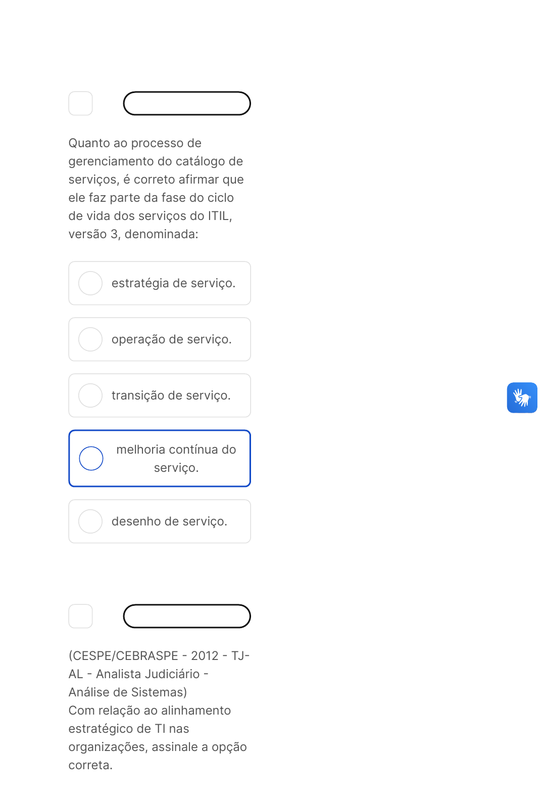29/03/2024, 11:43 estacio.saladeavaliacoes.com.br/prova/6606d19b97a79b335085a5c9/ https://estacio.saladeavaliacoes.com.br/prova/6606d19b97a79b335085a5c9/ 1/14 A B C D E 1 Marcar para revisão Quanto ao processo de gerenciamento do catálogo de serviços, é correto afirmar que ele faz parte da fase do ciclo de vida dos serviços do ITIL, versão 3, denominada: estratégia de serviço. operação de serviço. transição de serviço. melhoria contínua do serviço. desenho de serviço. 2 Marcar para revisão �CESPE/CEBRASPE � 2012 � TJ� AL � Analista Judiciário � Análise de Sistemas) Com relação ao alinhamento estratégico de TI nas organizações, assinale a opção correta. 29/03/2024, 11:43 estacio.saladeavaliacoes.com.br/prova/6606d19b97a79b335085a5c9/ https://estacio.saladeavaliacoes.com.br/prova/6606d19b97a79b335085a5c9/ 2/14 A B C A análise estratégica do negócio para TI é realizada mediante diversos procedimentos, entre os quais não se inclui a análise de planos táticos funcionais. O alinhamento estratégico compõe o plano estratégico de TI, em virtude de, neste plano, serem definidos os objetivos de negócio e as estratégias para atingi-los. A etapa de identificação dos fatores críticos de sucesso da empresa é fundamento para a análise estratégica do negócio da organização como um todo, mas não é base, contudo, para a elaboração da estratégia de TI. 29/03/2024, 11:43 estacio.saladeavaliacoes.com.br/prova/6606d19b97a79b335085a5c9/ https://estacio.saladeavaliacoes.com.br/prova/6606d19b97a79b335085a5c9/ 3/14 D E O planejamento estratégico da empresa causa impacto inexpressível no alinhamento estratégico da TI. Alinhamento dinâmico consiste no processo por meio do qual é alterada a estratégia de TI em função da ocorrência de uma mudança aleatória na estratégia de negócios da empresa. 3 Marcar para revisão �FCC � 2015 � Prefeitura de São Luís � MA � Auditor de Controle Interno � Área de Tecnologia da Informação �TI�� Uma equipe de Service Desk tem como algumas de suas atividades funcionais a monitoração da disponibilidade e desempenho da infraestrutura e realização de backup de dados de sistemas de aplicação, bem como o atendimento e a solução de incidentes relacionados à TI. Segundo a ITIL v3 atualizada em 2011 29/03/2024, 11:43 estacio.saladeavaliacoes.com.br/prova/6606d19b97a79b335085a5c9/ https://estacio.saladeavaliacoes.com.br/prova/6606d19b97a79b335085a5c9/ 4/14 A B C a monitoração da infraestrutura e o backup de dados de sistemas de aplicação são funções da gerência de operações, sendo funções do Service Desk o atendimento e a solução de incidentes de TI. a monitoração da infraestrutura é função da gerência de operações, o backup de dados de sistemas de aplicação é função da gerência técnica e o atendimento e a solução de incidentes de TI são funções do Service Desk. todas as atividades descritas são de responsabilidade fim a fim do Service Desk, estando adequadas à atribuição de funções. 29/03/2024, 11:43 estacio.saladeavaliacoes.com.br/prova/6606d19b97a79b335085a5c9/ https://estacio.saladeavaliacoes.com.br/prova/6606d19b97a79b335085a5c9/ 5/14 D E a monitoração da disponibilidade e desempenho da infraestrutura e o backup de dados de aplicações são de responsabilidade funcional do Service Desk, enquanto o atendimento e a solução de incidentes são de responsabilidade funcional da gerência técnica. todos os processos são de responsabilidade fim a fim da função de gerência de operações, em conjunto com a gerência técnica e não do Service Desk. 4 Marcar para revisão �FCC � 2010 � MPE � RN � Analista de Tecnologia da Informação � Suporte Técnico) No contexto da ITIL, são práticas que aumentam a eficiência de uma Central de Atendimento: I. A concentração de um maior número de funcionários no 1º Nível e um número menor nos níveis seguintes consiste na 29/03/2024, 11:43 estacio.saladeavaliacoes.com.br/prova/6606d19b97a79b335085a5c9/ https://estacio.saladeavaliacoes.com.br/prova/6606d19b97a79b335085a5c9/ 6/14 A B C separação da equipe de atendimento em grupos distintos, ordenados pelo grau de conhecimento, tendo como um dos objetivos a otimização do investimento na área de Central de Atendimento. II. O estabelecimento de Acordo de Nível de Serviço entre a Central de Serviços e os clientes, auxiliado por ferramentas apropriadas, além de estabelecer um padrão de atendimento, diminui substancialmente as ligações para saber se o problema já foi solucionado. III. Com uma base de conhecimento adequadamente mantida, resoluções de incidentes mais complexos podem se tornar mais simples de futura solução, por possibilitarem o escalonamento top-down e a agilidade na solução de erros conhecidos. Está correto o que se afirma em: II, apenas. II e III, apenas. I e II, apenas. 00 hora : 41 min : 44 seg Ocultar Questão 10 de 10 Respondidas �10� Em branco �0� Finalizar prova 1 2 3 4 5 6 7 8 9 10 Prova AV Entrega e Suporte Em Ti Sair 29/03/2024, 11:43 estacio.saladeavaliacoes.com.br/prova/6606d19b97a79b335085a5c9/ https://estacio.saladeavaliacoes.com.br/prova/6606d19b97a79b335085a5c9/ 7/14 D E I, apenas. I, II e III. 5 Marcar para revisão �MPE � PR / 2013� Observa-se uma necessidade atual e crescente das organizações nas suas ações cotidianas de detectarem quais são os stakeholders relevantes aos seus objetivos e, com isso, elaborar e gerenciá-los por meio de estratégias personalizadas. Sobre o tema, leia as sentenças e assinale a alternativa correta: I. A comunidade, o cliente, os fornecedores, os funcionários, o governo e os acionistas, apesar de não serem considerados stakeholders, devem estar alinhados e voltados para seus próprios objetivos e, ao mesmo tempo, para o objetivo comum da organização: o lucro e sua continuidade, sempre focando na capacidade de agregar valor. II. Stakehold