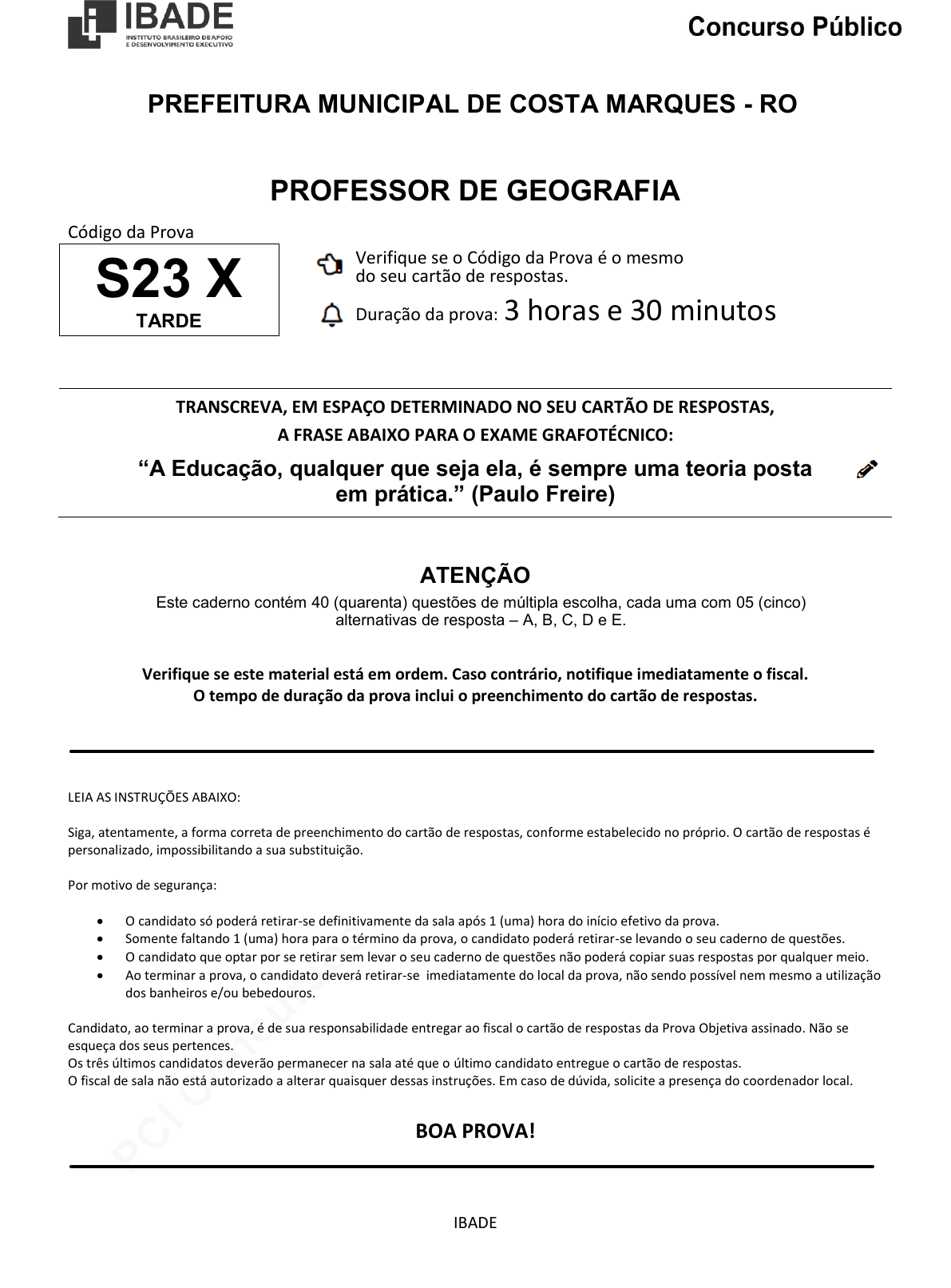 pcimarkpci MDAwMDowMDAwOjAwMDA6MDAwMDowMDAwOmZmZmY6YTg3OTpjYThm:RnJpLCAyOSBNYXIgMjAyNCAxMzowMDo1NCAtMDMwMA== www.pciconcursos.com.br IBADE PREFEITURA MUNICIPAL DE COSTA MARQUES - RO PROFESSOR DE GEOGRAFIA Código da Prova S23 X Verifique se o Código da Prova é o mesmo do seu cartão de respostas. Duração da prova: 3 horas e 30 minutos TARDE TRANSCREVA, EM ESPAÇO DETERMINADO NO SEU CARTÃO DE RESPOSTAS, A FRASE ABAIXO PARA O EXAME GRAFOTÉCNICO: “A Educação, qualquer que seja ela, é sempre uma teoria posta em prática.” (Paulo Freire) ATENÇÃO Este caderno contém 40 (quarenta) questões de múltipla escolha, cada uma com 05 (cinco) alternativas de resposta – A, B, C, D e E. Verifique se este material está em ordem. Caso contrário, notifique imediatamente o fiscal. O tempo de duração da prova inclui o preenchimento do cartão de respostas. LEIA AS INSTRUÇÕES ABAIXO: Siga, atentamente, a forma correta de preenchimento do cartão de respostas, conforme estabelecido no próprio. O cartão de respostas é personalizado, impossibilitando a sua substituição. Por motivo de segurança: O candidato só poderá retirar-se definitivamente da sala após 1 (uma) hora do início efetivo da prova. Somente faltando 1 (uma) hora para o término da prova, o candidato poderá retirar-se levando o seu caderno de questões. O candidato que optar por se retirar sem levar o seu caderno de questões não poderá copiar suas respostas por qualquer meio. Ao terminar a prova, o candidato deverá retirar-se imediatamente do local da prova, não sendo possível nem mesmo a utilização dos banheiros e/ou bebedouros. Candidato, ao terminar a prova, é de sua responsabilidade entregar ao fiscal o cartão de respostas da Prova Objetiva assinado. Não se esqueça dos seus pertences. Os três últimos candidatos deverão permanecer na sala até que o último candidato entregue o cartão de respostas. O fiscal de sala não está autorizado a alterar quaisquer dessas instruções. Em caso de dúvida, solicite a presença do coordenador local. BOA PROVA! pcimarkpci MDAwMDowMDAwOjAwMDA6MDAwMDowMDAwOmZmZmY6YTg3OTpjYThm:RnJpLCAyOSBNYXIgMjAyNCAxMzowMDo1NCAtMDMwMA== www.pciconcursos.com.br PREFEITURA MUNICIPAL DE COSTA MARQUES - RO IBADE Professor de Geografia Tipo X – Página 1 Língua Portuguesa TEXTO I A NOVA JUVENTUDE O que não falta é frase satirizando a primeira etapa da vida. Exemplo: A juventude é um defeito facilmente superável com a idade. Outro: A juventude é uma coisa maravilhosa, pena desperdiçá-la em jovens. Quem ultrapassou essa fase dourada hoje olha para ela com certo desprezo - Não de todo equivocado: a maturidade, de fato, se não é nosso período mais fértil, certamente é o mais sabido. Algum benefício tinha que haver nessa tal passagem do tempo. No entanto, em vez de fazer coro com a soberba habitual dos maduros, vale dar uma espiada mais generosa para a garotada. Afora os neorretardados que proliferam nas redes esbanjando pobreza de espírito, a geração atual tem uma postura mais humanizada em relação a questões importantes da vida. Vale a pena escutá-los. O tema da homossexualidade, ainda debatido à exaustão na mídia, já saiu de pauta entre os adolescentes. Nada mais natural do que meninos e meninas namorarem parceiros do mesmo sexo. Ser favorável ou desfavorável à causa gay? Concordo com eles: chega a ser constrangedor a gente se declarar a favor ou contra o que não nos diz respeito. É muita arrogância. Quanto à busca por uma profissão, mudanças visíveis também. O dinheiro continua sendo uma preocupação, mas já não ocupa o topo das paradas. O que se deseja é fazer diferença para a sociedade, trabalhar no que se gosta, personalizar sua atuação, deixar marcada uma ideia, uma consciência, um caminho diferente, um novo olhar. Nem que para isso se invente uma profissão que nunca existiu, que se formalizem atividades que antes não eram consideradas. O estudar segue fundamental, mas a sequência colégio-vestibular-faculdade vem ganhando bifurcações. Se a felicidade não estiver na vida sólida e estável que os pais sonharam, paciência. Os sonhos dos velhos terão que se adaptar a uma realidade menos regrada. Sim, ainda existem os adolescentes convencionais, que sonham com casamentos convencionais e empregos convencionais e que querem enriquecer, consumir e ser “alguém”. A diferença é que esse “alguém” padrão, que se amparava em hierarquias para estabelecer juízos de valor, não representa o jovem moderno que quer construir uma sociedade mais horizontalizada. A noção de riqueza está mudando de foco: ir para o trabalho de bicicleta pode dar mais status a um profissional do que conquistar uma vaga no estacionamento reservado aos patrões. Outro dia falava sobre tatuagens com duas garotas e me peguei aplicando o velho discurso a respeito do cuidado que elas deveriam ter antes de tomar decisões definitivas. Foi quando me dei conta de que até o definitivo mudou de configuração. Elas não veneram o “pra sempre” – o que acho ótimo, mas então por que fazer uma tatuagem? Simplesmente para homenagear uma etapa da vida. Não haverá arrependimento se o assunto não for levado com tanto drama. Tatuagem deixou de ser uma condecoração vitalícia. Nada mais é vitalício. Basta que seja sustentável. (O GLOBO, Marta Medeiros, 2013) Questão 1 De acordo com o gênero textual, o texto I é classificado como uma / um: (A) parábola. (B) apólogo. (C) crônica. (D) editorial. (E) conto. Questão 2 Sobre a linguagem utilizada no texto I, assinale a alternativa correta. (A) É um monólogo, a escritora fala com ela mesma (B) É totalmente impessoal, sem opinião da autora (C) É impessoal e objetiva (D) É coloquial, na busca de uma aproximação com o leitor (E) É predominantemente referencial Questão 3 Sobre a ideia principal do texto, assinale a alternativa correta. (A) As sátiras da juventude moderna (B) O desprezo da juvent