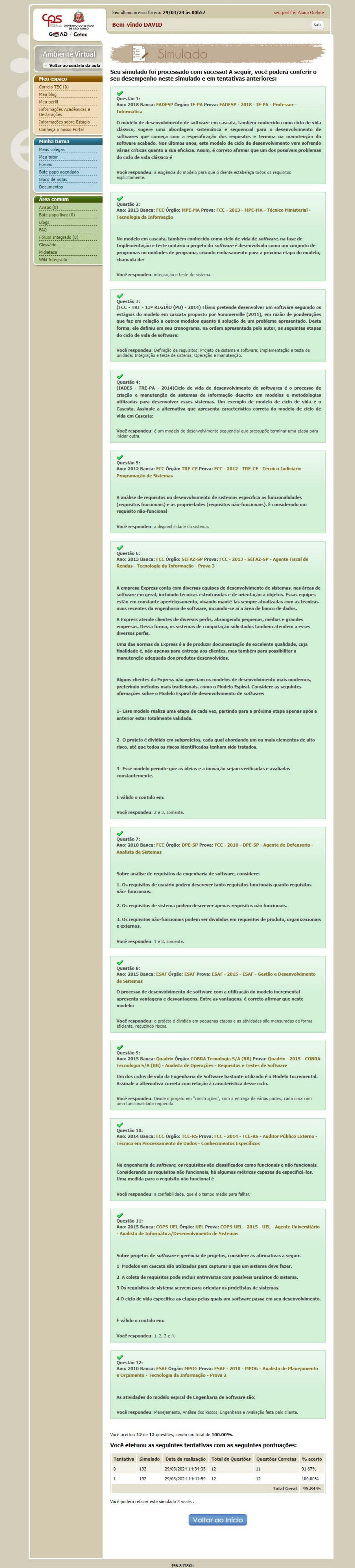 Meu espaçoCorreio TEC (0)Meu blogMeu perfilInformações Acadêmicas e DeclaraçõesInformações sobre EstágioConheça o nosso Portal Minha turma Meus colegasMeu tutorFórunsBate-papo agendadoBloco de notasDocumentos Área comumAvisos (0)Bate-papo livre (0)BlogsFAQFórum Integrado (0)GlossárioMidiatecaWiki Integrado Seu último acesso foi em: 29/03/24 às 00h57 seu perfil é: Aluno On-line Bem-vindo DAVID Questao 01 Ano: 2018 Banca: FADESP Órgão: IF-PA Prova: FADESP - 2018 - IF-PA - Professor - Informática O modelo de desenvolvimento de software em cascata, também conhecido como ciclo de vida clássico, sugere uma abordagem sistemática e sequencial para o desenvolvimento de softwares que começa com a especificação dos requisitos e termina na manutenção do software acabado. Nos últimos anos, este modelo de ciclo de desenvolvimento vem sofrendo várias críticas quanto a sua eficácia. Assim, é correto afirmar que um dos possíveis problemas do ciclo de vida clássico é a aplicação do modelo de forma incorreta a problemas com requisitos bem definidos e razoavelmente estáveis. a responsabilidade do levantamento das necessidades pela etapa de comunicação. a exigência do modelo para que o cliente estabeleça todos os requisitos explicitamente. a construção problemática dos componentes, caso o sistema não possa ser adequadamente modularizado. a existência de somente cinco etapas no modelo, da comunicação à implementação. Questao 02 Ano: 2013 Banca: FCC Órgão: MPE-MA Prova: FCC - 2013 - MPE-MA - Técnico Ministerial - Tecnologia da Informação No modelo em cascata, também conhecido como ciclo de vida de software, na fase de Implementação e teste unitário o projeto do software é desenvolvido como um conjunto de programas ou unidades de programa, criando embasamento para a próxima etapa do modelo, chamada de: projeto de sistema de software. integração e teste do sistema. desenvolvimento incremental. análise e definição de requisitos. operação e manutenção. https://eadtec.cps.sp.gov.br/correiotec.php https://eadtec.cps.sp.gov.br/blog.php https://eadtec.cps.sp.gov.br/blog.php https://eadtec.cps.sp.gov.br/meu_perfil.php https://eadtec.cps.sp.gov.br/aluno_informacoes_academicas.php https://eadtec.cps.sp.gov.br/aluno_informacoes_academicas.php https://eadtec.cps.sp.gov.br/aluno_informacoes_academicas.php https://portalgeead.cps.sp.gov.br/secretaria-academica/#1591640606979-c016983f-9dbd https://portalgeead.cps.sp.gov.br/secretaria-academica/#1591640606979-c016983f-9dbd https://portalgeead.cps.sp.gov.br/ https://eadtec.cps.sp.gov.br/colegas_list.php https://eadtec.cps.sp.gov.br/meu_tutor.php https://eadtec.cps.sp.gov.br/meu_tutor.php https://eadtec.cps.sp.gov.br/foruns.php https://eadtec.cps.sp.gov.br/bate_papo.php https://eadtec.cps.sp.gov.br/bate_papo.php https://eadtec.cps.sp.gov.br/bloco_de_notas.php https://eadtec.cps.sp.gov.br/bloco_de_notas.php https://eadtec.cps.sp.gov.br/documento.php https://eadtec.cps.sp.gov.br/avisos.php javascript:void(abreBatePapo(0)); javascript:void(abreBatePapo(0)); https://eadtec.cps.sp.gov.br/blog_list.php https://eadtec.cps.sp.gov.br/faq.php https://eadtec.cps.sp.gov.br/forum.php?id_tipo_forum=6 https://eadtec.cps.sp.gov.br/forum.php?id_tipo_forum=6 https://eadtec.cps.sp.gov.br/forum.php?id_tipo_forum=6 https://eadtec.cps.sp.gov.br/glossario.php https://eadtec.cps.sp.gov.br/midiateca.php https://eadtec.cps.sp.gov.br/wiki.php https://eadtec.cps.sp.gov.br/wiki.php https://www.qconcursos.com/questoes-de-concursos/bancas/fadesp https://www.qconcursos.com/questoes-de-concursos/institutos/if-pa https://www.qconcursos.com/questoes-de-concursos/provas/fadesp-2018-if-pa-professor-informatica https://www.qconcursos.com/questoes-de-concursos/provas/fadesp-2018-if-pa-professor-informatica https://www.qconcursos.com/questoes-de-concursos/bancas/fcc https://www.qconcursos.com/questoes-de-concursos/institutos/mpe-ma https://www.qconcursos.com/questoes-de-concursos/provas/fcc-2013-mpe-ma-tecnico-ministerial-tecnologia-da-informacao https://www.qconcursos.com/questoes-de-concursos/provas/fcc-2013-mpe-ma-tecnico-ministerial-tecnologia-da-informacao Questao 03 (FCC - TRT - 13ª REGIÃO (PB) - 2014) Flávio pretende desenvolver um software seguindo os estágios do modelo em cascata proposto por Sommerville (2011), em razão de ponderações que faz em relação a outros modelos quanto à solução de um problema apresentado. Desta forma, ele definiu em seu cronograma, na ordem apresentada pelo autor, as seguintes etapas do ciclo de vida de software: Definição de requisitos; Engenharia de requisitos; Integração e teste de sistema; Projeto de sistema e software; Implementação e teste de unidade; Operação e manutenção; Integração e teste de sistema. Projeto de sistema e software; Análise de requisitos; Engenharia de requisitos; Implantação; Testes de sistemas; Operação e manutenção. Projeto de sistema e software; Engenharia de software; Integração e teste de sistema; Análise de requisitos funcionais e técnicos; Operação e manutenção; Implementação e teste de unidade. Projeto de sistema e software; Definição de requisitos; Implementação e teste de unidade; Integração e teste de sistema; Operação e manutenção. Definição de requisitos; Projeto de sistema e software; Implementação e teste de unidade; Integração e teste de sistema; Operação e manutenção. Questao 04 (IADES - TRE-PA - 2014)Ciclo de vida de desenvolvimento de softwares é o processo de criação e manutenção de sistemas de informação descrito em modelos e metodologias utilizadas para desenvolver esses sistemas. Um exemplo de modelo de ciclo de vida é o Cascata. Assinale a alternativa que apresenta característica correta do modelo de ciclo de vida em Cascata: modelo criado por Barry Boehm em 1988, permite que as ideias e a inovação sejam verificadas e avaliadas constantemente. é um modelo de desenvolvimento sequencial que p
