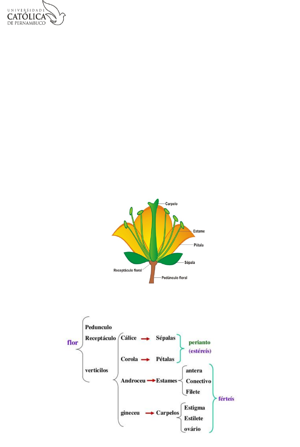 UNIVERSIDADE CATÓLICA DE PERNAMBUCO PRÓ-REITORIA ACADÊMICA CENTRO DE CIÊNCIAS BIOLÓGICAS E SAÚDE CURSO DE CIENCIAS BIOLÓGICAS MORFOLOGIA VEGETAL RESUMO CARACTERIZAÇÃO MORFOLOGICA DA FLOR Prof. Luiz Costa A flor é um eixo com folhas modificadas que, em conjunto, constituem o aparelho reprodutor sexual das plantas superiores (fanerógamas). Além disso, contribui na classificação das plantas (taxonomia) e tem grande importância medicinal, industrial, ornamental, etc. As partes que constituem as flores são chamadas de verticilos florais, divididos em internos e externos. Os externos são responsáveis pela proteção e/ou atrativos para polinizadores. São as sépalas (que juntas formam o cálice) e as pétalas (que juntas formam a corola). A flor que possui apenas sépalas ou apenas pétalas é chamada de monoclamídea. A flor que possui ambos os verticilos, sépalas e pétalas, é chamada de diclamídea. Se a flor for completamente nua, apenas com gineceu e/ou androceu, é denominada de aclamídea. Quando não é possível distinguir visualmente a diferença entre sépalas e pétalas, a flor é chamada de homoclamídea. E se for possível distinguir cálice de corola a flor é classificada como heteroclamídea. Os verticilos florais internos, ou reprodutivos, são divididos em androceu e gineceu. O androceu é o conjunto de estames que formam o verticilo reprodutor masculino. O gineceu é o conjunto de carpelos que formam o verticilo reprodutor feminino. Desenho esquemático de uma flor (Divisão Magnoliophyta). Carpelo (gineceu), estame (androceu), pétala, sépala, receptáculo floral, pedúnculo floral. PARTES DE UMA FLOR COMPLETA Observação: Quando falta algum dos verticilos, a flor é denominada incompleta CLASSIFICAÇAO QUANTO AOS ORGÃOS REPRODUTORES Flores Monóclinas ou Hermafroditas: possuem os dois sexos, androceu e gineceu. Ex.: cravo, laranjeira. Flores Díclina ou Unissexuada: possui apenas androceu ou gineceu. Ex.: abóbora, mamão. Observação: Quanto à presença dos verticilos de reprodução (androceu e gineceu), a flor pode ser considerada perfeita caso apresente os dois verticilos, e imperfeita, caso apresente apenas verticilo. A flor imperfeita pode ainda ser classificada como: Pistilada: apresenta apenas gineceu; Estaminada: apresenta apenas androceu. Observação: Plantas dióicas apresentam sexos separados em indivíduos diferentes. Um indivíduo produzirá somente flores masculinas e outro indivíduo produzirá somente flores femininas. Ex: mamão “macho”. Plantas monóicas são aquelas que apresentam ambos os sexos no mesmo indivíduo, porém em flores separadas. CLASSIFICAÇÃO DAS FLORES QUANTO ÀS SÉPALAS E PÉTALAS S é p a l a s - Geralmente de cor verde, formam o cálice da flor e nos estágios iniciais de desenvolvimento envolvem as outras estruturas do botão floral. Flor dialissépala: sépalas livres entre si. Ex: Lírio. Flor gamossépala: sépalas unidas entre si. Ex: Ipê de jardim. Flor dialipétala. Lírio. Gênero:Lilium, família Liliaceae. Flor gamopétala. Ipê de jardim. Espécie: Tecomastans. Família Bignoniaceae. Perianto: conjunto de sépalas e pétalas de uma flor. Perigônio: conjunto de tépalas. Quando não se podem distinguir as sépalas das pétalas (a não ser pela posição), chamamos tépala. P é t a l a s - Geralmente coloridas, localizam-se internamente ao cálice e formam a corola. Flor dialipétala (archiclamidea): quando as pétalas são livres entre si. Flor gamopétala (metaclamídea): quando as pétalas estão unidas entre si. Pentâmeras (5 ou múltiplo de 5 pétalas).Típicas de dicotiledôneas. http://www.biologados.com.br/fotos/plantas/flor_lirio_lilium_liliales_liliaceae_2.jpg http://www.biologados.com.br/fotos/plantas/flor_ipe_de_jardim_tecoma_stans_bignoniaceae_2.jpg http://www.biologados.com.br/fotos/plantas/flor_lirio_lilium_liliales_liliaceae_2.jp http://www.biologados.com.br/fotos/plantas/flor_ipe_de_jardim_tecoma_stans_bignoniaceae_2.jp C L A S S I F I C A Ç Ã O D A S F L O R E S Q U A N T O A O N Ú M E R O D E P É T A L A S Dímeras (2 pétalas) - Típicas de dicotiledôneas. Trímeras (3 ou múltiplo de 3 pétalas) - Típicas de monocotiledôneas. Tetrâmeras (4 ou múltiplo de 4 pétalas) - Típicas de dicotiledôneas. Flor tetrâmera. Hortência, gênero Hydrangea, família Hydrangeaceae. Flor pentâmera. F L O R E S D I C L A M Í D E A S , M O N O C L A M Í D E A S O U A C L A M Í D E A S Diclamídea: quando a flor é completa (sépalas, pétalas, androceu e gineceu). Monoclamídea: Quando um dos envoltórios externos (pétalas ou sépalas) está ausente. Aclamídea ou nua: quando a flor é formada apenas por estames ou ovário. Aclamídea ou nua Monoclamídea Diclamídea CLASSIFICAÇAO QUANTO A POSIÇÃO DO OVARIO Ínfero (ovário abaixo do plano do receptáculo). Semi-ínfero (ovário acima do plano do receptáculo, parcialmente envolto por ele, mas sem fusão). Súpero (ovário acima do plano do receptáculo). Esquema da estrutura de uma flor de ovário ínfero. Flor dímera. Flor trímera. Sisyrinchium micranthum, Família Iridaceae. Esquema da estrutura de uma flor de ovário semi-ínfero Esquema da estrutura de uma flor de ovário súpero. Se o ovário for súpero, a flor é denominada hipógina (na qual o ovário está posicionado acima do ponto de inserção de sépalas e pétalas) ou Se o ovário for ínfero, diz-se que a flor é epígina Se o ponto de inserção de sépalas e pétalas coincide com a região mediana do ovário, a flor é dita perígina. CLASSIFICAÇÃO DA FLOR QUANTO À DISPOSIÇÃO DAS PEÇAS FLORAIS Acíclicas ou espiraladas - quando as peças se dispõem helicoidalmente no receptáculo Ex. Magnolia spp. Cíclicas - quando as peças se dispõem em verticilos concêntricos (forma mais comum) CLASSIFICAÇAO QUANTO À SIMETRIA As flores podem ser representadas por fórmulas florais ou por diagramas florais. As fórmulas florais indicam o número de pe