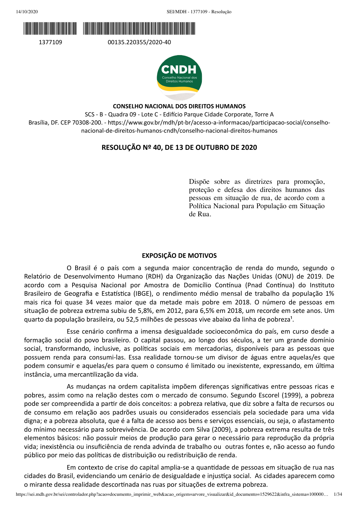 14/10/2020 SEI/MDH - 1377109 - Resolução https://sei.mdh.gov.br/sei/controlador.php?acao=documento_imprimir_web&acao_origem=arvore_visualizar&id_documento=1529622&infra_sistema=100000… 1/34 1377109 00135.220355/2020-40 CONSELHO NACIONAL DOS DIREITOS HUMANOS SCS - B - Quadra 09 - Lote C - Edicio Parque Cidade Corporate, Torre A Brasília, DF. CEP 70308-200. - hps://www.gov.br/mdh/pt-br/acesso-a-informacao/parcipacao-social/conselho- nacional-de-direitos-humanos-cndh/conselho-nacional-direitos-humanos RESOLUÇÃO Nº 40, DE 13 DE OUTUBRO DE 2020 Dispõe sobre as diretrizes para promoção, proteção e defesa dos direitos humanos das pessoas em situação de rua, de acordo com a Política Nacional para População em Situação de Rua. EXPOSIÇÃO DE MOTIVOS O Brasil é o país com a segunda maior concentração de renda do mundo, segundo o Relatório de Desenvolvimento Humano (RDH) da Organização das Nações Unidas (ONU) de 2019. De acordo com a Pesquisa Nacional por Amostra de Domicílio Connua (Pnad Connua) do Instuto Brasileiro de Geograa e Estasca (IBGE), o rendimento médio mensal de trabalho da população 1% mais rica foi quase 34 vezes maior que da metade mais pobre em 2018. O número de pessoas em situação de pobreza extrema subiu de 5,8%, em 2012, para 6,5% em 2018, um recorde em sete anos. Um quarto da população brasileira, ou 52,5 milhões de pessoas vive abaixo da linha de pobreza¹. Esse cenário conrma a imensa desigualdade socioeconômica do país, em curso desde a formação social do povo brasileiro. O capital passou, ao longo dos séculos, a ter um grande domínio social, transformando, inclusive, as polícas sociais em mercadorias, disponíveis para as pessoas que possuem renda para consumi-las. Essa realidade tornou-se um divisor de águas entre aquelas/es que podem consumir e aquelas/es para quem o consumo é limitado ou inexistente, expressando, em úlma instância, uma mercanlização da vida. As mudanças na ordem capitalista impõem diferenças signicavas entre pessoas ricas e pobres, assim como na relação destes com o mercado de consumo. Segundo Escorel (1999), a pobreza pode ser compreendida a parr de dois conceitos: a pobreza relava, que diz sobre a falta de recursos ou de consumo em relação aos padrões usuais ou considerados essenciais pela sociedade para uma vida digna; e a pobreza absoluta, que é a falta de acesso aos bens e serviços essenciais, ou seja, o afastamento do mínimo necessário para sobrevivência. De acordo com Silva (2009), a pobreza extrema resulta de três elementos básicos: não possuir meios de produção para gerar o necessário para reprodução da própria vida; inexistência ou insuciência de renda advinda de trabalho ou outras fontes e, não acesso ao fundo público por meio das polícas de distribuição ou redistribuição de renda. Em contexto de crise do capital amplia-se a quandade de pessoas em situação de rua nas cidades do Brasil, evidenciando um cenário de desigualdade e injusça social. As cidades aparecem como o mirante dessa realidade descornada nas ruas por situações de extrema pobreza. 14/10/2020 SEI/MDH - 1377109 - Resolução https://sei.mdh.gov.br/sei/controlador.php?acao=documento_imprimir_web&acao_origem=arvore_visualizar&id_documento=1529622&infra_sistema=100000… 2/34 O Decreto Presidencial nº 7.053, de 23 de dezembro de 2009, em parágrafo único do argo primeiro, dene as pessoas em situação de rua, em linhas gerais, como “o grupo populacional heterogêneo que possui em comum a pobreza extrema, os vínculos familiares interrompidos ou fragilizados e a inexistência de moradia convencional regular e que uliza os logradouros públicos e as áreas degradadas como espaço de moradia e de sustento, de forma temporária ou permanente, bem como as unidades de acolhimento para pernoite temporário ou como moradia provisória. Esta denição expressa o não acesso desta população aos direitos. A aversão ao pobre, denida por Adela Corna (2017) como “aporofobia”, revela o olhar da sociedade capitalista que, ofuscada pelo consumo e medo da “pobreza”, prefere escamotear as causas principais da pobreza no mundo e negar o direito à dignidade por parte de todas as pessoas humanas, independentemente de sua condição socioeconômica. A formação social do povo brasileiro também é permeada pelo racismo estrutural, por conta da herança escravocrata que persiste e se manifesta em vários processos sociohistóricos e culturais. Marcas da escravidão do Brasil Colônia ainda compõem a atualidade, como a visão de que os negros escravizados eram e seus descendentes são perigosos, inferiores, diferentes da elite dominante. A escravidão dos seres humanos rerados compulsoriamente do connente africano e a divisão racial entre brancos e negros, acarretou tanto a chaga do racismo, quanto do preconceito e da discriminação racial. Até os dias de hoje as desigualdades sociais – notadamente as de renda e, principalmente, a de oportunidades, têm na diferenciação racial sua principal causa. O processo sociohistórico que permeia a situação de rua não pode ser ignorado pela óca da formulação de polícas públicas. Após a abolição da escravatura, não foi desnada à população ex- escravizada quaisquer meios de reparação ou assistência em decorrência do trabalho forçoso e degradação da dignidade humana. O Estado brasileiro adotou uma postura de completa omissão e descaso em relação aos negros alforriados, substuindo a exnta mão de obra escrava pela força de trabalho europeia, por meio de reserva de vagas e garana de permanência no Brasil. Devido a isso, os negros foram colocados à margem da sociedade, restando-lhes escassas alternavas de restuir a vida, como: os empregos precarizados; as moradias irregulares nos grandes centros que deram origem às favelas; o encarceramento e o uso das ruas como meio de moradia, trabalho e sobrevivência. Desta forma, a constuição 