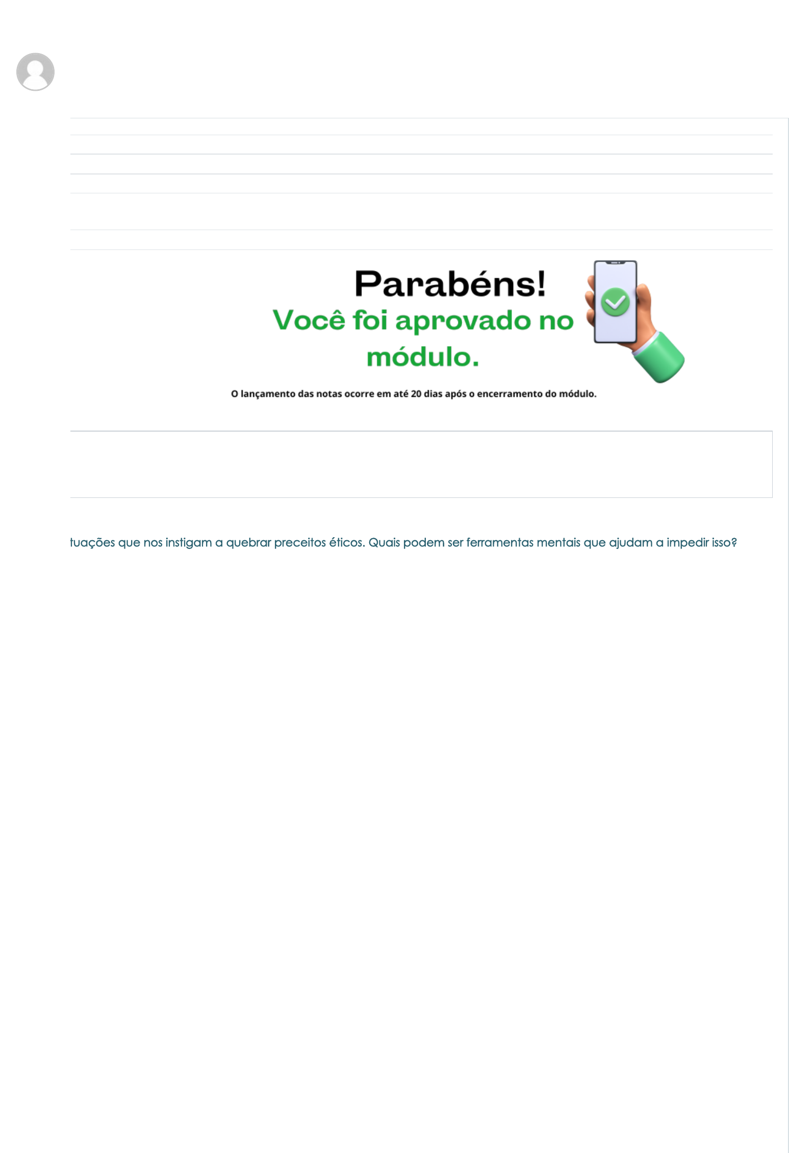 30/03/2024, 12:53 Questionário avaliativo: Revisão da tentativa https://ead.ipog.edu.br/moodle/mod/quiz/review.php?attempt=802542&cmid=1314279 1/5 Iniciado em terça, 16 jan 2024, 13:55 Estado Finalizada Concluída em terça, 16 jan 2024, 14:04 Tempo empregado 9 minutos 7 segundos Nota final 8,00 de um máximo de 10,00(80%) Comentários Questão 1 Correto Atingiu 1,00 de 1,00 Há situações que nos instigam a quebrar preceitos éticos. Quais podem ser ferramentas mentais que ajudam a impedir isso? Escolha uma opção: a. Pensar e reler código de conduta da organização b. Refletir sobre o que a pessoa que admiramos ou amamos faria ou entenderia dos nossos comportamentos c. Imaginar como seria a matéria publicada em alguma mídia após a negociação d. Fazer apenas aquilo de positivo que outras pessoas também fariam e. Todas as anteriores Sua resposta está correta. A resposta correta é: Todas as anteriores JENIFFER TOR… PORTAL DO ALUNO PÁGINA INICIAL CALENDÁRIO https://ead.ipog.edu.br/moodle/ https://ead.ipog.edu.br/moodle/user/view.php?id=151903&course=123496 https://ead.ipog.edu.br/moodle/user/view.php?id=151903&course=123496 https://ead.ipog.edu.br/moodle/user/view.php?id=151903&course=123496 https://ead.ipog.edu.br/moodle/user/view.php?id=151903&course=123496 https://ead.ipog.edu.br/moodle/user/view.php?id=151903&course=123496 https://ead.ipog.edu.br/moodle/user/view.php?id=151903&course=123496 https://portaldoaluno.ipog.edu.br/ https://ead.ipog.edu.br/moodle https://ead.ipog.edu.br/moodle/calendar/view.php?view=month 30/03/2024, 12:53 Questionário avaliativo: Revisão da tentativa https://ead.ipog.edu.br/moodle/mod/quiz/review.php?attempt=802542&cmid=1314279 2/5 Questão 2 Incorreto Atingiu 0,00 de 1,00 Questão 3 Correto Atingiu 1,00 de 1,00 A estratégia ganhar-ganhar tem suas principais vantagens, pois… Escolha uma opção: a. … resolve o problema, através do interesse pela fraqueza mútua b. …resolve o problema mútuo, através de interesse pela situação c. …resolve a situação, através de franqueza e interesse mútuo d. …previne a situação de se repetir, porque há franqueza constante e. …consolida a confiança mútua, perante demonstração de fraqueza Sua resposta está incorreta. A resposta correta é: …resolve a situação, através de franqueza e interesse mútuo De fato, conflitos fazem parte da nossa história. Mas segundo Bush e Folger podemos mudar o cenário, com o que chamam de Mediação Transformadora. Seus pressupostos são: Escolha uma opção: a. Mediação Transformadora funciona sobre os pilares de “empoderamento” e “reconhecimento”. b. Mediação Transformadora é Comunicação Não Violenta c. Com Comunicação Não Violenta é possível transformar o mundo d. Todas as anteriores e. Nenhuma das anteriores Sua resposta está correta. A resposta correta é: Mediação Transformadora funciona sobre os pilares de “empoderamento” e “reconhecimento”. JENIFFER TOR… PORTAL DO ALUNO PÁGINA INICIAL CALENDÁRIO https://ead.ipog.edu.br/moodle/user/view.php?id=151903&course=123496 https://ead.ipog.edu.br/moodle/user/view.php?id=151903&course=123496 https://ead.ipog.edu.br/moodle/user/view.php?id=151903&course=123496 https://ead.ipog.edu.br/moodle/user/view.php?id=151903&course=123496 https://ead.ipog.edu.br/moodle/user/view.php?id=151903&course=123496 https://ead.ipog.edu.br/moodle/user/view.php?id=151903&course=123496 https://portaldoaluno.ipog.edu.br/ https://ead.ipog.edu.br/moodle https://ead.ipog.edu.br/moodle/calendar/view.php?view=month 30/03/2024, 12:53 Questionário avaliativo: Revisão da tentativa https://ead.ipog.edu.br/moodle/mod/quiz/review.php?attempt=802542&cmid=1314279 3/5 Questão 4 Correto Atingiu 1,00 de 1,00 Questão 5 Correto Atingiu 1,00 de 1,00 Questão 6 Correto Atingiu 1,00 de 1,00 Sempre que houver um mediador, ele deve… Escolha uma opção: a. …receber da mesma forma a opinião de todos, sejam os mais eruditos ou os mais inexperientes b. …encorajar a participação dos envolvidos sem causar medo ou alienação c. …ser veraz e polido em simultâneo d. …ajudar todos a compreenderem que o foco da mediação está nas ideias e não nas pessoas e. Todas as anteriores Sua resposta está correta. A resposta correta é: Todas as anteriores O último elemento da Comunicação Não-Violenta, sem o qual nada funcionaria é: Escolha uma opção: a. Feedback b. Informação dos desejos c. Pedido d. Firmar o acordo e. Todas as anteriores são possíveis Sua resposta está correta. A resposta correta é: Pedido Alguns conflitos podem ser categorizados como sendo: Escolha uma opção: a. ganhar-ganhar e perder-perder b. ganhar-perder e atração-repulsão c. repulsão-repulsão e evitamento d. evitamento e atração-atração e. intrapessoais e interpessoais Sua resposta está correta. A resposta correta é: intrapessoais e interpessoais JENIFFER TOR… PORTAL DO ALUNO PÁGINA INICIAL CALENDÁRIO https://ead.ipog.edu.br/moodle/user/view.php?id=151903&course=123496 https://ead.ipog.edu.br/moodle/user/view.php?id=151903&course=123496 https://ead.ipog.edu.br/moodle/user/view.php?id=151903&course=123496 https://ead.ipog.edu.br/moodle/user/view.php?id=151903&course=123496 https://ead.ipog.edu.br/moodle/user/view.php?id=151903&course=123496 https://ead.ipog.edu.br/moodle/user/view.php?id=151903&course=123496 https://portaldoaluno.ipog.edu.br/ https://ead.ipog.edu.br/moodle https://ead.ipog.edu.br/moodle/calendar/view.php?view=month 30/03/2024, 12:53 Questionário avaliativo: Revisão da tentativa https://ead.ipog.edu.br/moodle/mod/quiz/review.php?attempt=802542&cmid=1314279 4/5 Questão 7 Correto Atingiu 1,00 de 1,00 Questão 8 Correto Atingiu 1,00 de 1,00 Questão 9 Correto Atingiu 1,00 de 1,00 O que é mais importante numa negociação? Escolha uma opção: a. Preparar o cenário, as cadeiras, e memorizar possíveis falas b. Isolar situações que não podem ser resolvidas por ninguém e focar nelas c