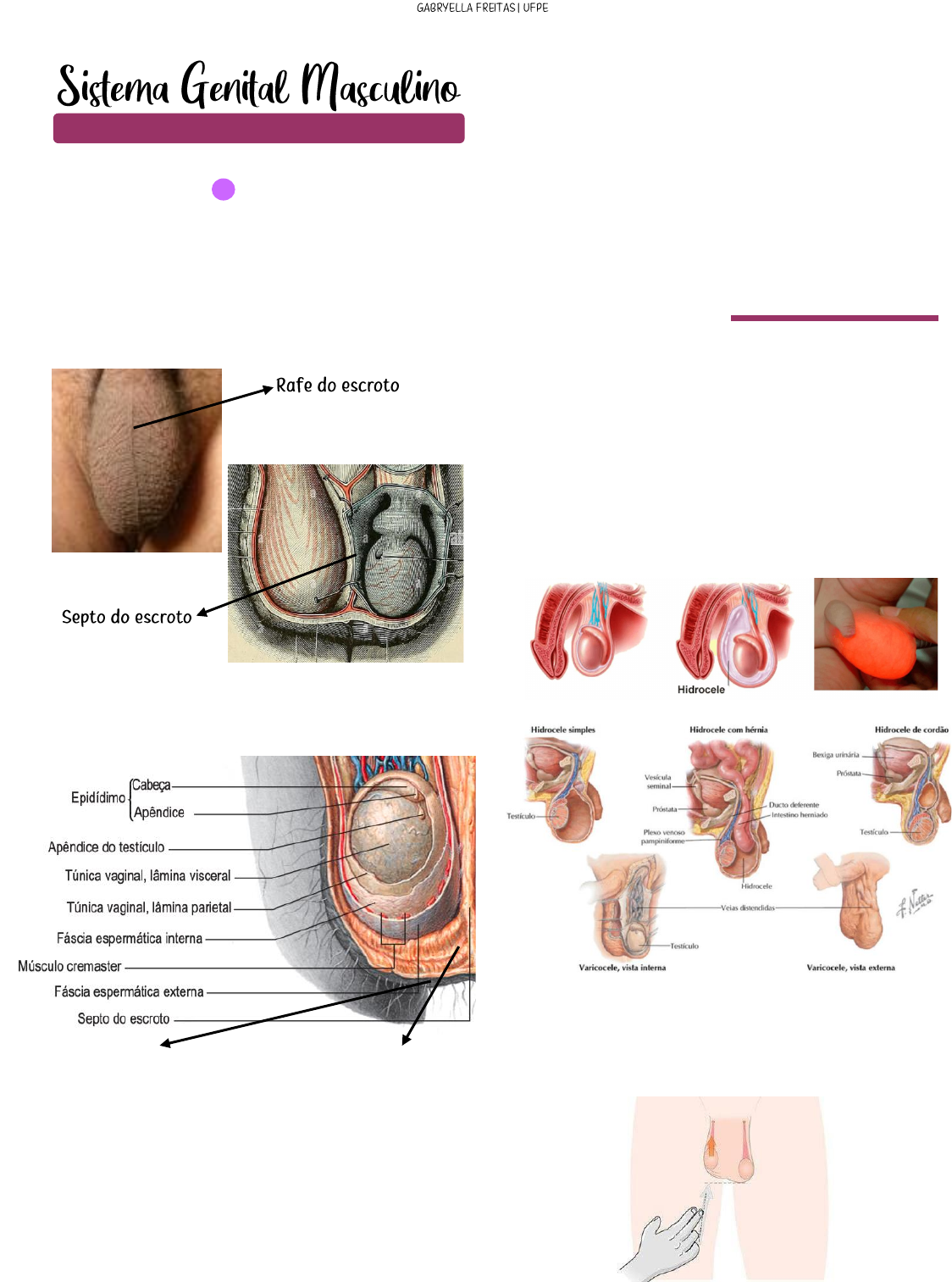 Escroto Bolsa músculo-cutânea, formato oval, órgão ímpar e termorregulador. Possui uma divisão interna e uma externa. Externamente, é dividido pela rafe do escroto, uma linha rugosa. Internamente, é dividido por uma parede de mucosa chamada de septo do escroto. É constituído por 7 camadas: • 1ª Pele: camada mais externa; • 2ª Túnica dartos, M. dartos: fixado a pele (o que torna a pele rugosa); • 3ª Fáscia espermática externa: resquícios de músculos vindos do abdome; • 4ª Fáscia cremastérica, M. cremaster: feixes longitudinais (contrai e relaxa, o que torna o escroto um órgão termorregulador) • 5ª Fáscia espermática interna: resquícios de músculos vindos do abdome; Última túnica do escroto, mas por ser serosa apresenta 2 lâminas: • 6ª Túnica vaginal do testículo, lâmina parietal: toca a parede da fáscia espermática interna; • 7ª Túnica vaginal do testículo, lâmina visceral: toca o testículo Entre as duas túnicas há um espaço virtual, dentro desse espaço há presença de líquido para evitar o atrito entre as lâminas Anatomia Aplicada à Clínica o acumulo de líquido dentro do escroto envolvendo o testículo (entre as lâminas parietal e visceral da túnica vaginal). A hidrocele pode ser causada por processos inflamatórios dos próprios testículos ou de estruturas vizinhas ou por traumatismos, obstruções dos vasos linfáticos ou tumores. A técnica de transiluminação (exame do interior de uma cavidade natural do corpo mediante uma forte luz que a ilumina por dentro e passa através de suas paredes) serve para detectar a hidrocele. Reflexo Cremastérico Contração do músculo cremáster e elevação do testículo ipsilateral após estímulo da face medial da coxa. O nervo genitofemoral é responsável por esse reflexo. Escroto e Pênis Pele Túnica dartos,Músculo dartos Irrigação: • A. cremastérica; • A. do ducto deferente; • A. Testicular Drenagem: • V. Testicular; • Plexo Pampiniforme; Pênis Órgão externo localizado no períneo anterior, em frente à sínfise púbica e ao escroto, formato cilíndrico quando flácido e prismático quando ereto, devido aos corpos cavernosos e esponjoso Divisão • Raiz do pênis: interna • Corpo do pênis: externo Raiz e corpo são formados por três estruturas eretas: Dorso do Pênis • Pele: fina, desprovida de pelos; • Fáscia do pênis: “segura” o pênis durante a ereção • Túnica albugínea: envolve cada corpo cavernoso e o corpo esponjoso; • Septo do pênis: sulco entre os corpos cavernosos • Glande: porção final do corpo esponjoso; dilatada; • Coroa da glande: parte mais dilatada da glande; • Colo da glande: porção mais estreita, possui glandulas sebáceas • Prepúcio: pele retrátil que encobre a cabeça do pênis (glande). • Óstio uretral externo: por onde sai o sêmen e a urina • Frênulo: prega cutânea na face uretral Anatomia Aplicada à Clínica Hipospádia: consiste em uma malformação genética que ocorre nos meninos, tendo como principal característica a abertura anormal da uretra, em um local abaixo do pênis, ou em outros locais, como no escroto ou no períneo, ao invés do local natural: na ponta (extremidade da glande). Raiz do pênis Bulbo do Pênis Ramos do pênis Corpo esponjoso 1 Corpos cavernosos 2 C or po d o pê ni s Corpos cavernosos Corpo esponjoso Pele Tecido subcutâneo Septo do pênis Fáscia do pênis Túnica albugínea Face uretral (dentro do corpo esponjoso) Vascularização • 1. Veia dorsal superficial do pênis • 2. Veia dorsal profunda do pênis (dentro da fáscia) • 3. Artéria dorsal do pênis • 4. Artéria dorsal profunda do pênis (dentro da fáscia) Uretra 1 S U P E R F I C I A L 2 S U P E R F I C I A L 3 3 S U P E R F I C I A L 4